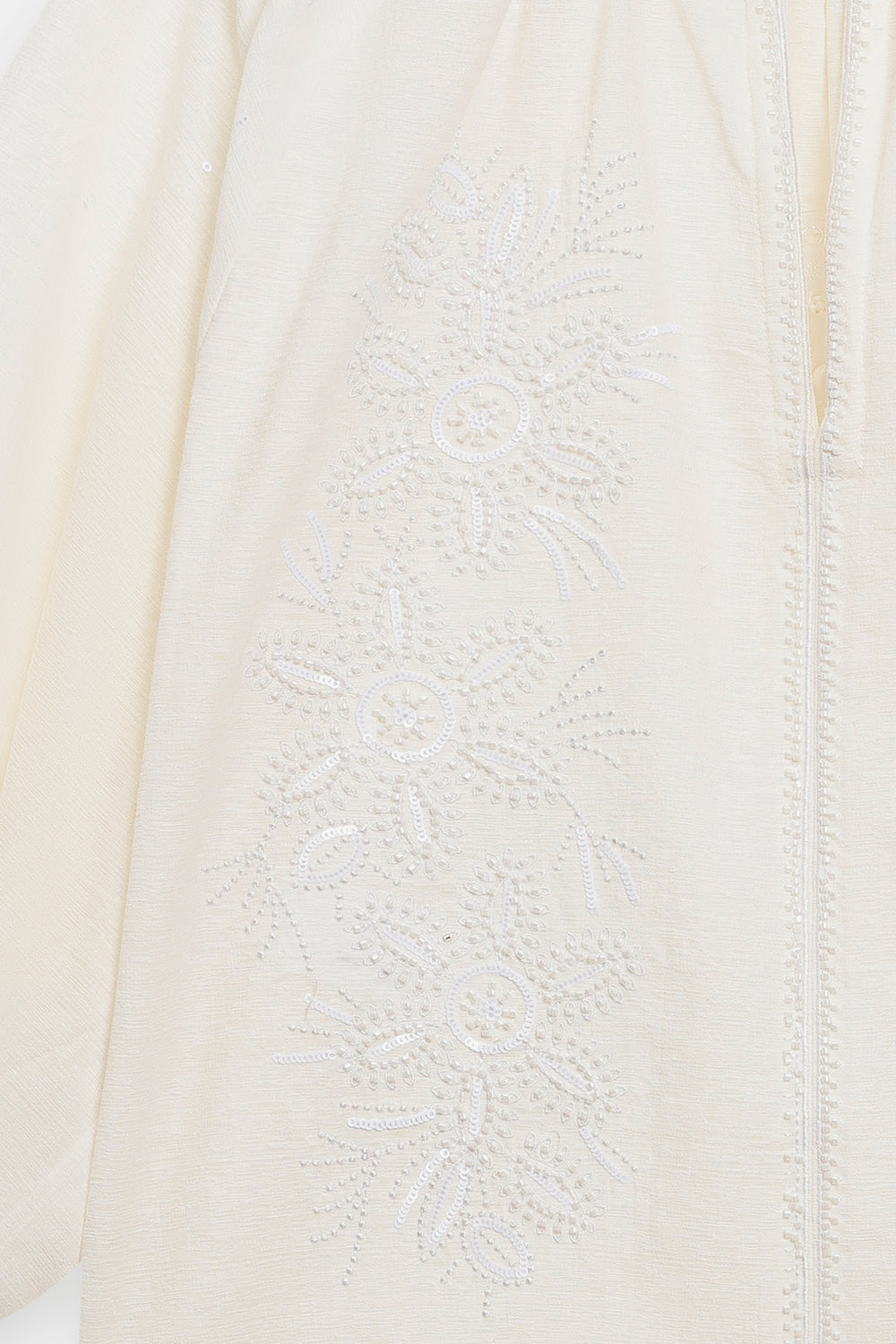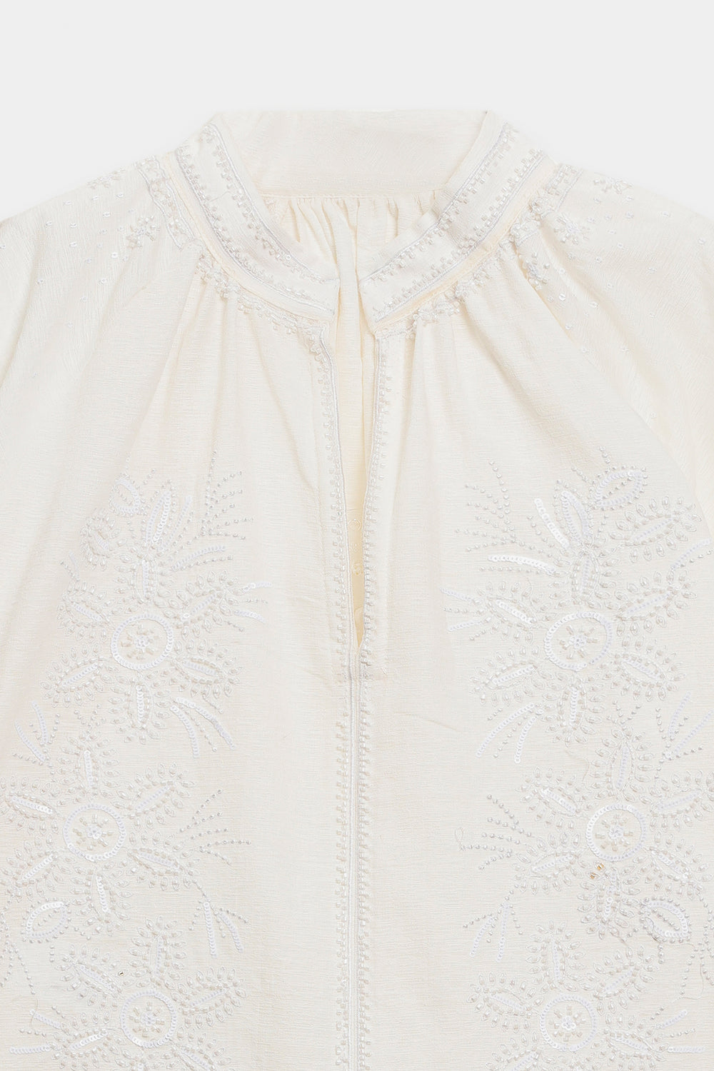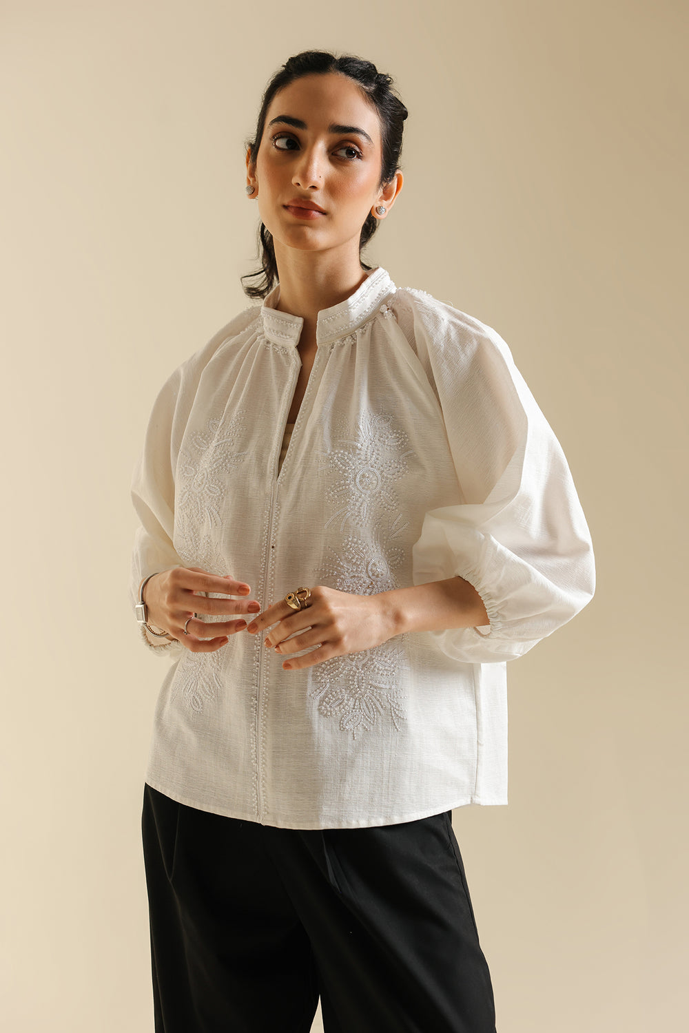 Project fresh, feminine charm with this beautifully textured embroidered top. This short, comfortable shirt is crafted from a crisp white fabric that features subtle tone-on-tone self-embroidery across the body. The key detail is the delicate white floral embroidery clustered around the smocked high collar and yoke. It features comfortable, three-quarter puff sleeves gathered at the cuff, adding a touch of volume and soft movement. Effortlessly styled with wide black trouser, this top is a perfect blend of comfort, clean color, and intricate textural detail.