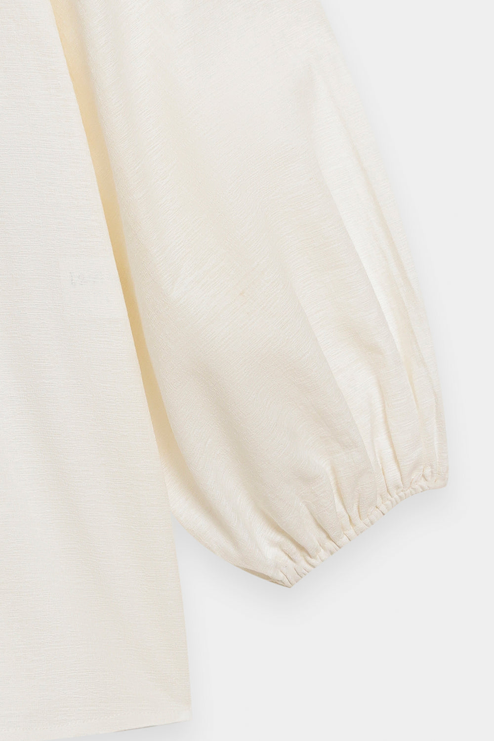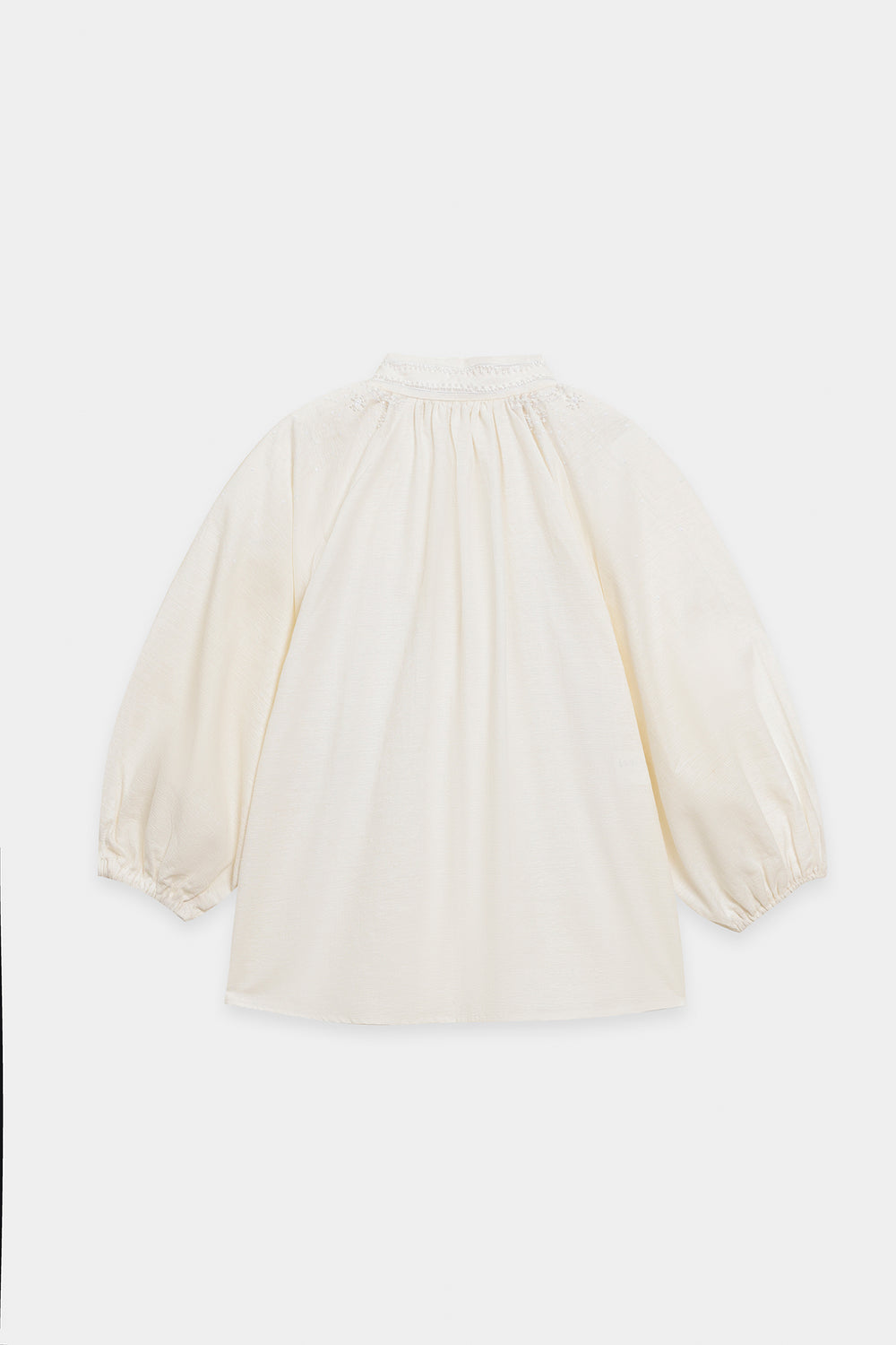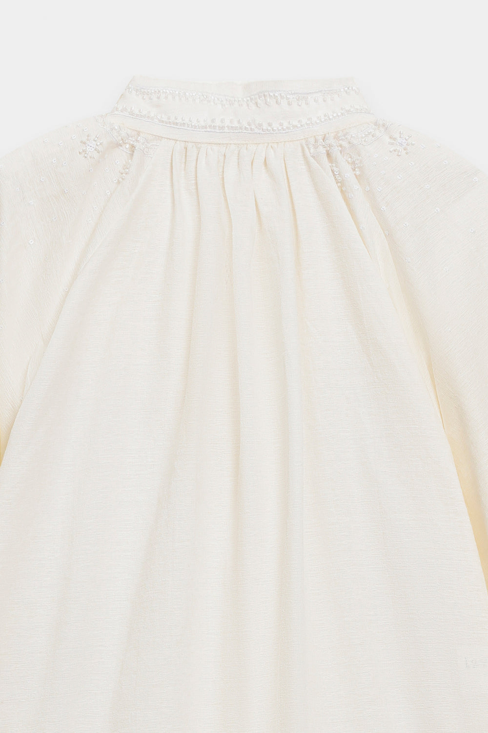 Project fresh, feminine charm with this beautifully textured embroidered top. This short, comfortable shirt is crafted from a crisp white fabric that features subtle tone-on-tone self-embroidery across the body. The key detail is the delicate white floral embroidery clustered around the smocked high collar and yoke. It features comfortable, three-quarter puff sleeves gathered at the cuff, adding a touch of volume and soft movement. Effortlessly styled with wide black trouser, this top is a perfect blend of comfort, clean color, and intricate textural detail.