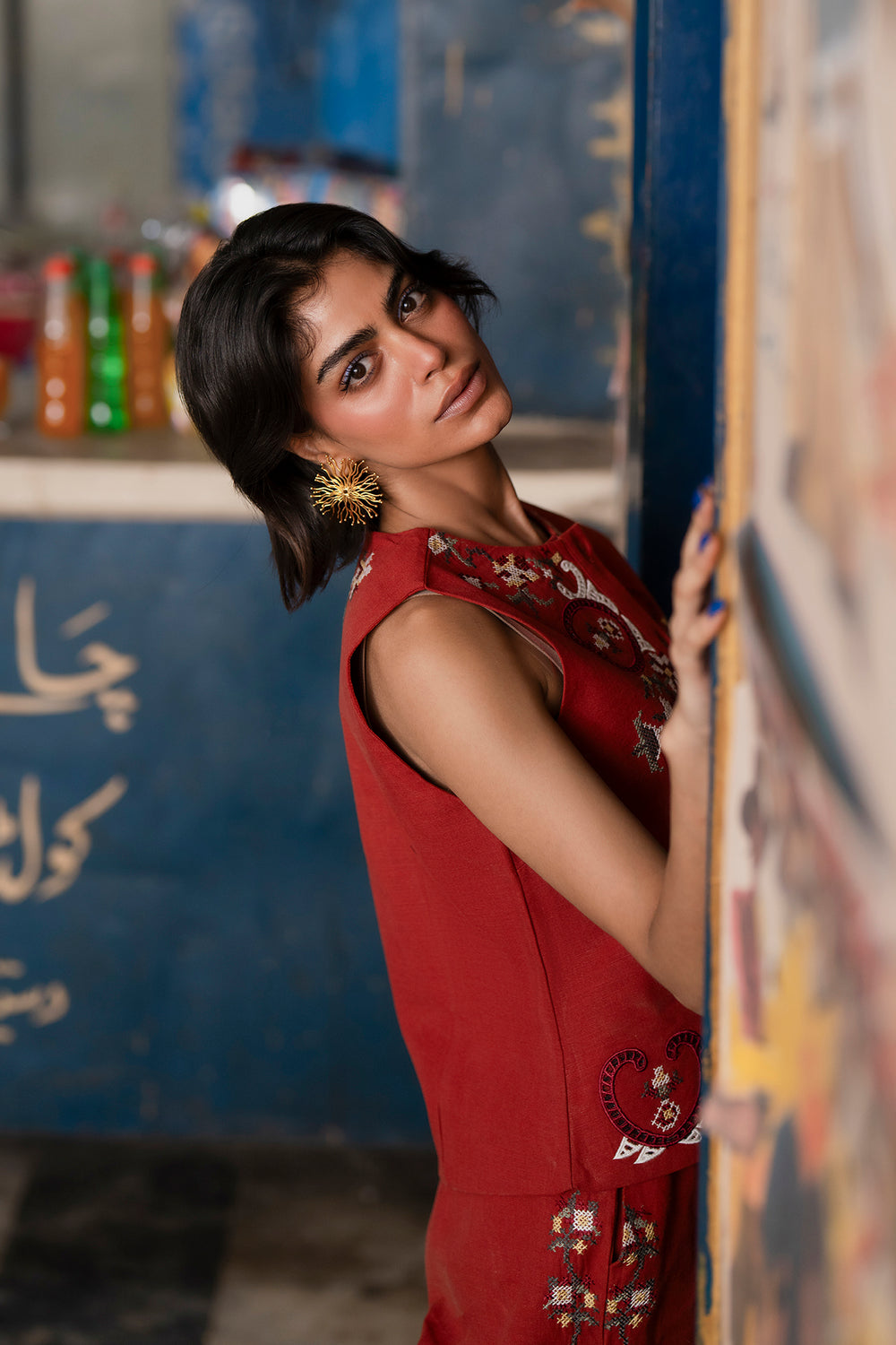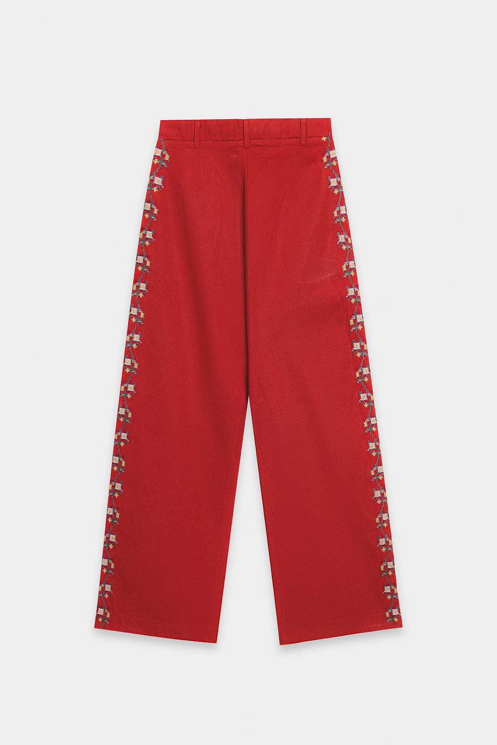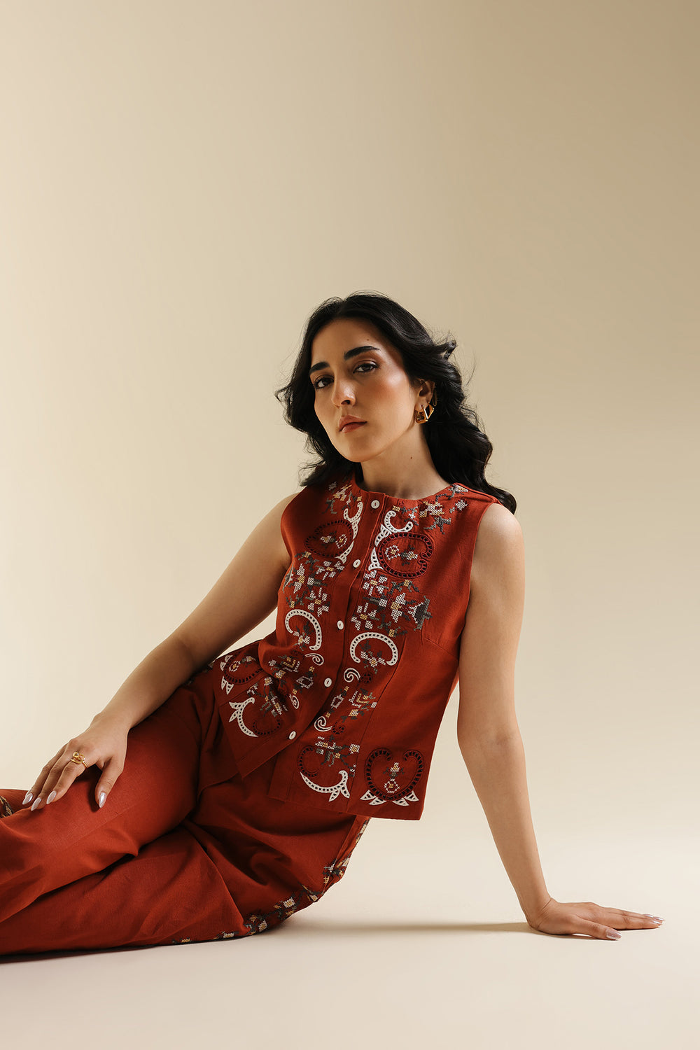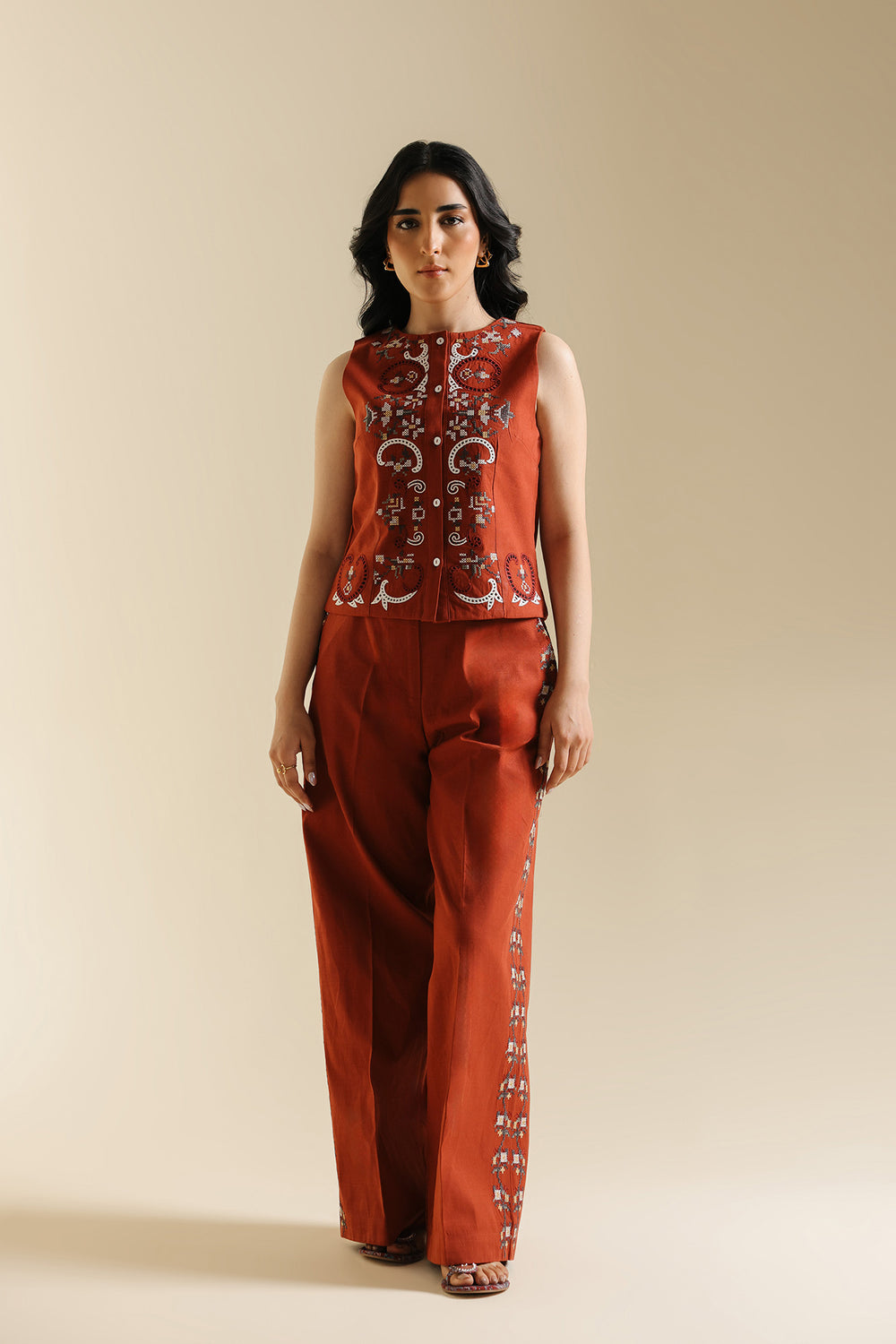 Radiate fiery elegance in this striking embroidered suit. This distinctive two-piece ensemble features a sleeveless waistcoat-style top and matching wide-leg trouser, both crafted from a rich, textured terra cotta fabric. The short top is beautifully detailed with ornate white, black, and red thread embroidery across the yoke and front panels. The wide-leg trouser feature coordinating embroidery and subtle metallic embellishments down the outer seams. This suit is a bold and sophisticated statement, showcasing rich color and intricate craftsmanship in a contemporary silhouette.