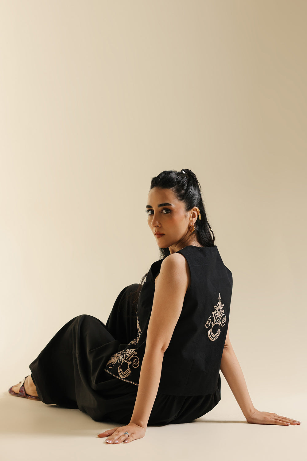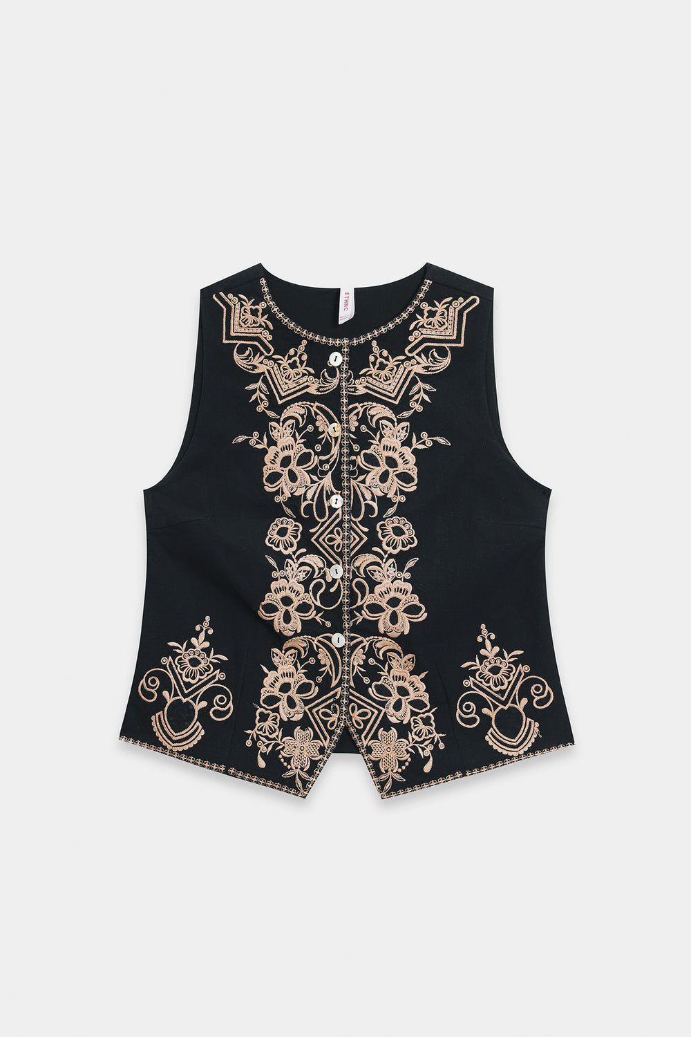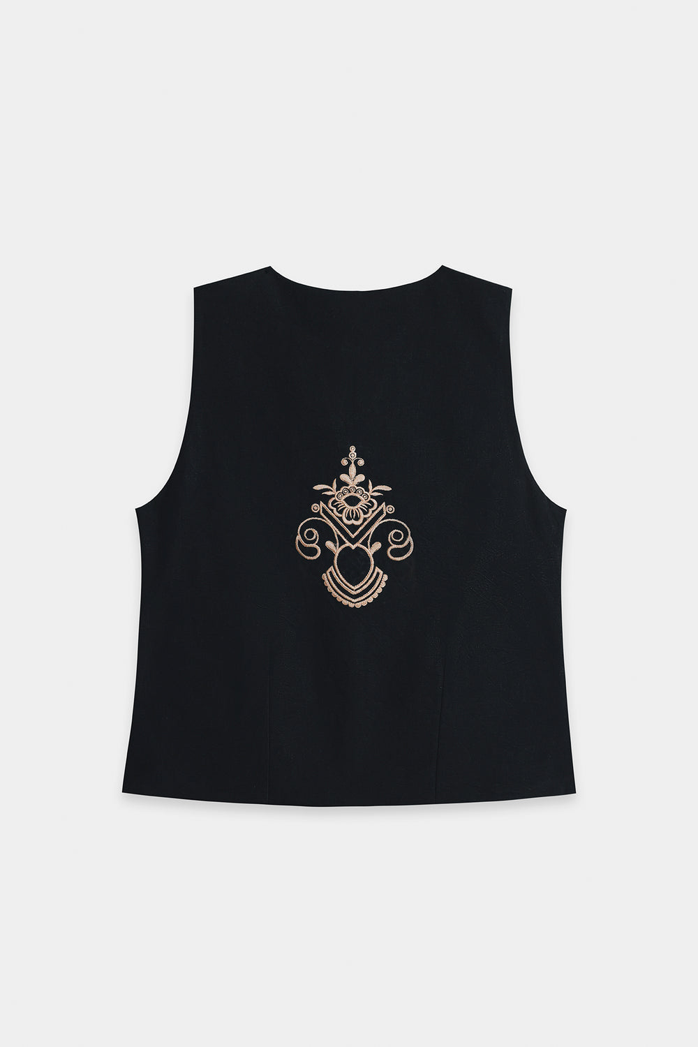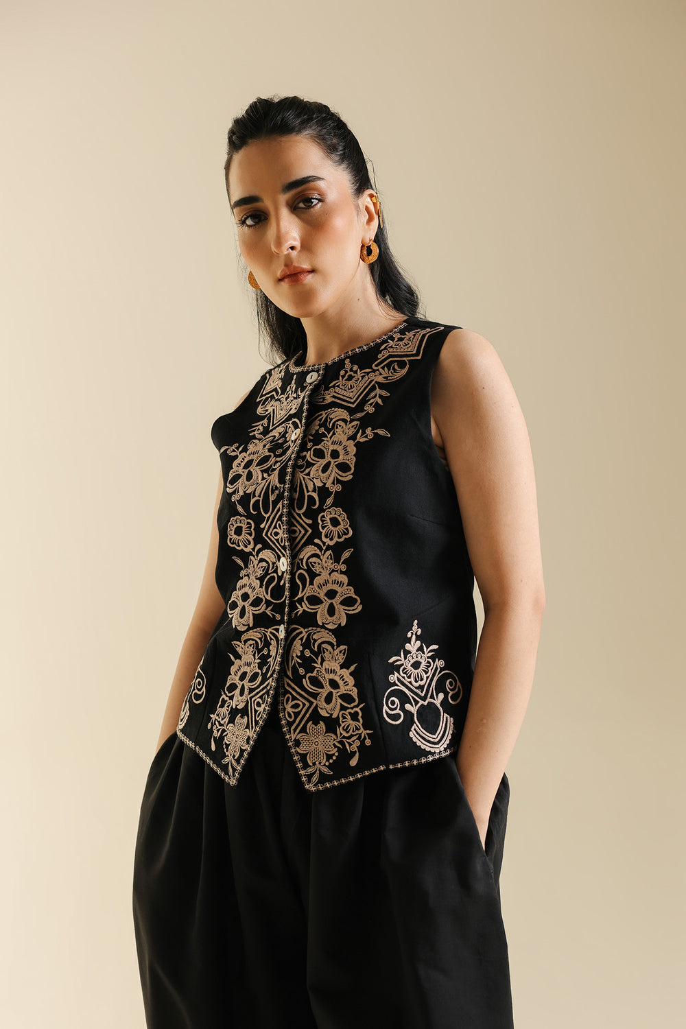 Channel bold, traditional glamour with this stunning embroidered top. This top features a sleeveless, structured waistcoat-style silhouette, crafted from a rich, solid black fabric. The top is richly adorned with intricate gold and off-white embroidery forming symmetrical floral and ornamental motifs across the chest and along the bottom edges. The waistcoat is elegantly fastened with small buttons and features a flattering, slightly pointed hemline, completing a powerful, contemporary look that is both dramatic and comfortable.