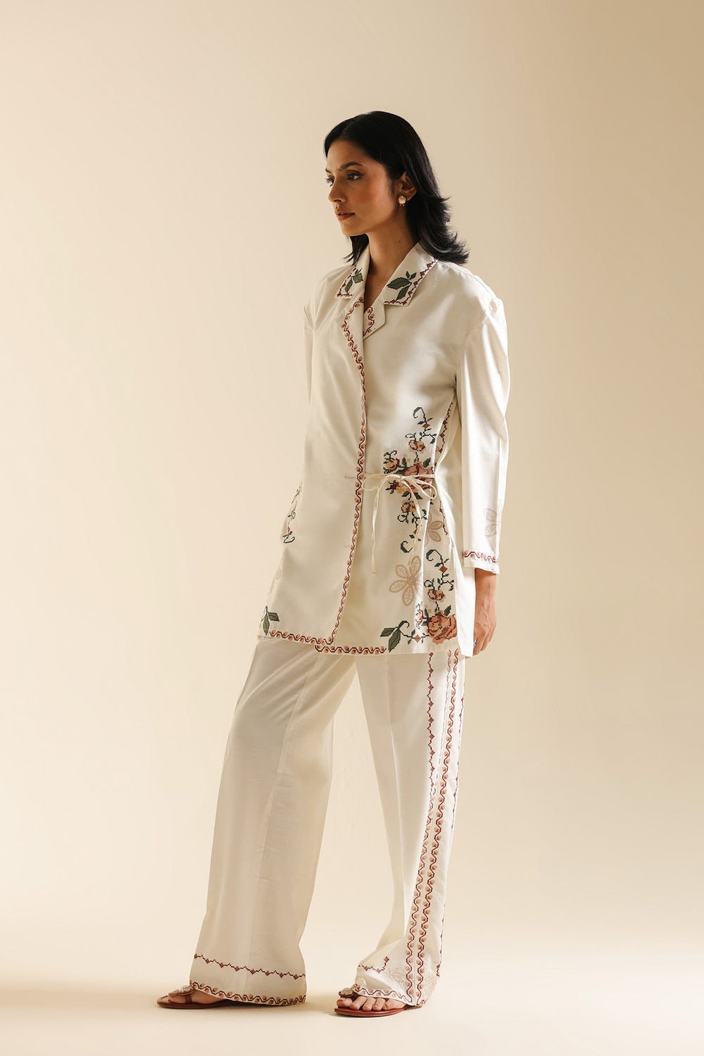 Step into sophisticated comfort with this exquisite white embroidered co-ord suit. This fresh, two-piece set is crafted from a crisp, pure white fabric, offering a clean and modern foundation. The top features an elegant wrap-front design secured with a tie and is beautifully detailed with delicate pink, green, and earthy floral embroidery that flows across the lapels, hems, and cuffs. The suit is completed with matching straight-leg trousers, which mirror the same continuous red embroidery along the sides and hems. This ensemble is the perfect blend of traditional embroidery with a sleek, contemporary silhouette, ideal for day events or evening sophistication.