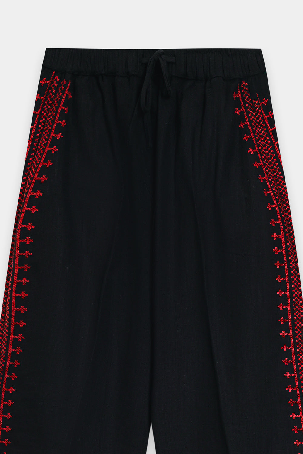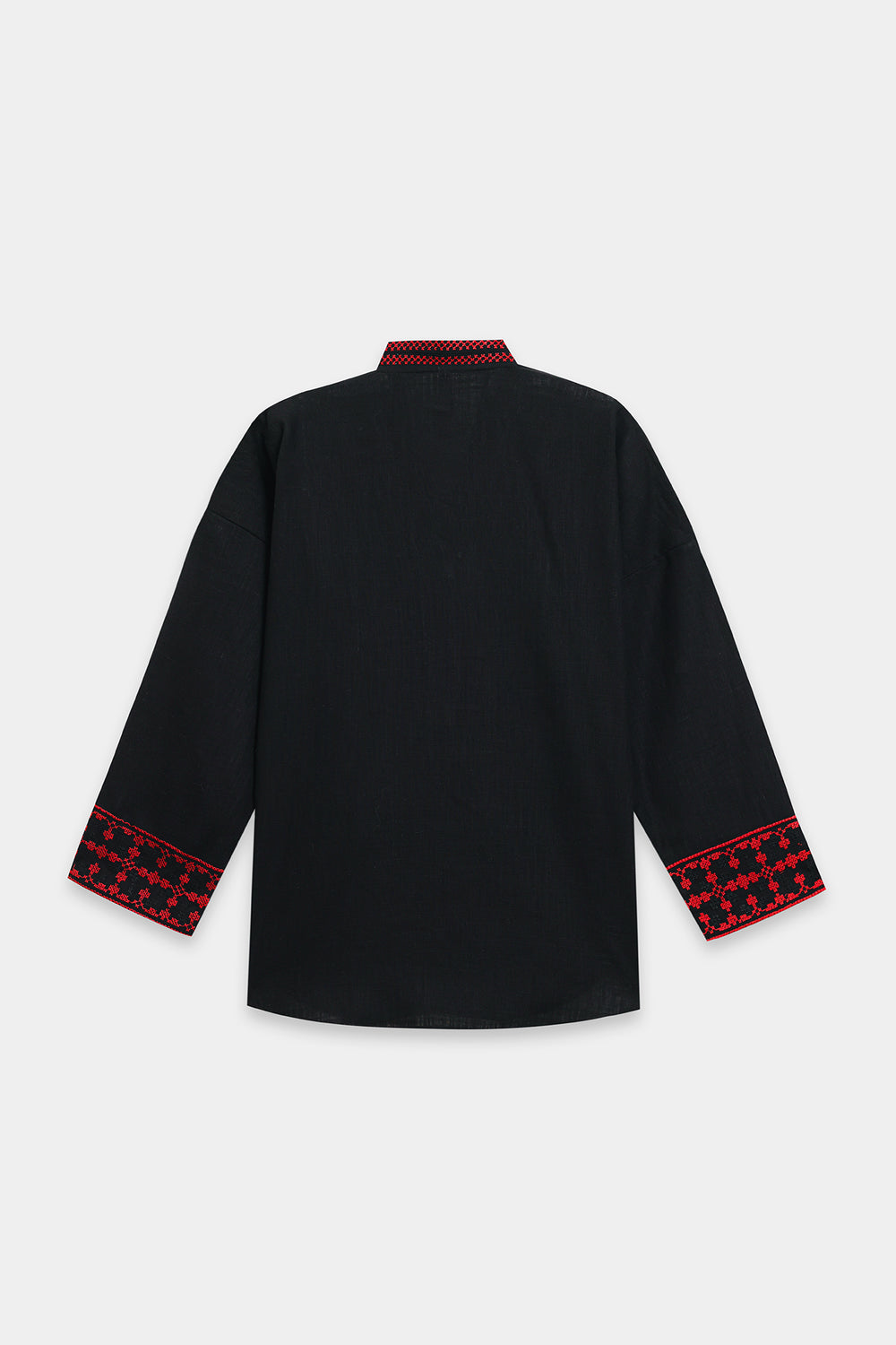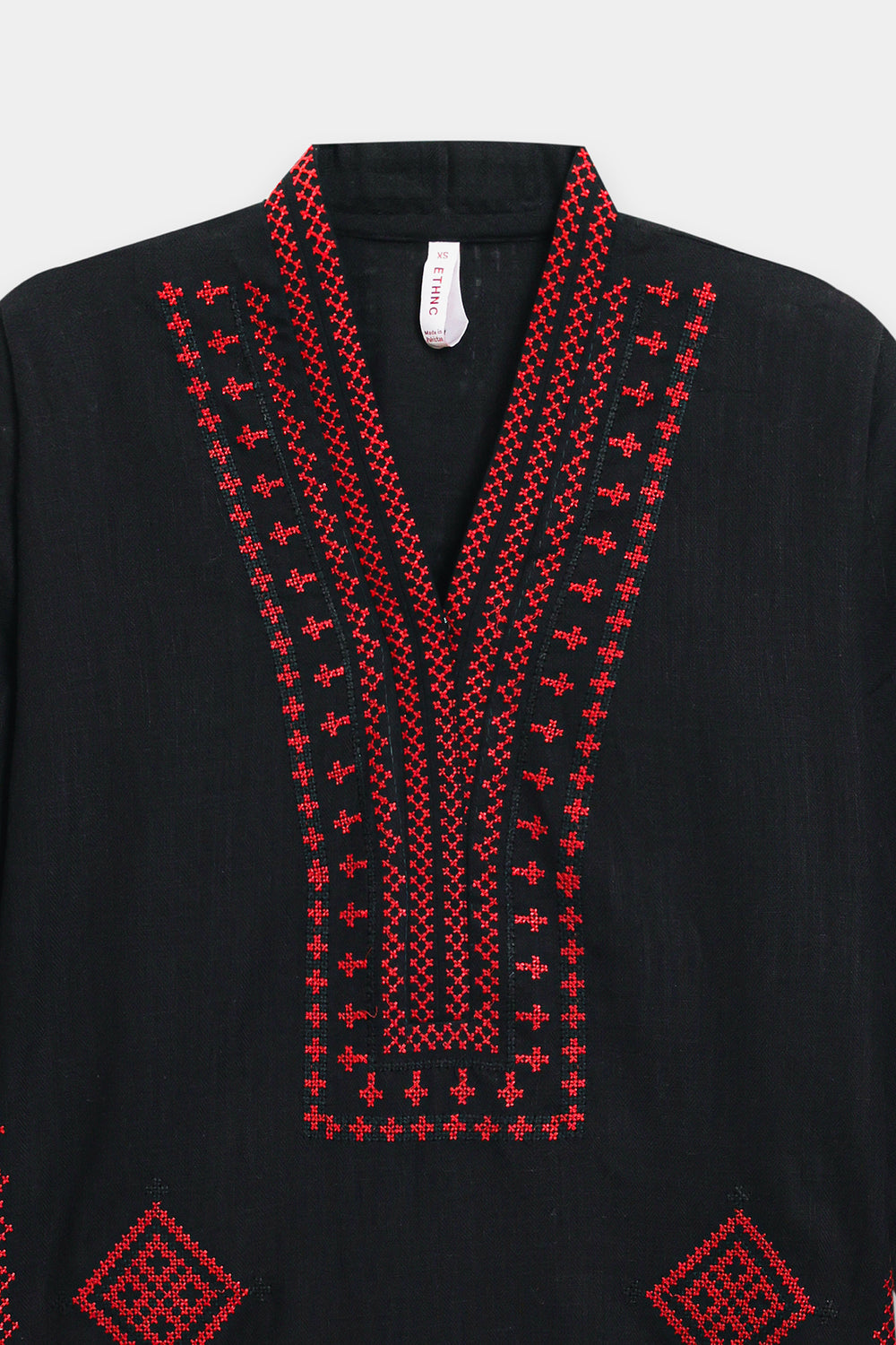 Elevate your ethnic wardrobe with this sophisticated black printed suit, expertly crafted with striking red embroidery detailing. The relaxed-fit tunic features an elegant V-neckline with ornate embroidered accents along the neckline and cuffs, while the straight-cut trousers showcase complementary embroidery at the hem. Constructed from premium lightweight fabric for comfort and breathability, this ensemble seamlessly blends traditional craftsmanship with contemporary style. Perfect for festive occasions, cultural celebrations, or refined everyday wear, this versatile two-piece set delivers timeless elegance with modern sensibility.