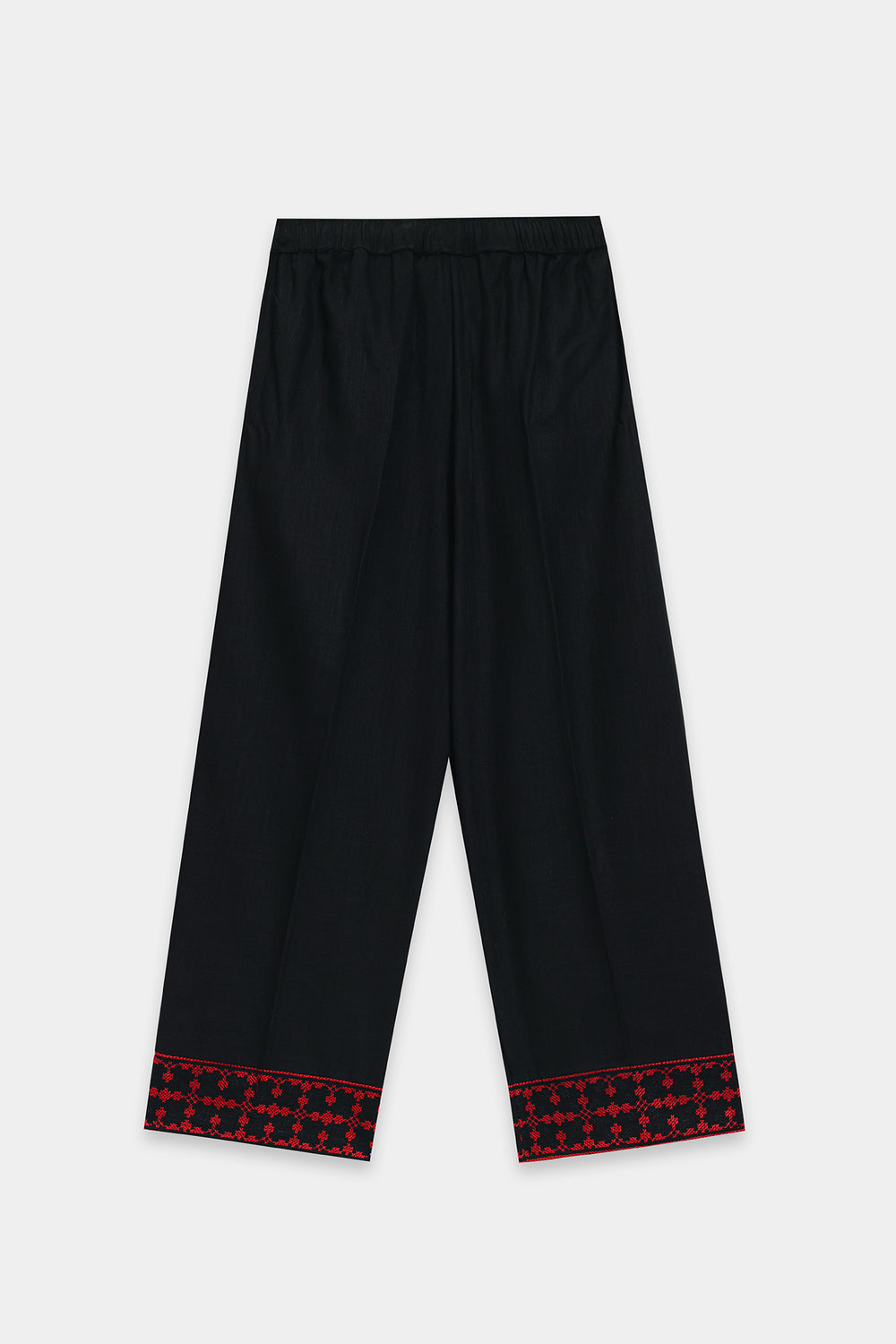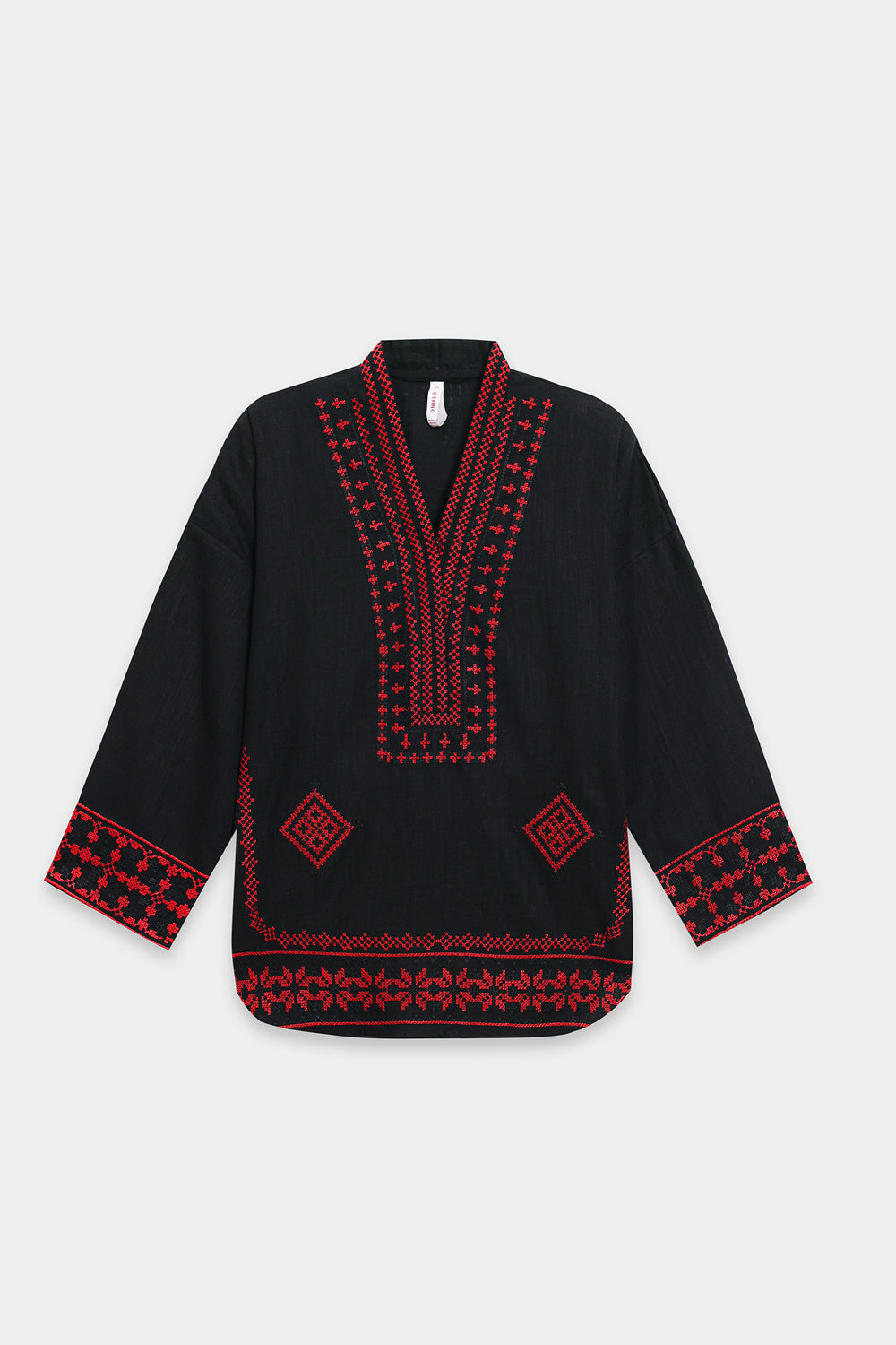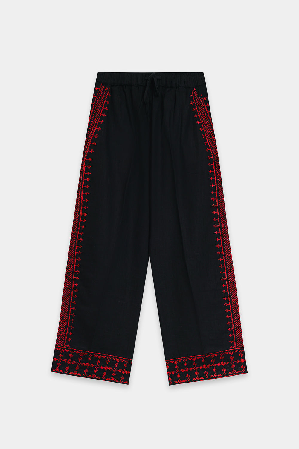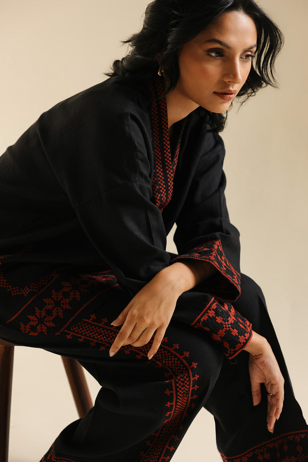 Elevate your ethnic wardrobe with this sophisticated black printed suit, expertly crafted with striking red embroidery detailing. The relaxed-fit tunic features an elegant V-neckline with ornate embroidered accents along the neckline and cuffs, while the straight-cut trousers showcase complementary embroidery at the hem. Constructed from premium lightweight fabric for comfort and breathability, this ensemble seamlessly blends traditional craftsmanship with contemporary style. Perfect for festive occasions, cultural celebrations, or refined everyday wear, this versatile two-piece set delivers timeless elegance with modern sensibility.