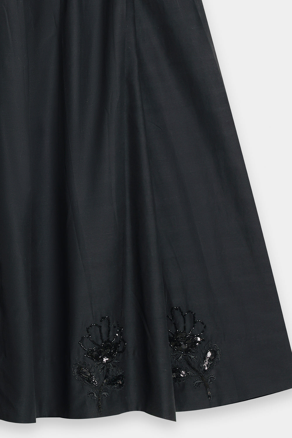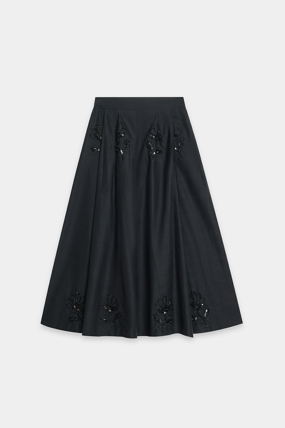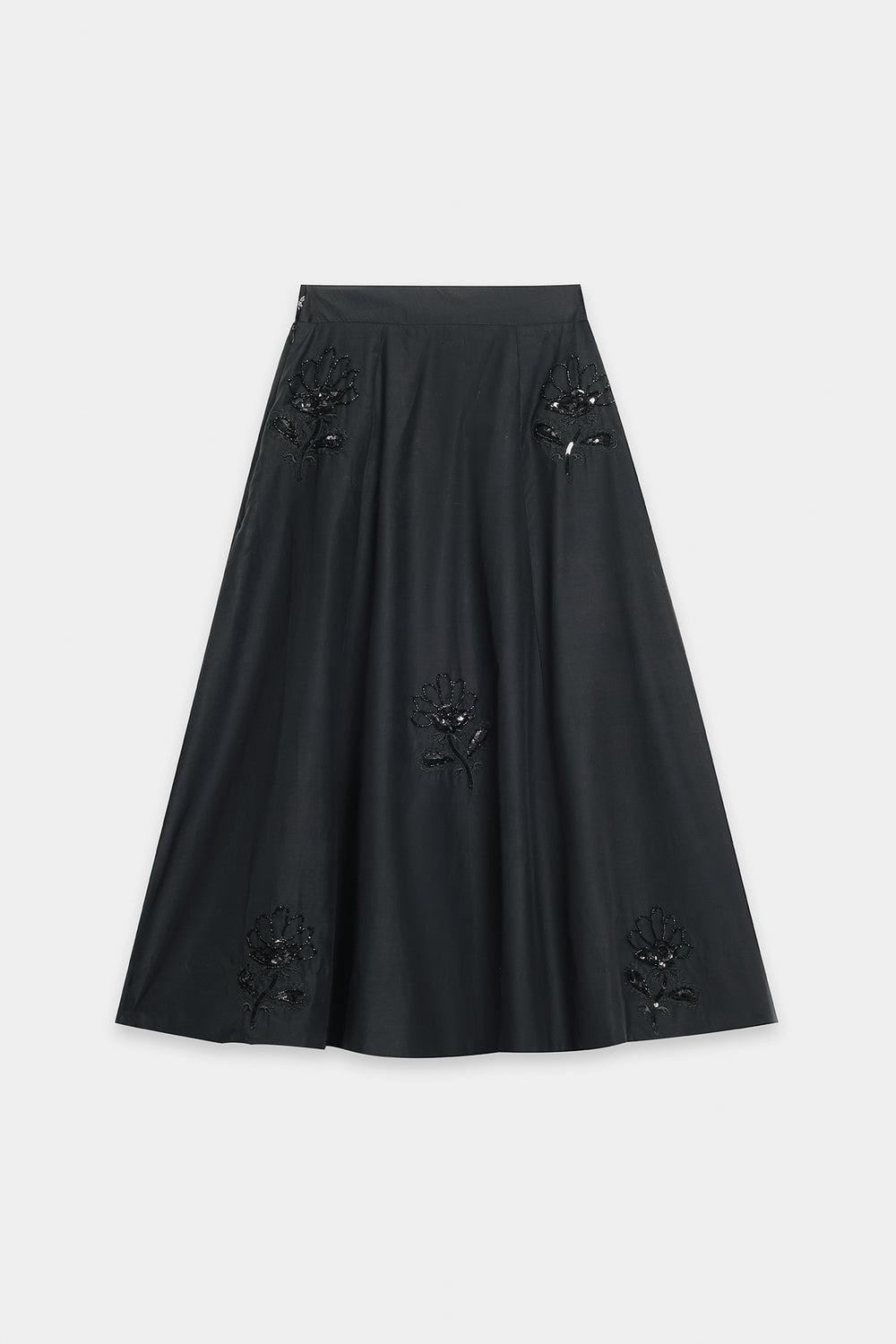 Elevate your silhouette with this sophisticated black A-line skirt, expertly designed with graceful gore panels that create fluid movement. The midi-to-maxi length offers elegant coverage while the gently flared cut ensures comfortable, flattering wear. Subtle yet striking tone-on-tone embellishment—featuring sequins, beads, and appliqué work—adorns the hem and cascades up the panels in organic floral motifs, adding refined texture and visual intrigue. This piece is versatile enough for both formal occasions and elevated casual settings.