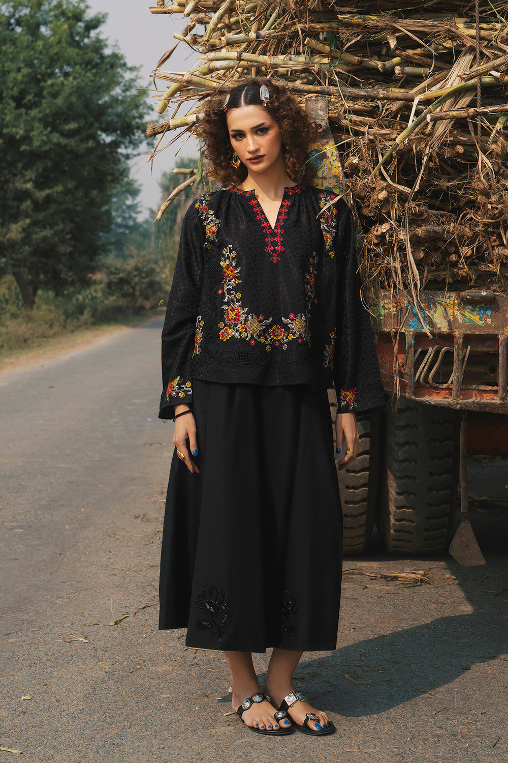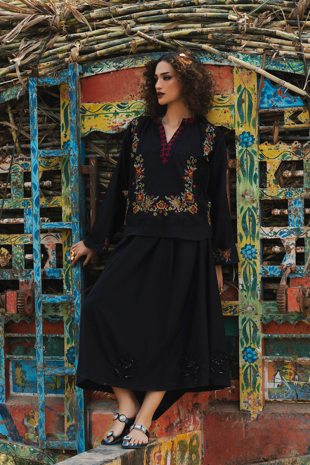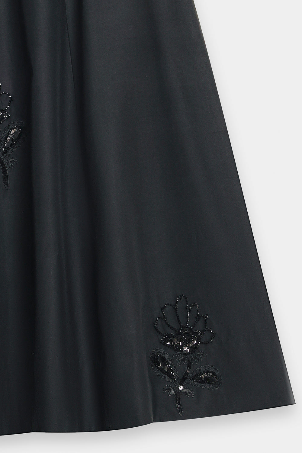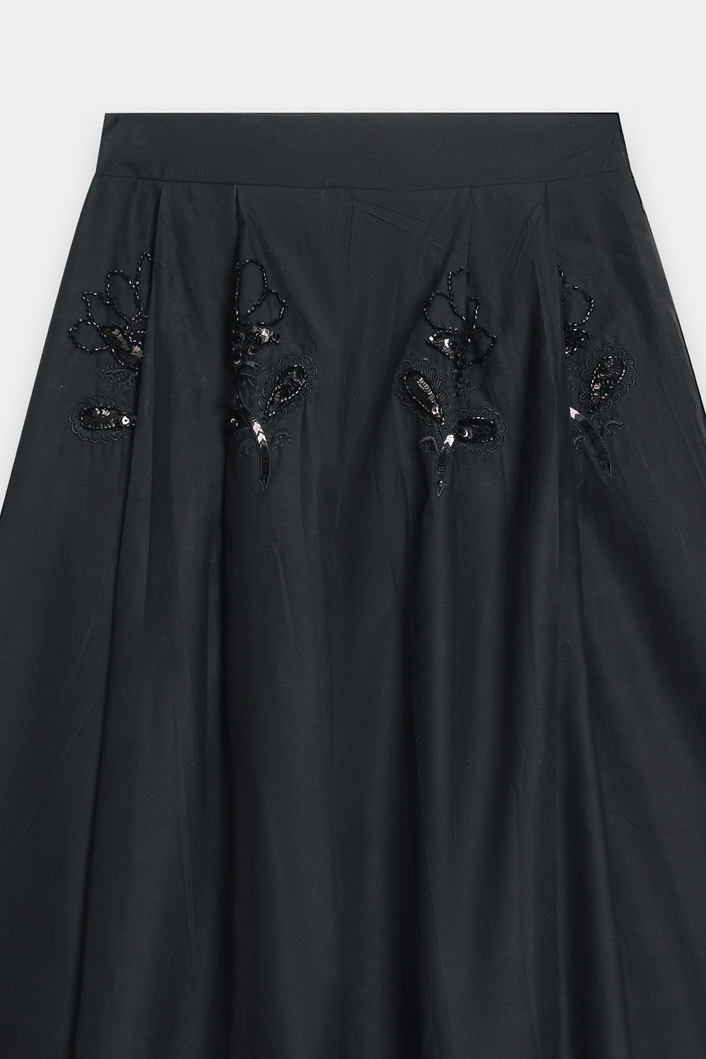 Elevate your silhouette with this sophisticated black A-line skirt, expertly designed with graceful gore panels that create fluid movement. The midi-to-maxi length offers elegant coverage while the gently flared cut ensures comfortable, flattering wear. Subtle yet striking tone-on-tone embellishment—featuring sequins, beads, and appliqué work—adorns the hem and cascades up the panels in organic floral motifs, adding refined texture and visual intrigue. This piece is versatile enough for both formal occasions and elevated casual settings.