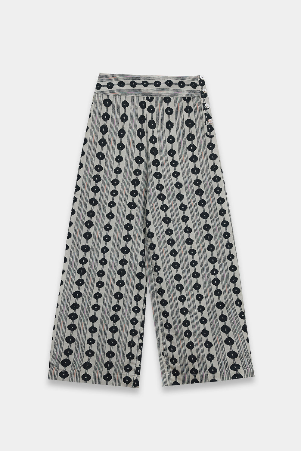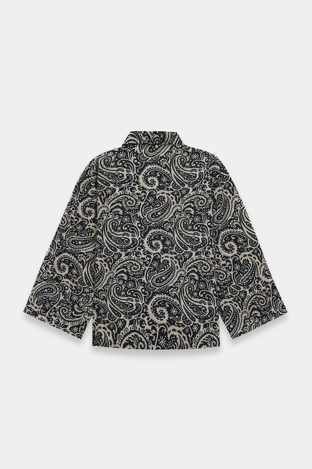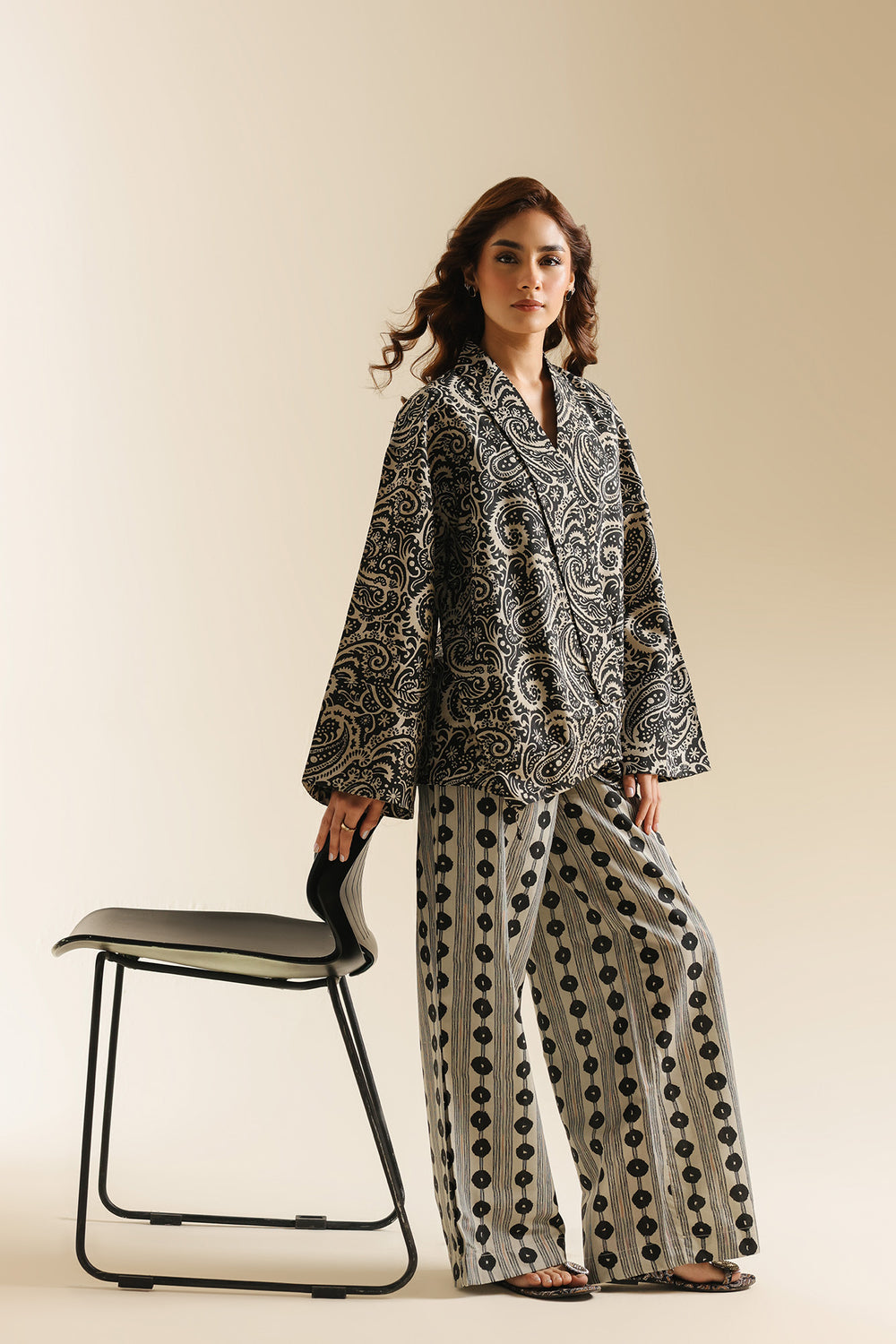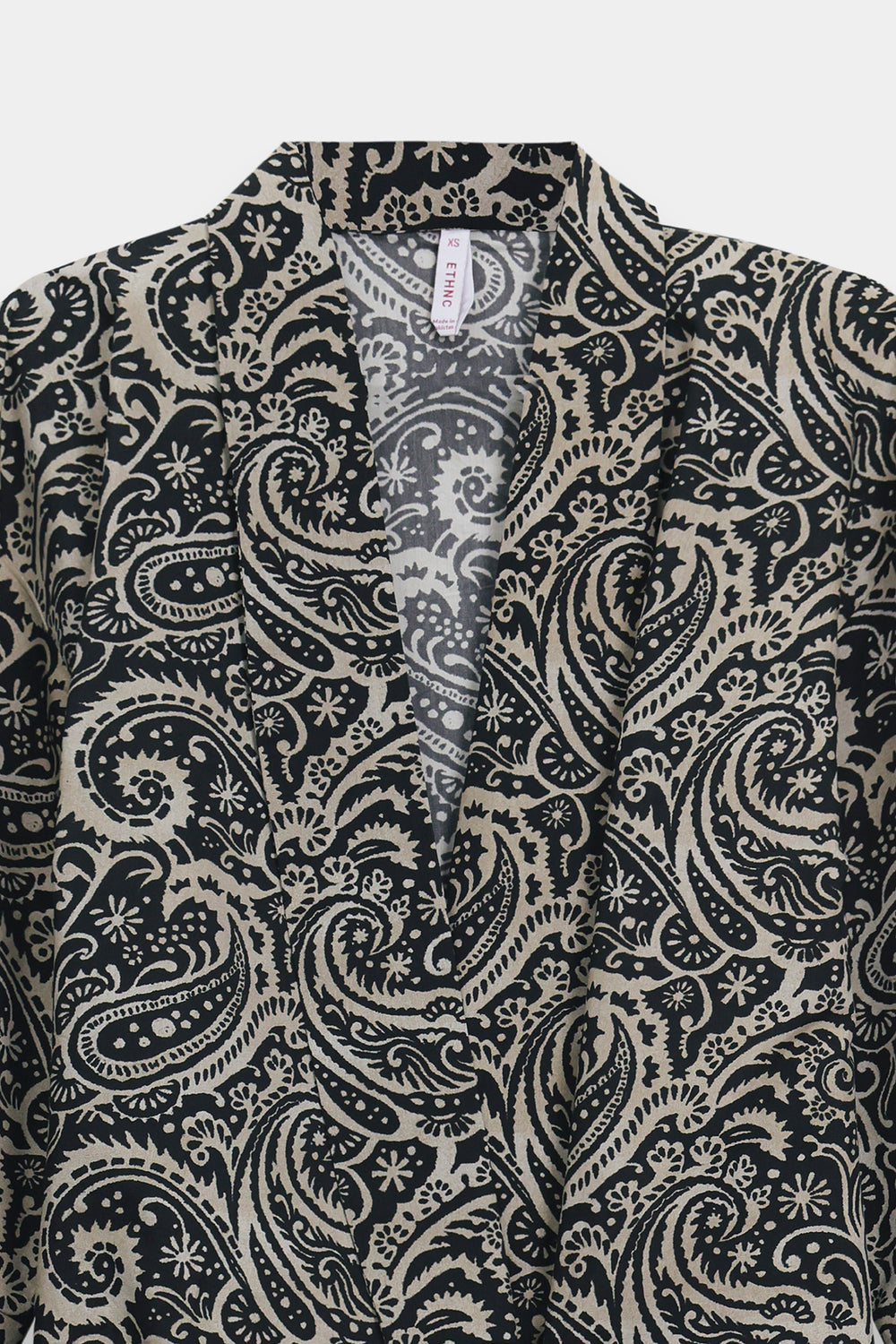 Command attention with this striking embroidered suit, a bold statement piece that masterfully combines pattern and proportion. The structured wrap jacket features a dramatic V-neckline and voluminous kimono-style sleeves, adorned with a captivating black and off-white paisley print that exudes timeless elegance. Paired with high-waisted palazzo trousers, the ensemble showcases a sophisticated vertical stripe composition. This contemporary silhouette celebrates artisanal design while offering versatile styling for both formal occasions and fashion-forward everyday wear.