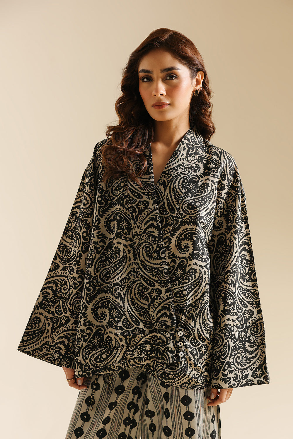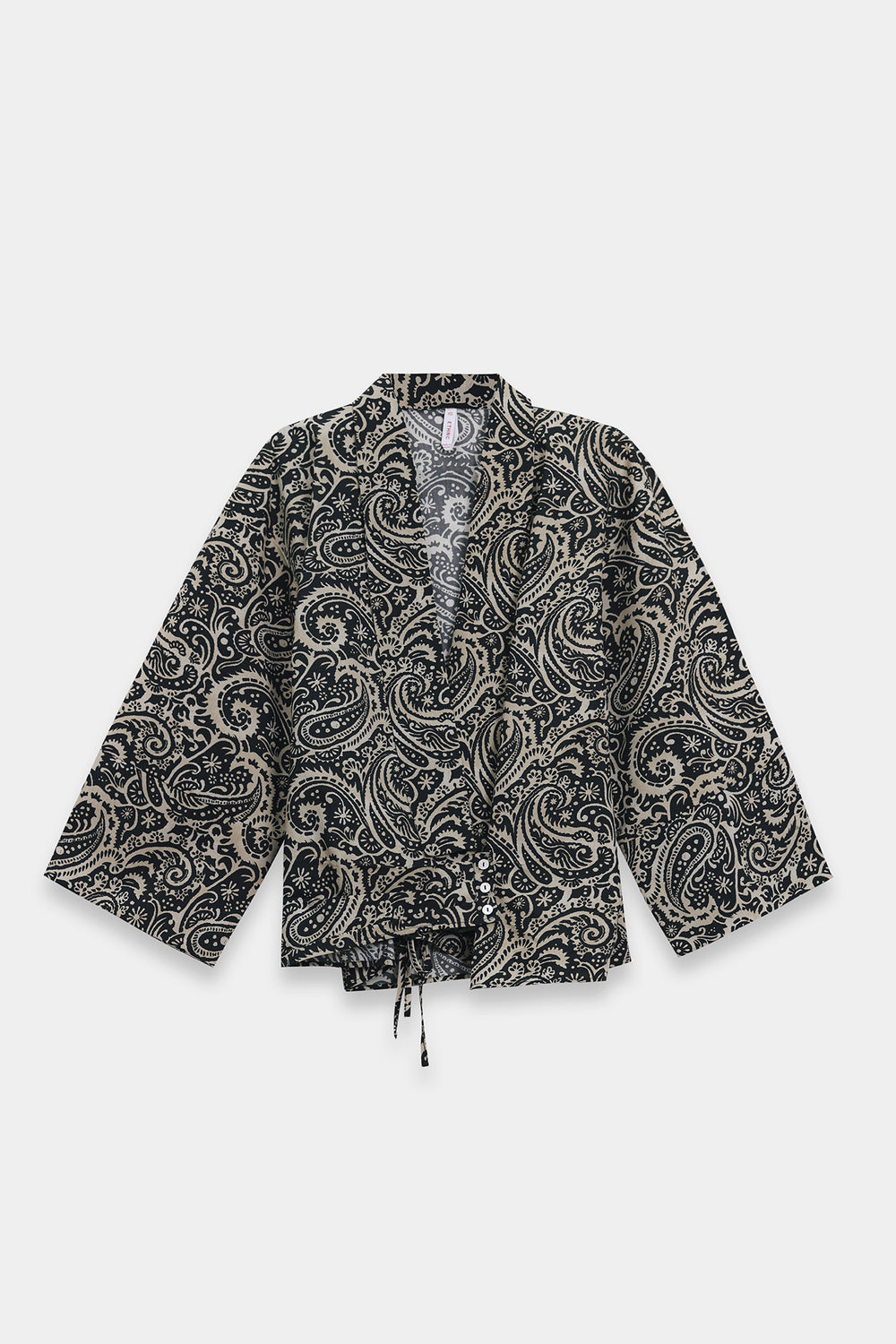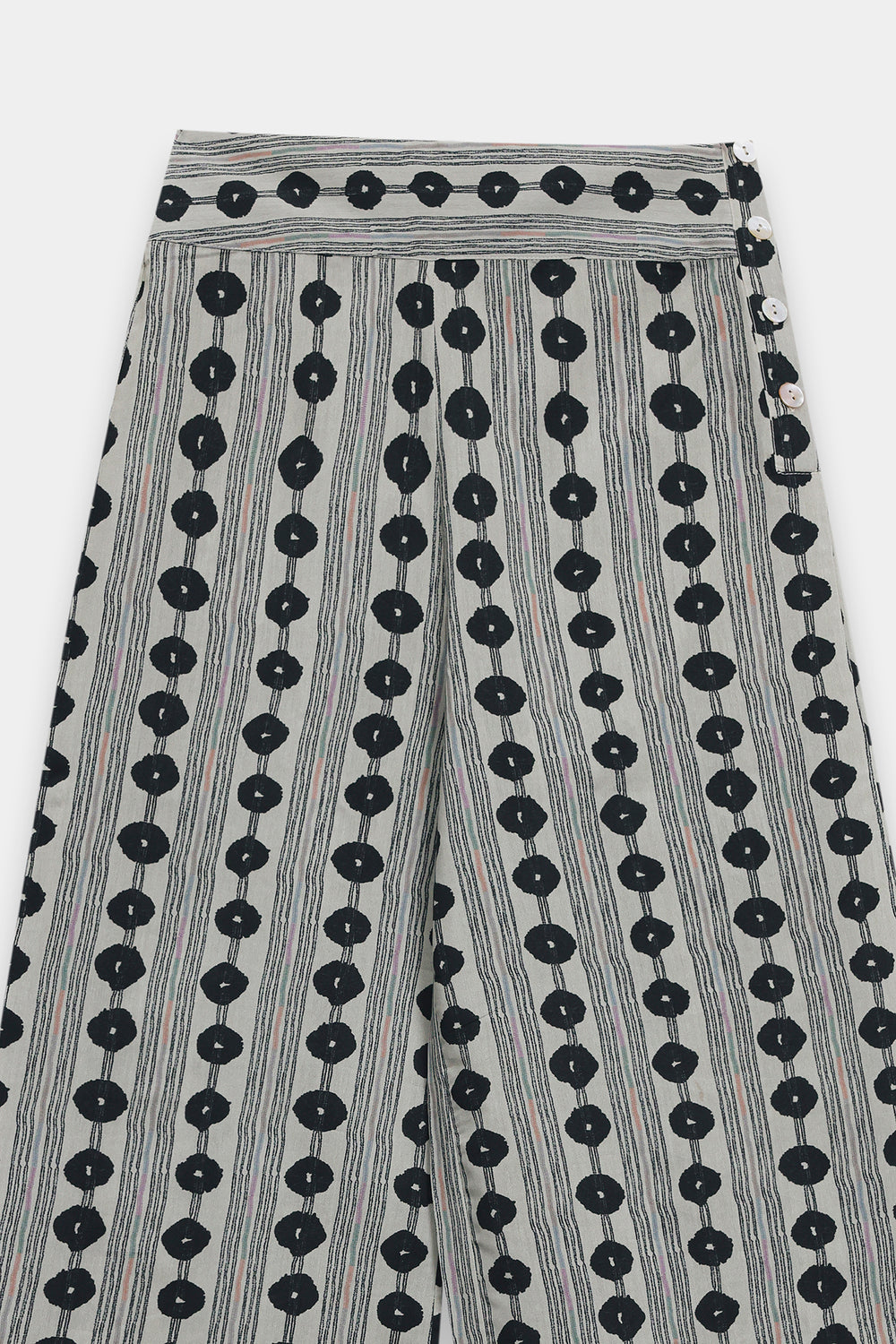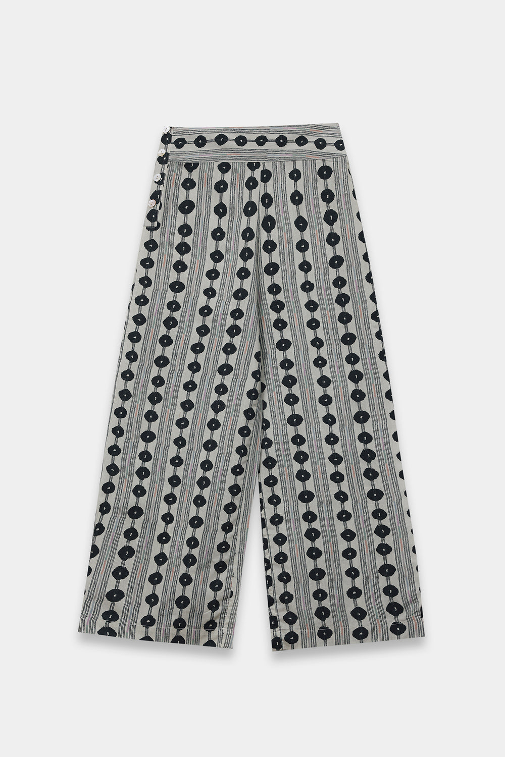 Command attention with this striking embroidered suit, a bold statement piece that masterfully combines pattern and proportion. The structured wrap jacket features a dramatic V-neckline and voluminous kimono-style sleeves, adorned with a captivating black and off-white paisley print that exudes timeless elegance. Paired with high-waisted palazzo trousers, the ensemble showcases a sophisticated vertical stripe composition. This contemporary silhouette celebrates artisanal design while offering versatile styling for both formal occasions and fashion-forward everyday wear.