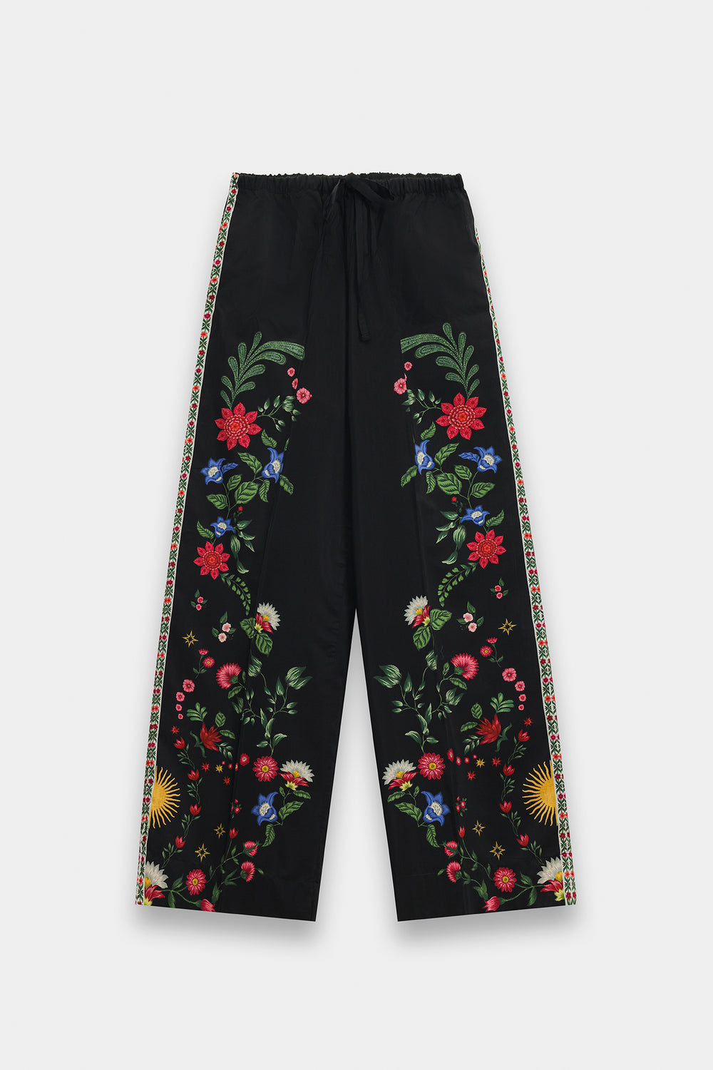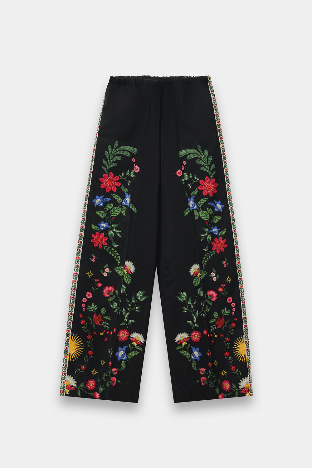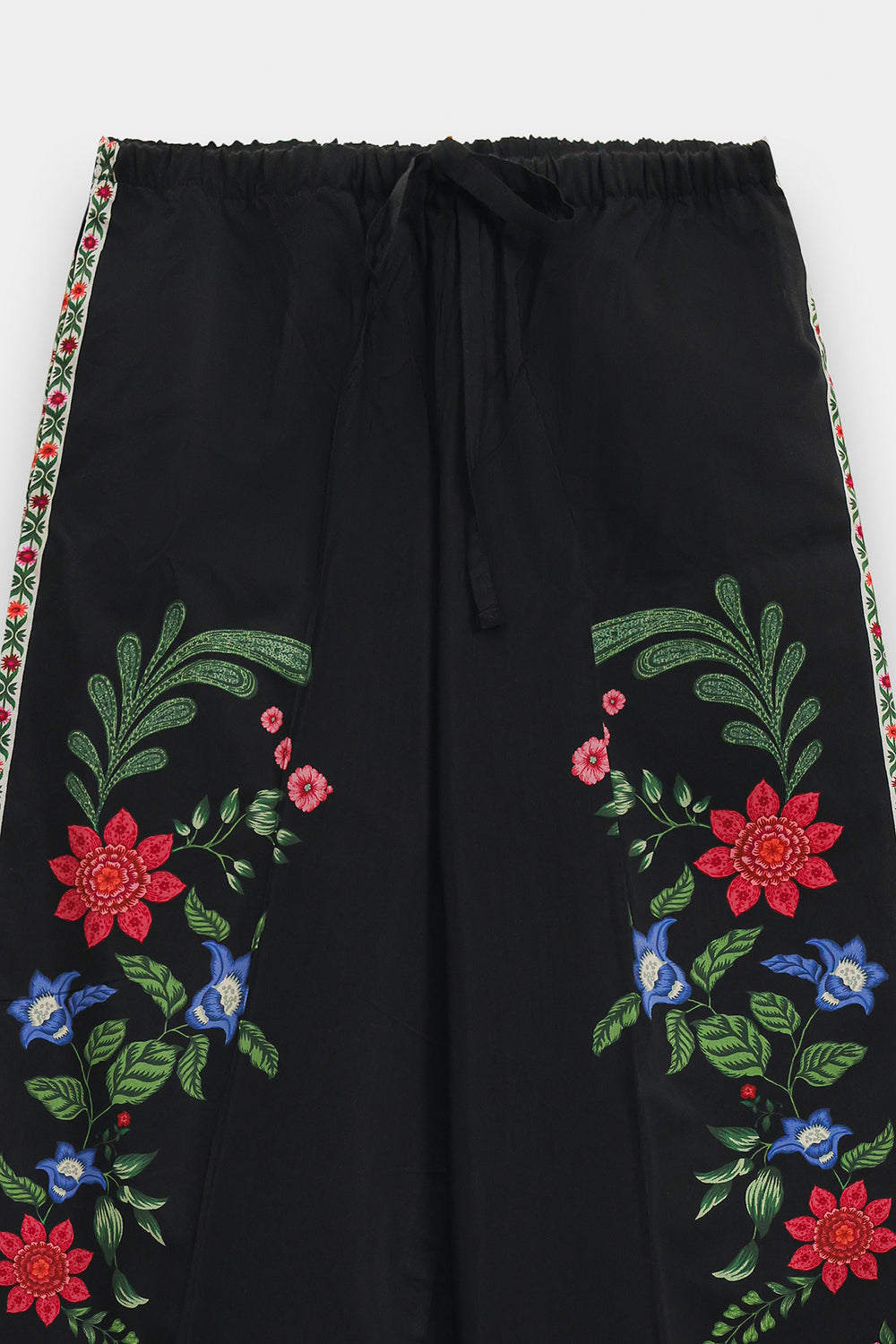 A dramatic exploration of print and contrast, this jet black two-piece suit is a masterclass in modern ethnic styling. The shirt is crafted from premium, breathable fabric featuring a lush, vintage-inspired floral print in soft blush, sage, and cream tones that bloom against the deep ebony backdrop. Designed with a sophisticated straight-cut silhouette, it features a clean-finished V neckline and relaxed full sleeves for a polished yet effortless feel. The ensemble is paired with matching straight-leg trousers, creating a bold visual interplay that transitions seamlessly from daytime chic to evening elegance. This set provides a striking, elevated canvas that exudes understated luxury and contemporary flair.