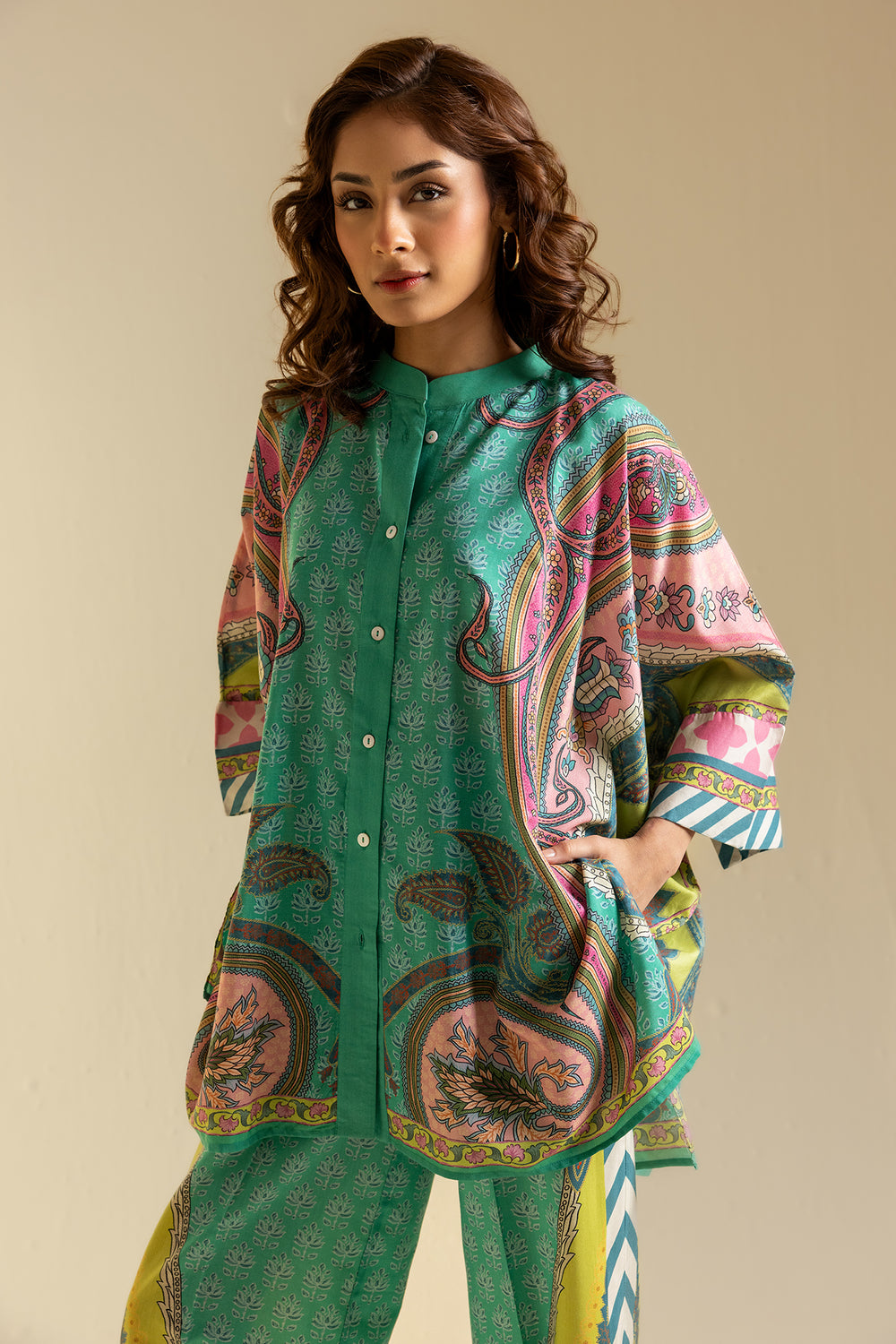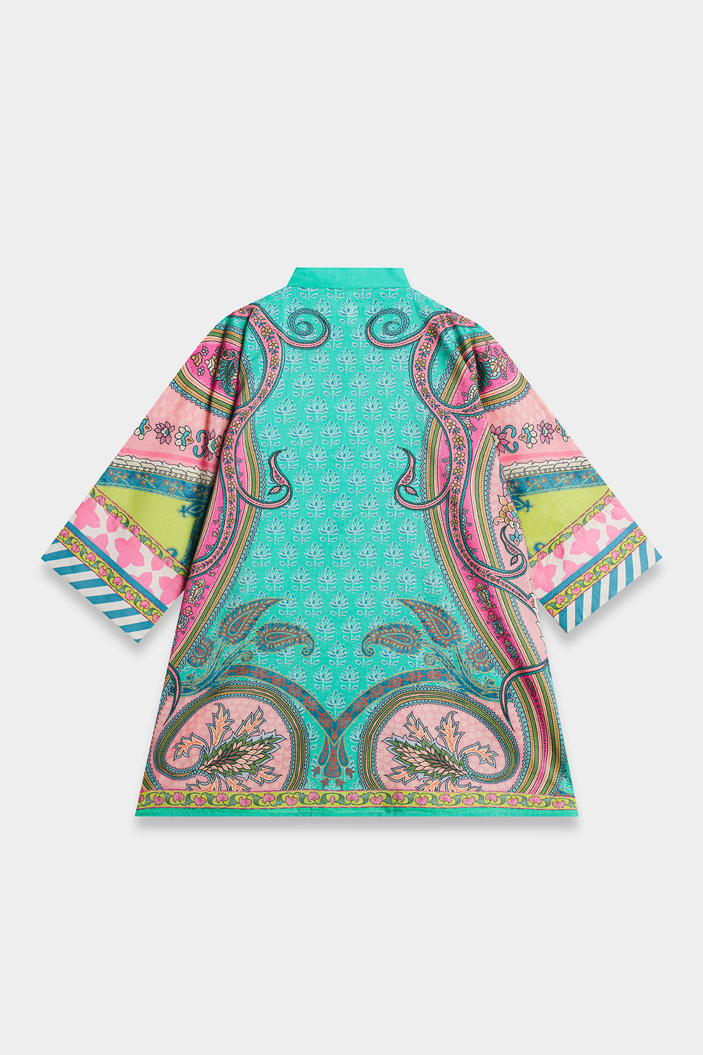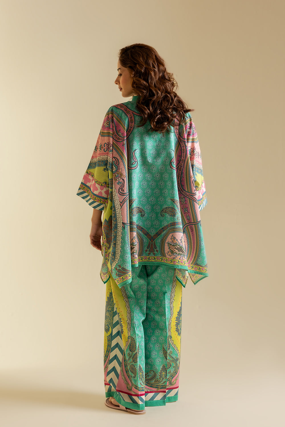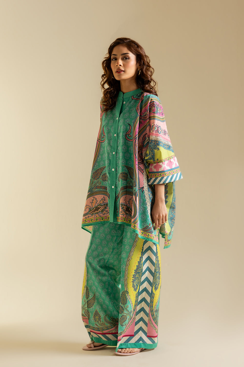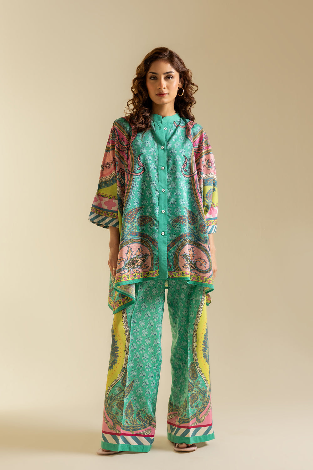 Indulge in elegance and sophistication with this classy kimono silhouette top rendered in a deep sea green shade and crafted in a contemporary silhouette, featuring rich paisley prints in mesmerizing colors. Paired with a trendy printed culotte trouser, this outfit is perfect for fun occasions this season. Don't miss out on this must-have piece!