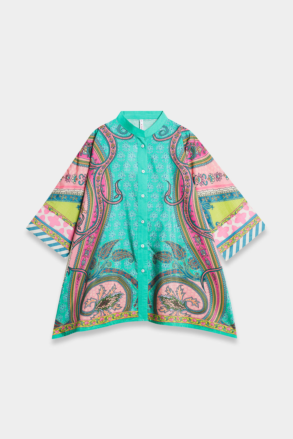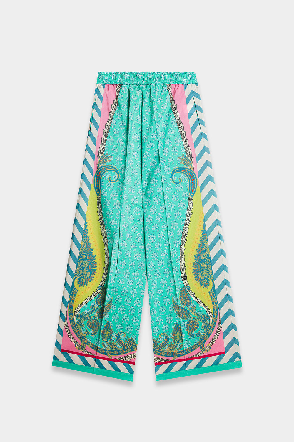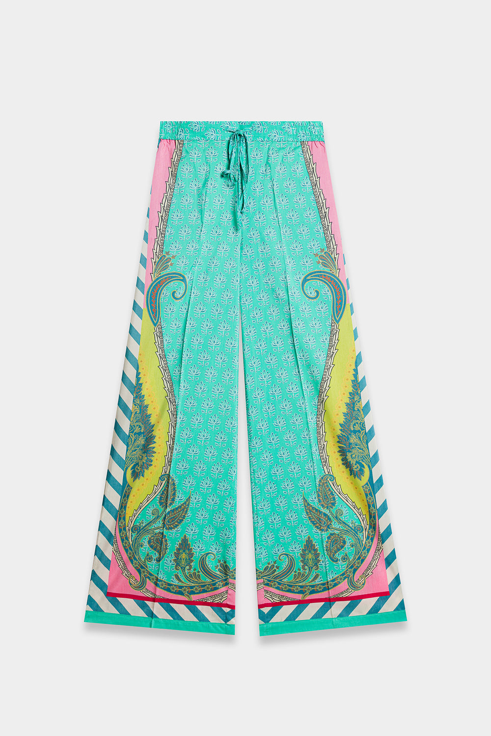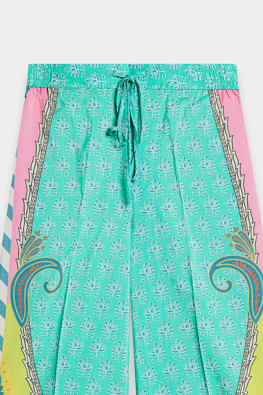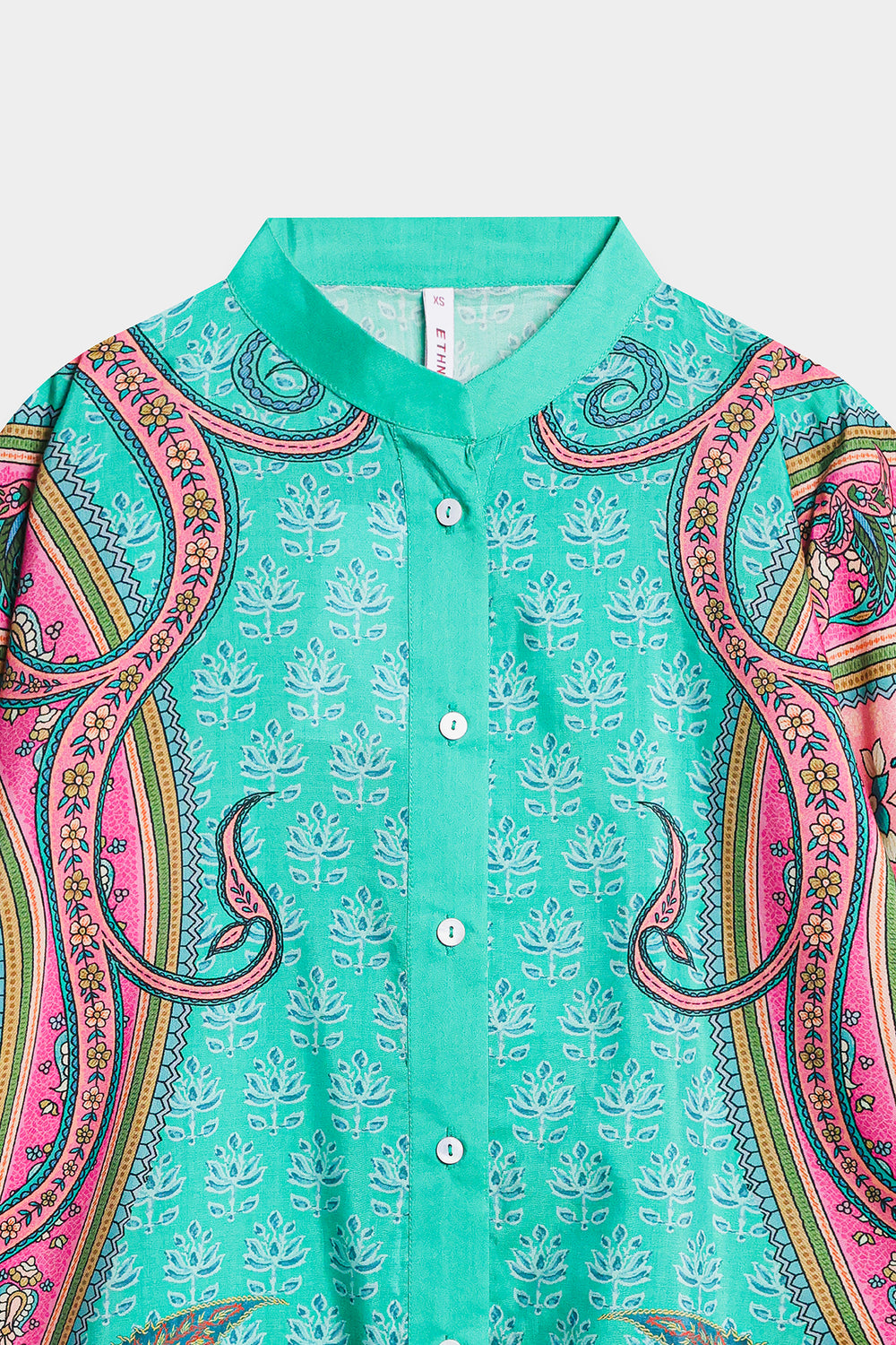 Indulge in elegance and sophistication with this classy kimono silhouette top rendered in a deep sea green shade and crafted in a contemporary silhouette, featuring rich paisley prints in mesmerizing colors. Paired with a trendy printed culotte trouser, this outfit is perfect for fun occasions this season. Don't miss out on this must-have piece!