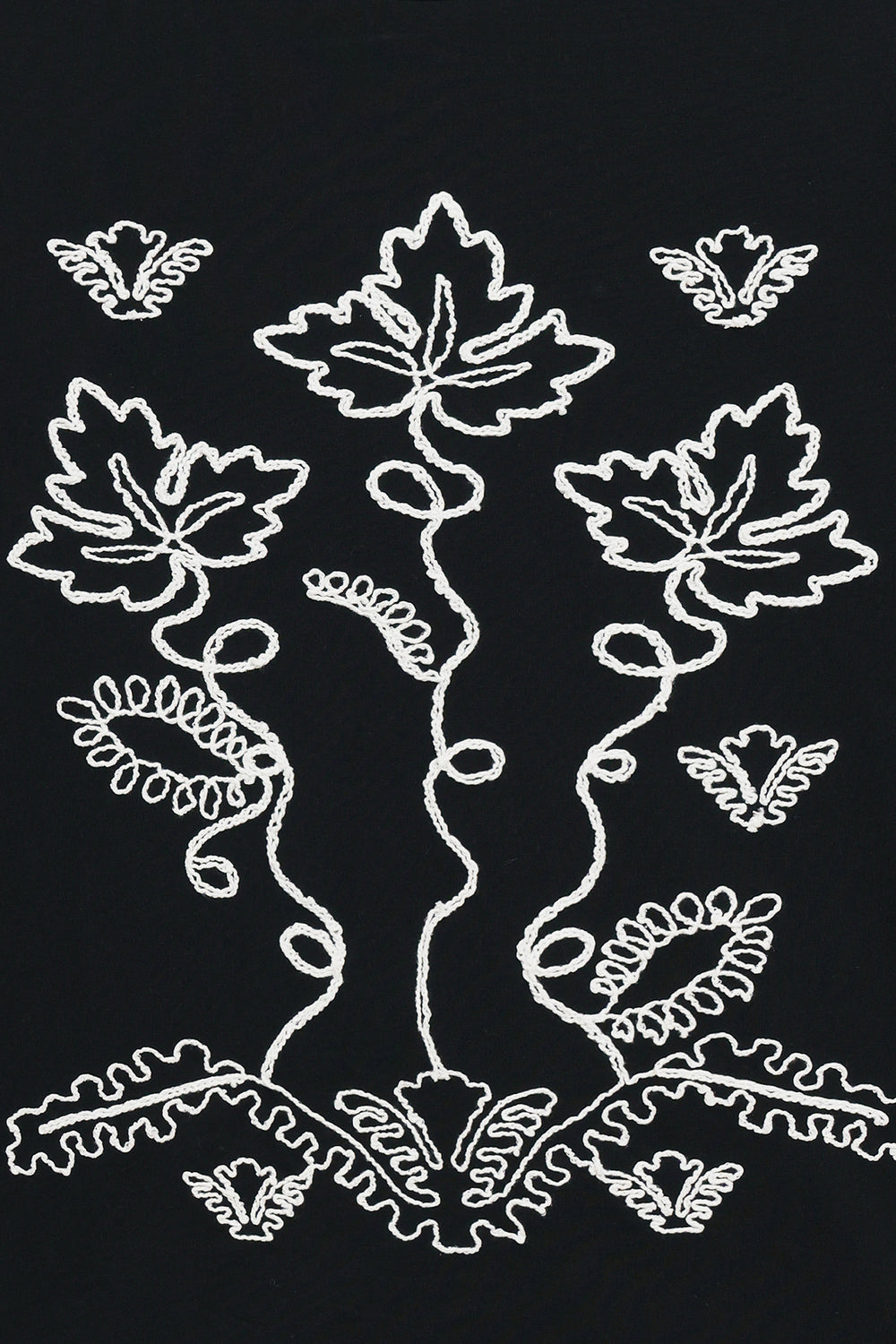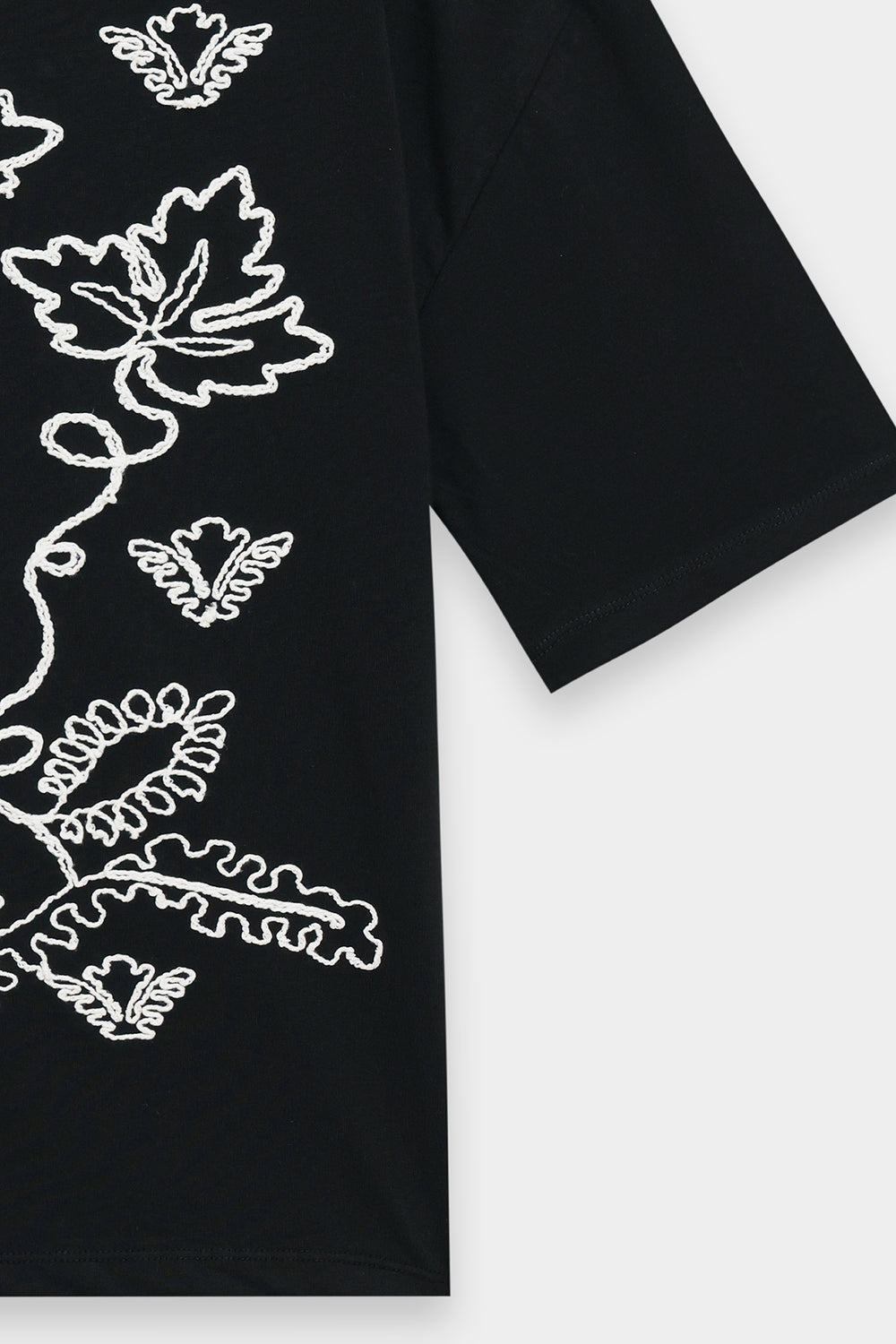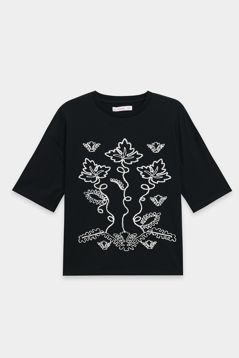Make a statement with this effortlessly chic black top, where classic comfort meets intricate global-inspired artistry. The relaxed-fit tee features a captivating medley of white-colored embroidery, showcasing beautiful floral patterns across the front. The vibrant hues and unique motifs create a contemporary yet culturally rich design, making it a true standout piece. Perfect for adding an artistic edge to your casual wear, or dressing up for a distinctive and inspired look.