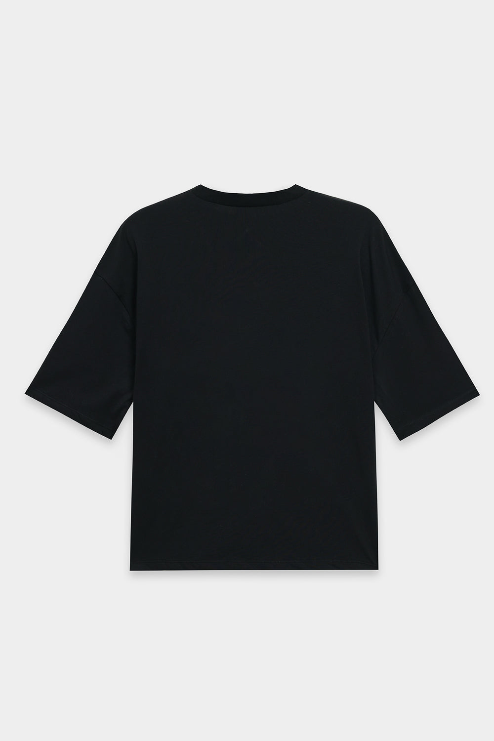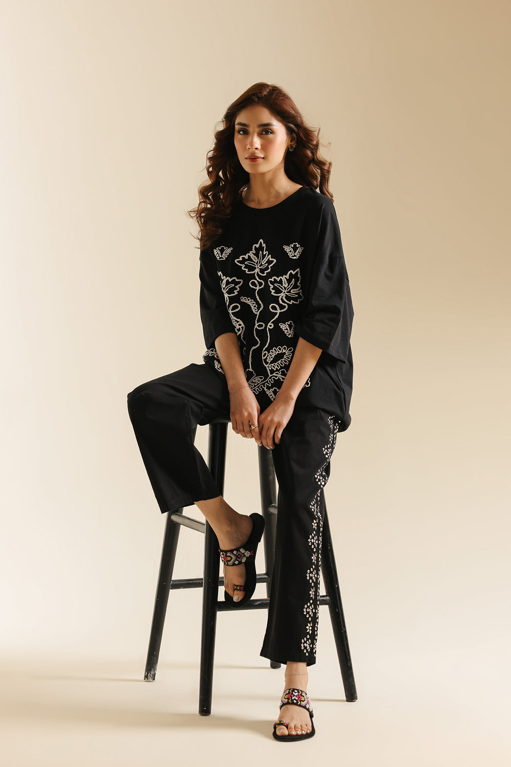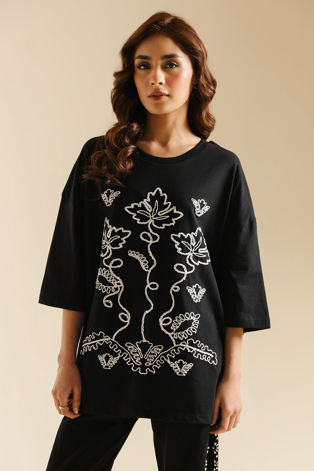 Make a statement with this effortlessly chic black top, where classic comfort meets intricate global-inspired artistry. The relaxed-fit tee features a captivating medley of white-colored embroidery, showcasing beautiful floral patterns across the front. The vibrant hues and unique motifs create a contemporary yet culturally rich design, making it a true standout piece. Perfect for adding an artistic edge to your casual wear, or dressing up for a distinctive and inspired look.