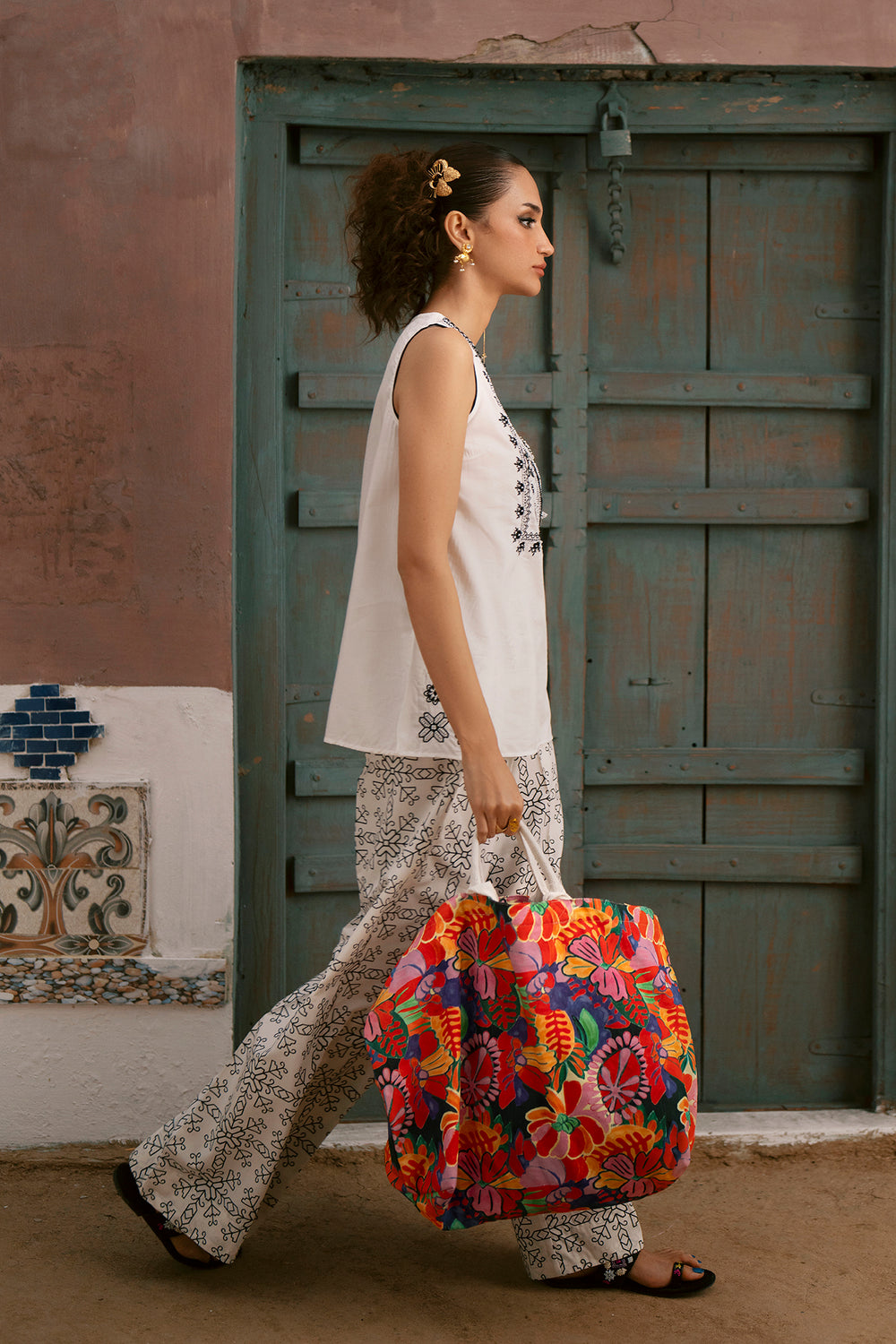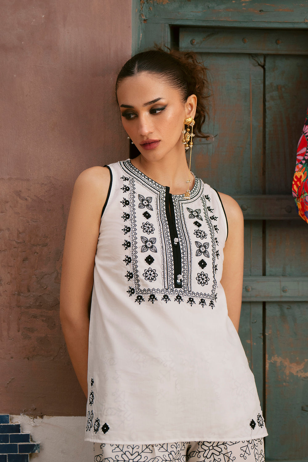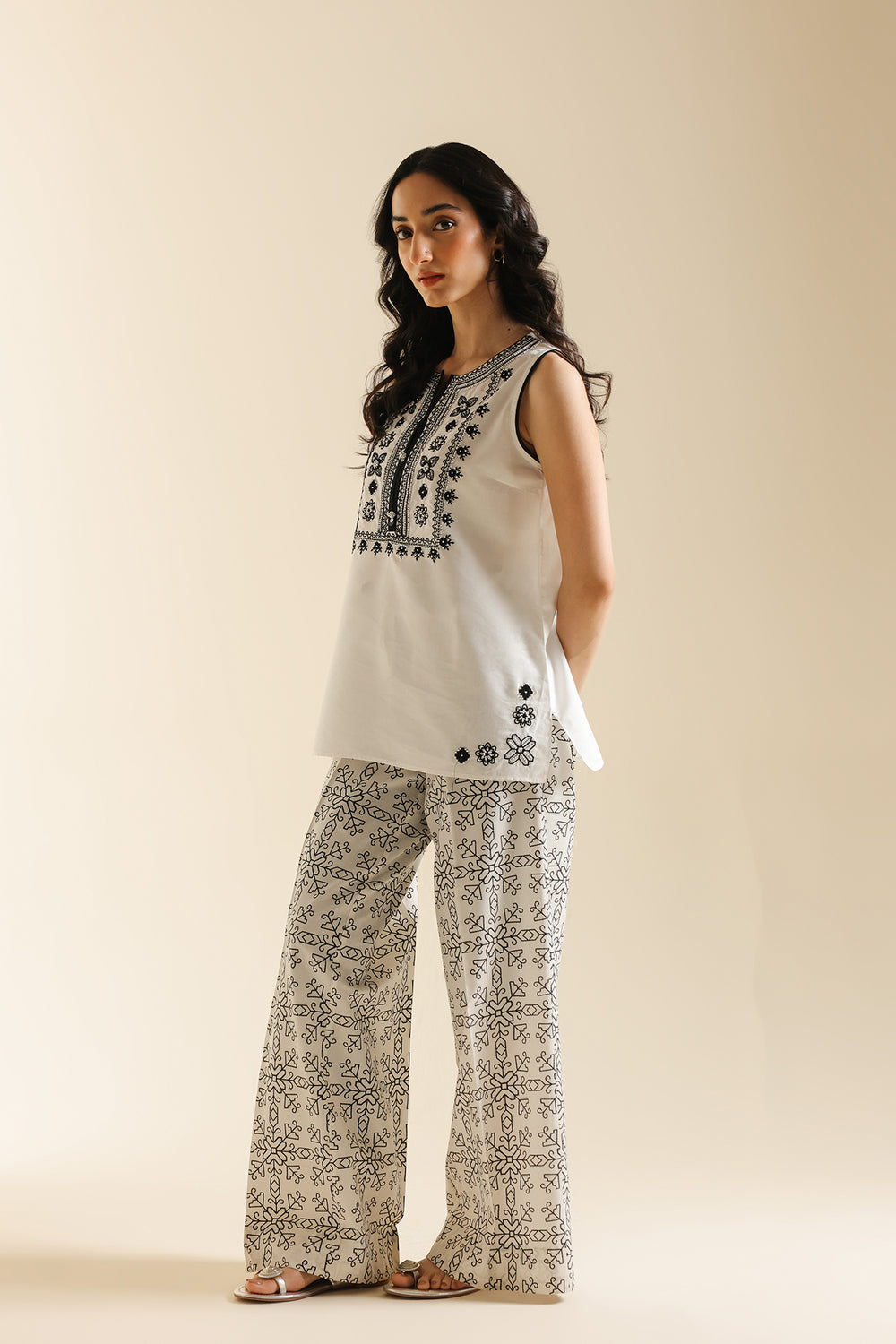 Make a statement in monochrome elegance with this sophisticated black and white embroidered suit. This striking two-piece ensemble features a beautifully coordinated top and trouser. The tunic is a pristine white, sleeveless design, adorned with intricate black thread embroidery forming geometric and floral motifs across the yoke and neckline. The suit is completed with matching wide-leg trouser that feature a bold, black and white print of large stylized floral patterns, offering exceptional drape and a contemporary flair for a bold yet timeless look.