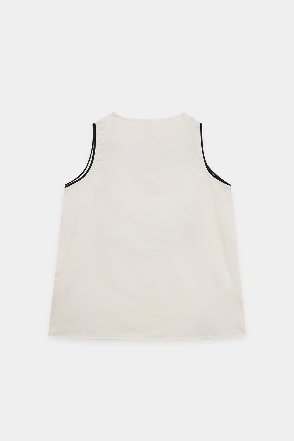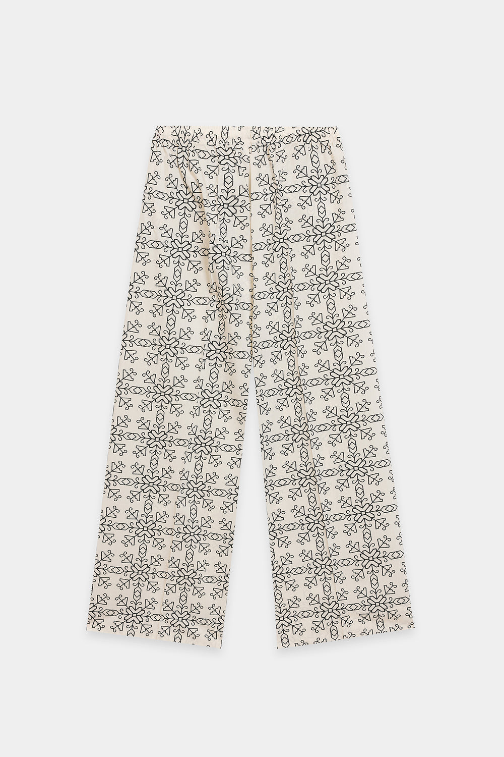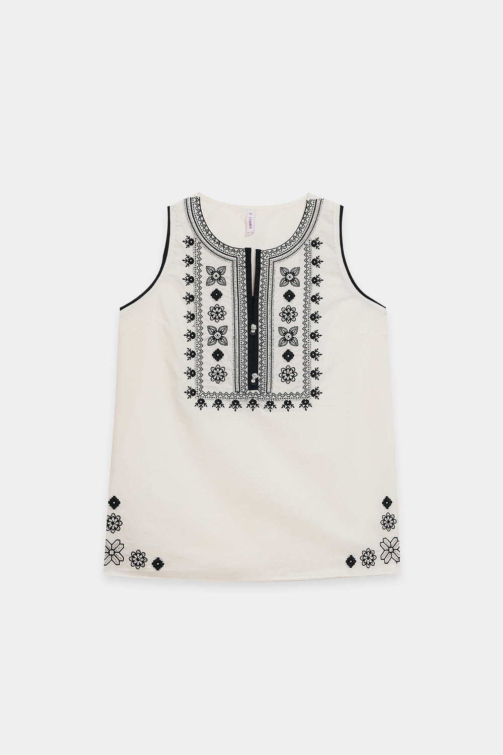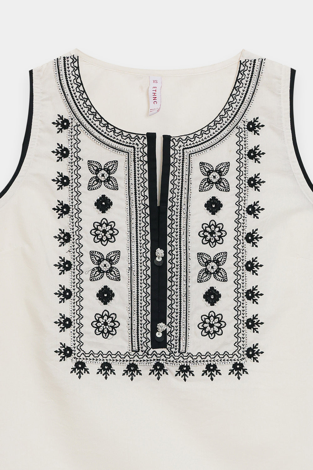 Make a statement in monochrome elegance with this sophisticated black and white embroidered suit. This striking two-piece ensemble features a beautifully coordinated top and trouser. The tunic is a pristine white, sleeveless design, adorned with intricate black thread embroidery forming geometric and floral motifs across the yoke and neckline. The suit is completed with matching wide-leg trouser that feature a bold, black and white print of large stylized floral patterns, offering exceptional drape and a contemporary flair for a bold yet timeless look.