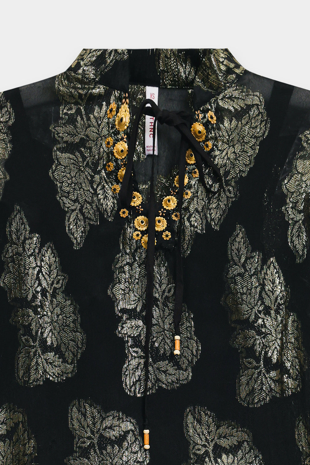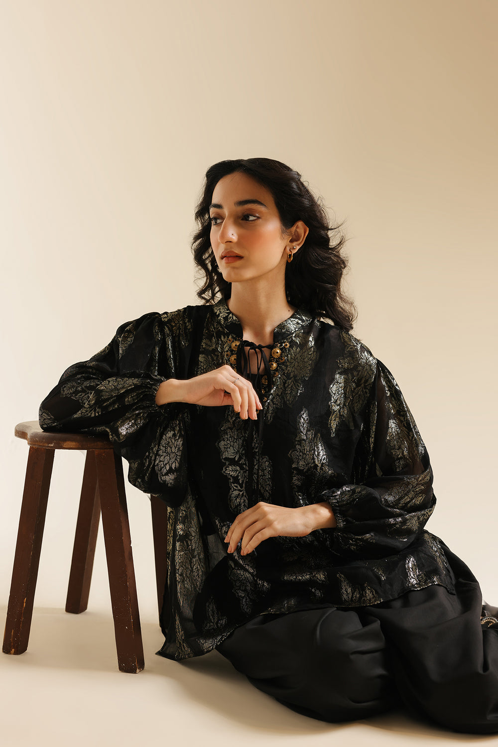 Embrace authentic cultural expression with this expertly crafted short top. Rendered in deep black color, it showcases meticulous motifs printed in embossed gold shade with traditional folk-art sensibilities. The garment features generously proportioned sleeves and an easy, unstructured fit that prioritizes comfort and movement. A decorative beaded neckline detail completes the piece. This top exemplifies refined artisanal construction, delivering a sophisticated interplay of high-contrast elements and time-honored techniques that elevate any wardrobe. It comes paired with an inner slip for a complete look that defines grace and style.