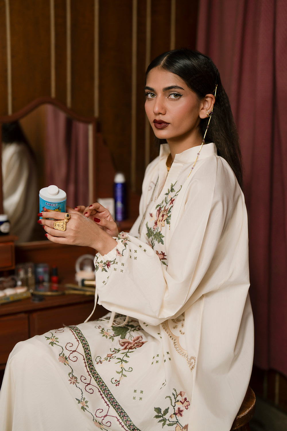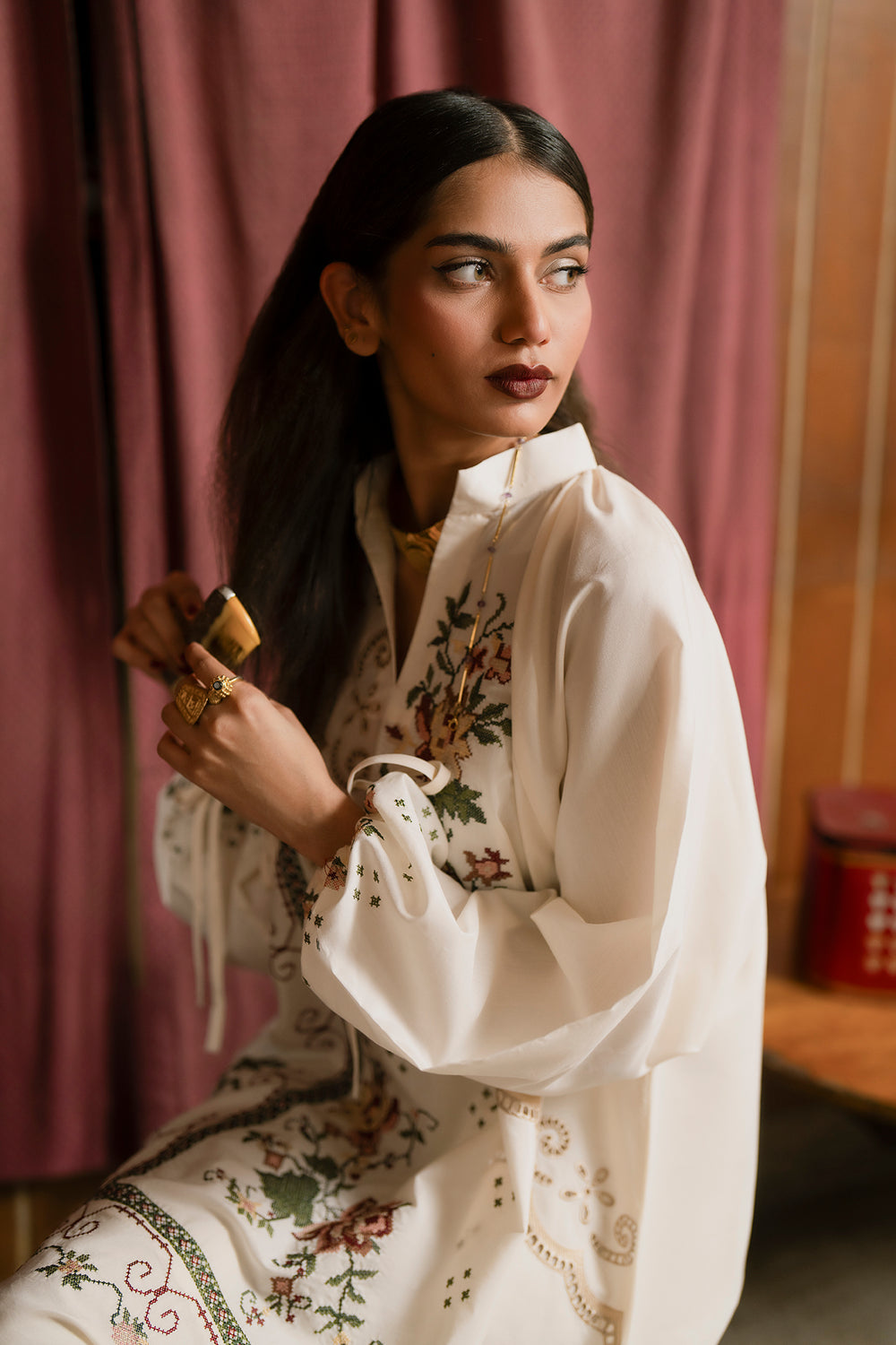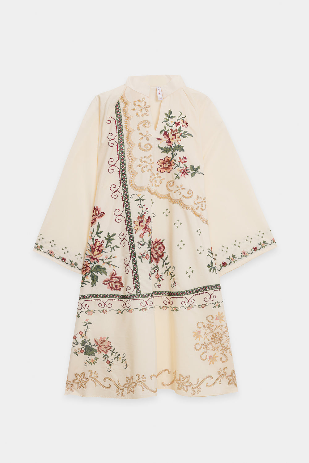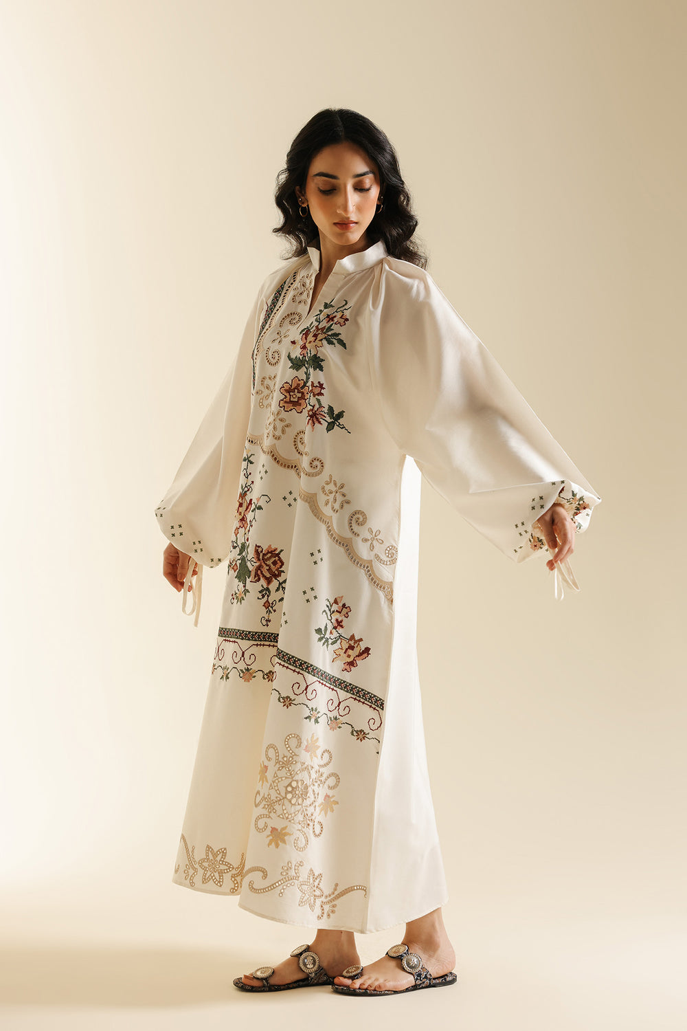 Elegantly flow through any occasion in this stunning dress. This relaxed-fit dress is crafted from a comfortable off-white fabric that serves as a beautiful canvas for its intricate work. The design features dense, multicolored floral embroidery in rich shades of pink, red, and green, concentrated across the chest and the lower hemline. The neckline boasts a delicate embroidery, while the hem is finished with a striking scalloped and open-cut work border. This piece is a perfect blend of comfort and elaborate craftsmanship, making it a beautiful choice for a sophisticated, relaxed look.