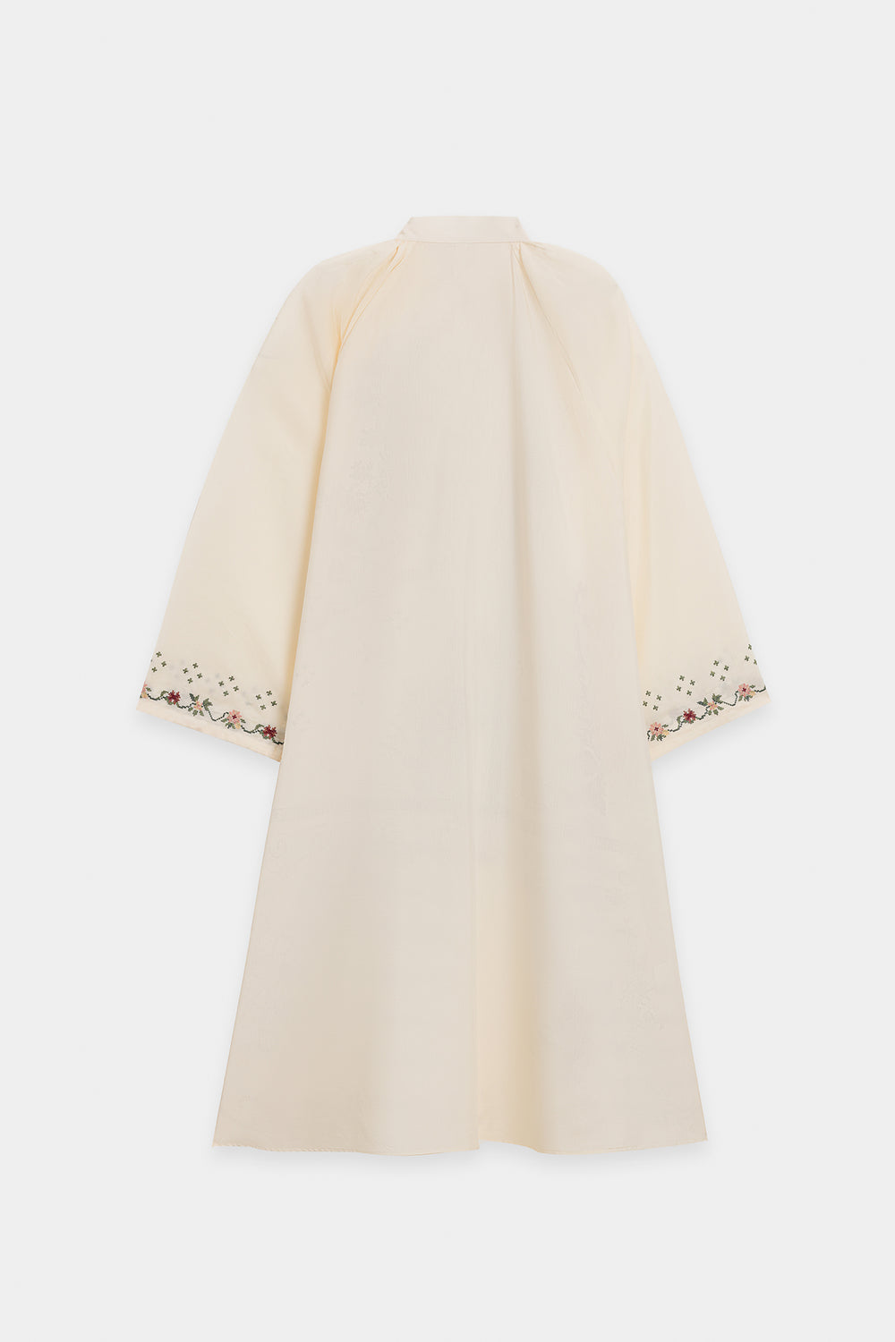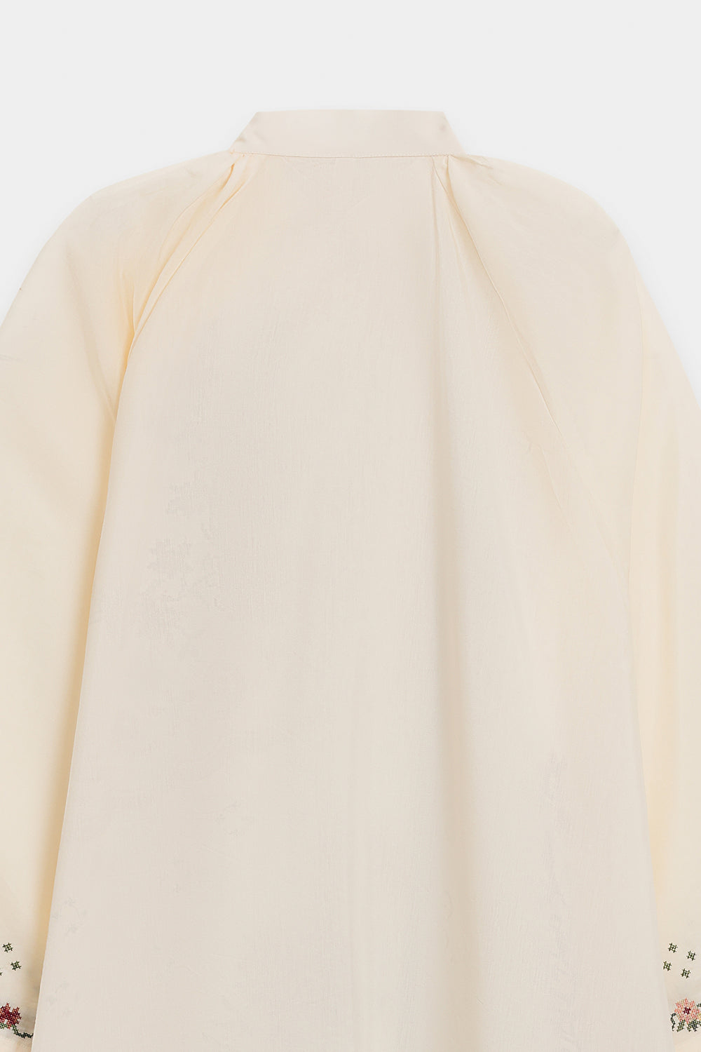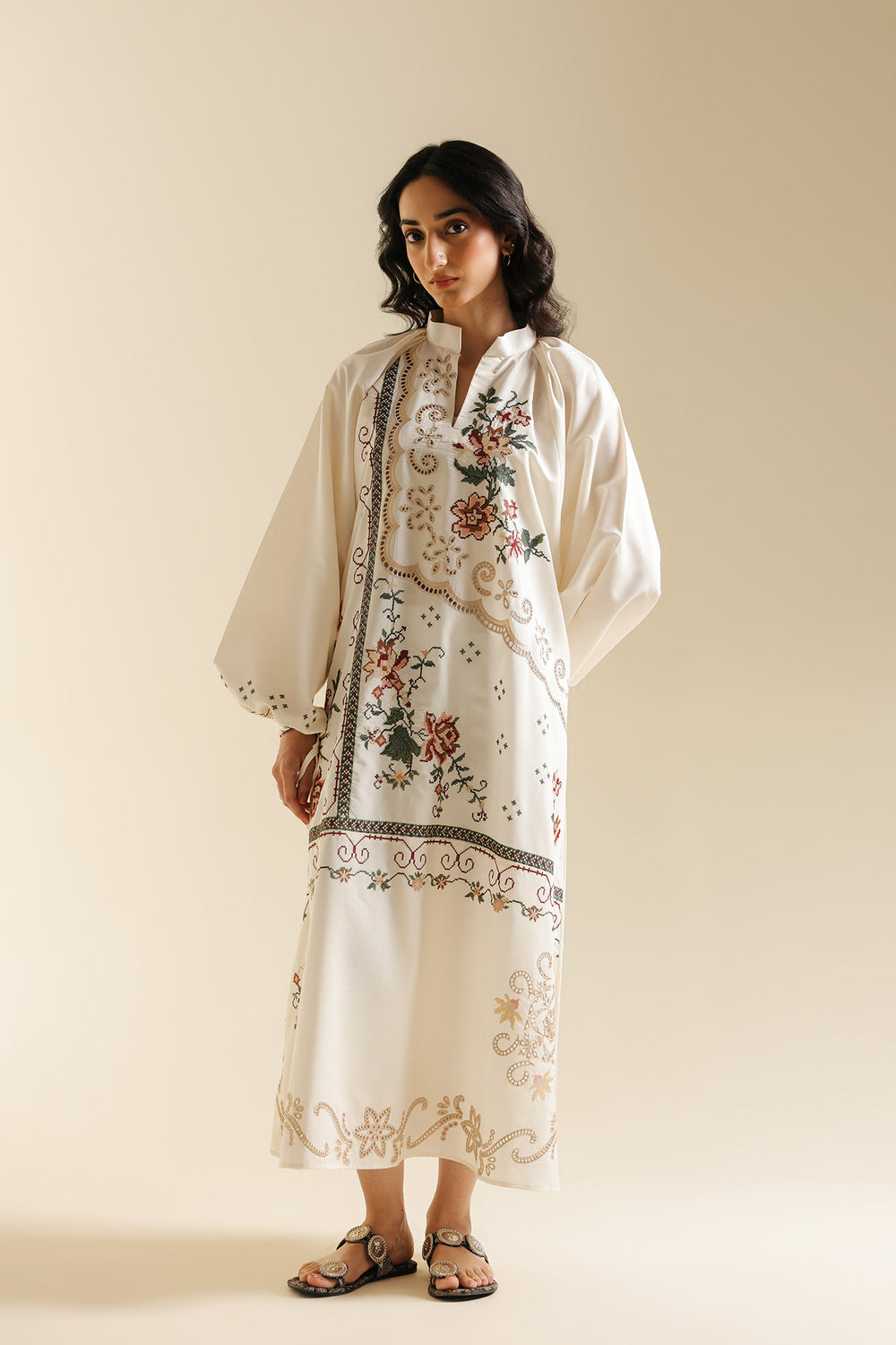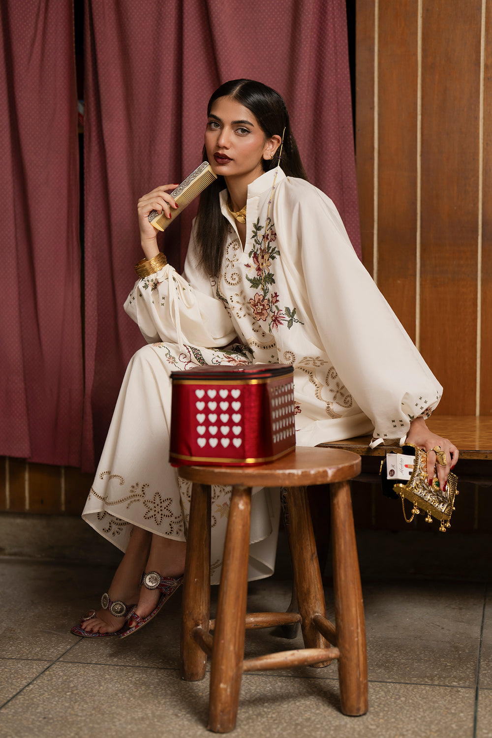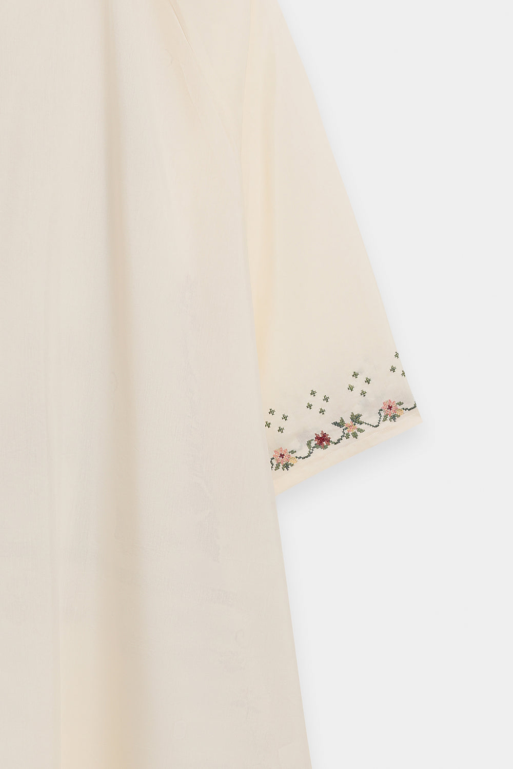 Elegantly flow through any occasion in this stunning dress. This relaxed-fit dress is crafted from a comfortable off-white fabric that serves as a beautiful canvas for its intricate work. The design features dense, multicolored floral embroidery in rich shades of pink, red, and green, concentrated across the chest and the lower hemline. The neckline boasts a delicate embroidery, while the hem is finished with a striking scalloped and open-cut work border. This piece is a perfect blend of comfort and elaborate craftsmanship, making it a beautiful choice for a sophisticated, relaxed look.