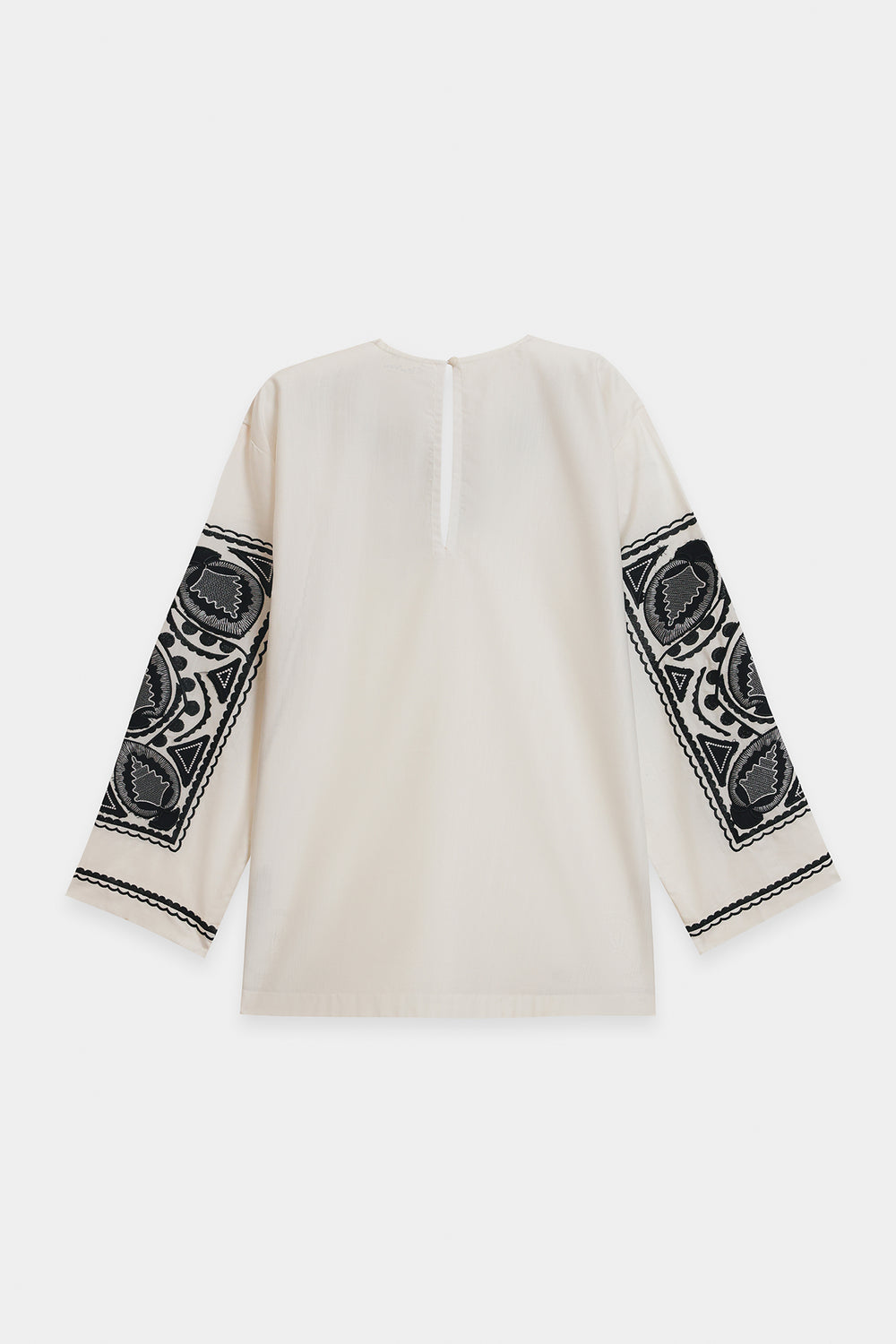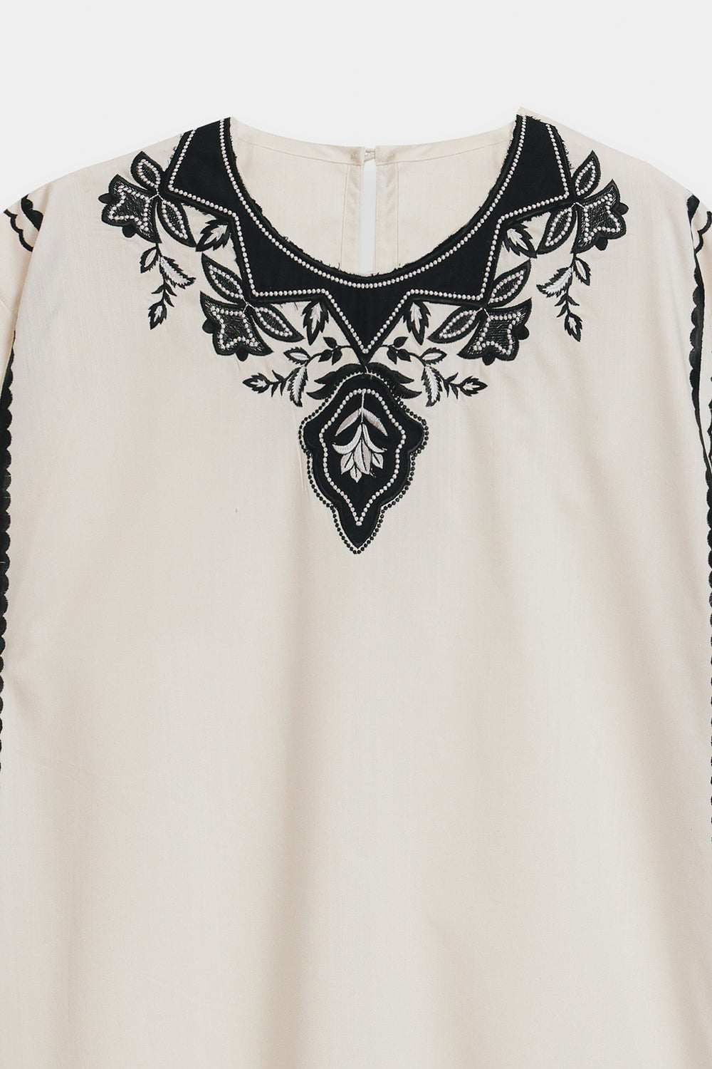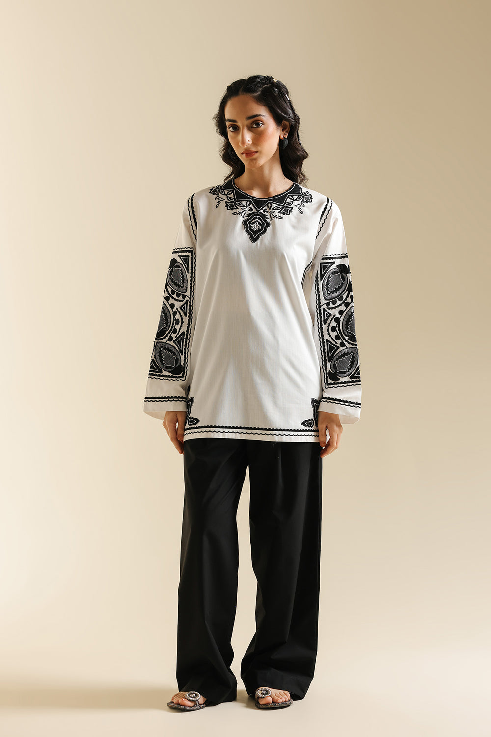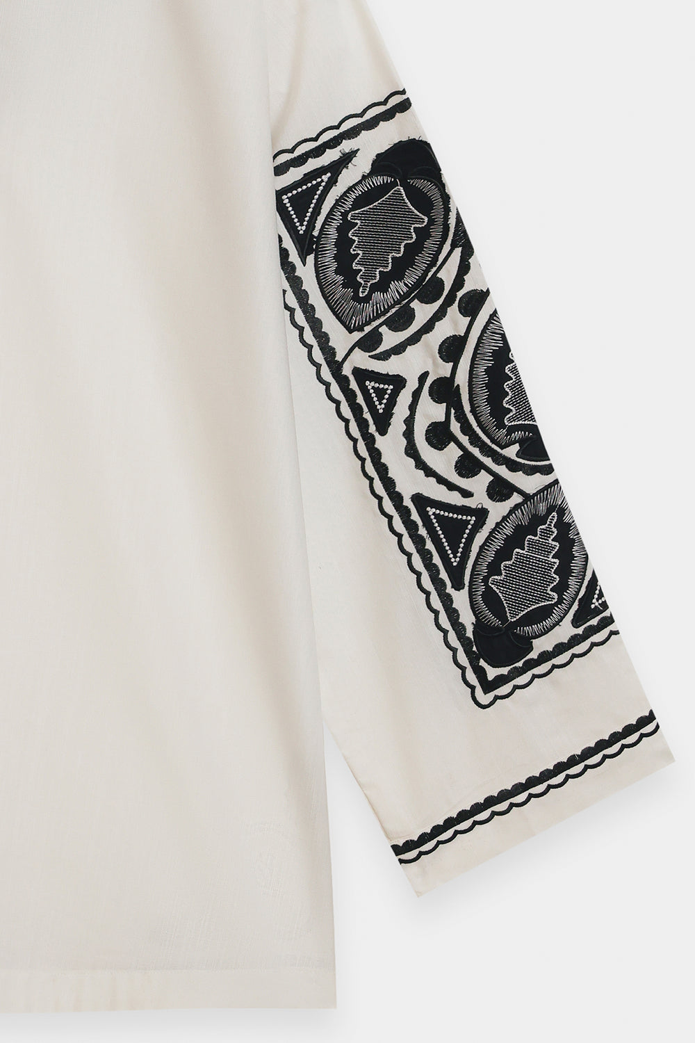 Project an image of bold cultural heritage with this striking top. This relaxed-fit top is crafted from a crisp white fabric and features dramatic, dense black embroidery. The embroidery is concentrated around the neckline and extends down the sleeves in powerful, geometric and ornamental motifs, giving it a striking, almost tribal aesthetic. A bold black trim borders the hemline, enhancing the high-contrast look. Styled with wide black trouser, this top creates a modern, monochromatic statement that champions bold pattern and comfortable tailoring.