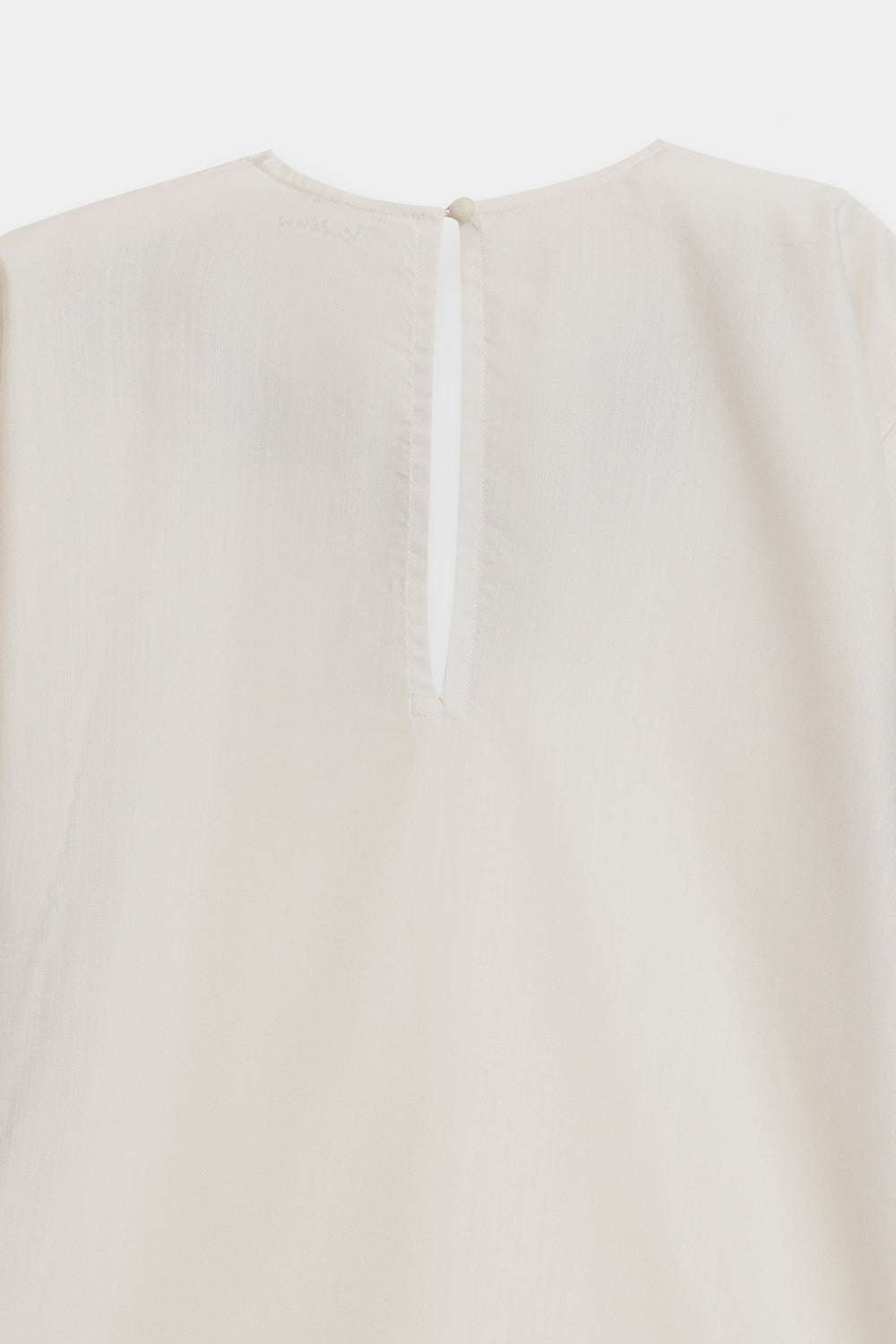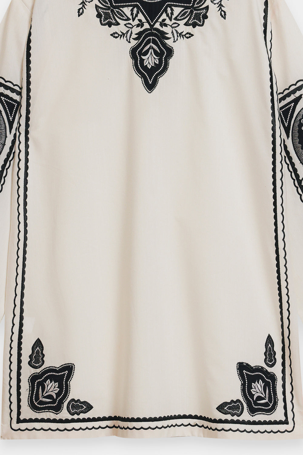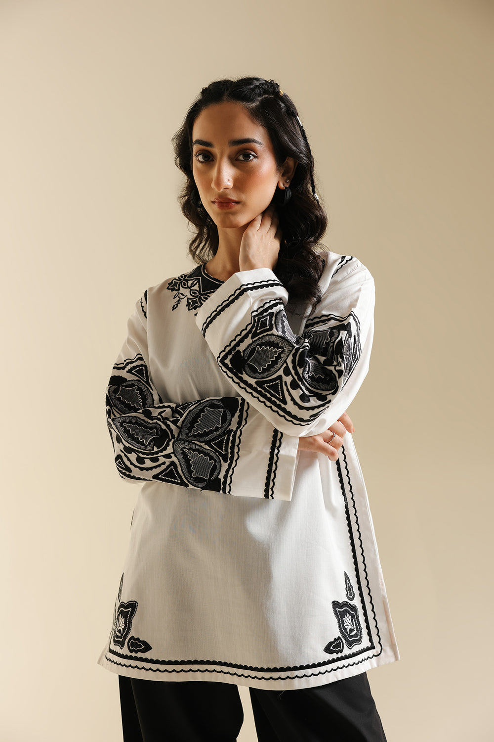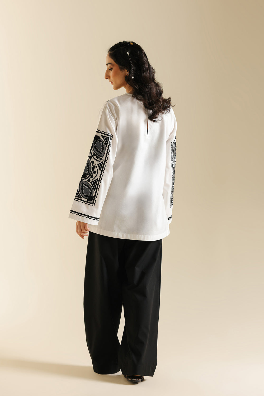 Project an image of bold cultural heritage with this striking top. This relaxed-fit top is crafted from a crisp white fabric and features dramatic, dense black embroidery. The embroidery is concentrated around the neckline and extends down the sleeves in powerful, geometric and ornamental motifs, giving it a striking, almost tribal aesthetic. A bold black trim borders the hemline, enhancing the high-contrast look. Styled with wide black trouser, this top creates a modern, monochromatic statement that champions bold pattern and comfortable tailoring.