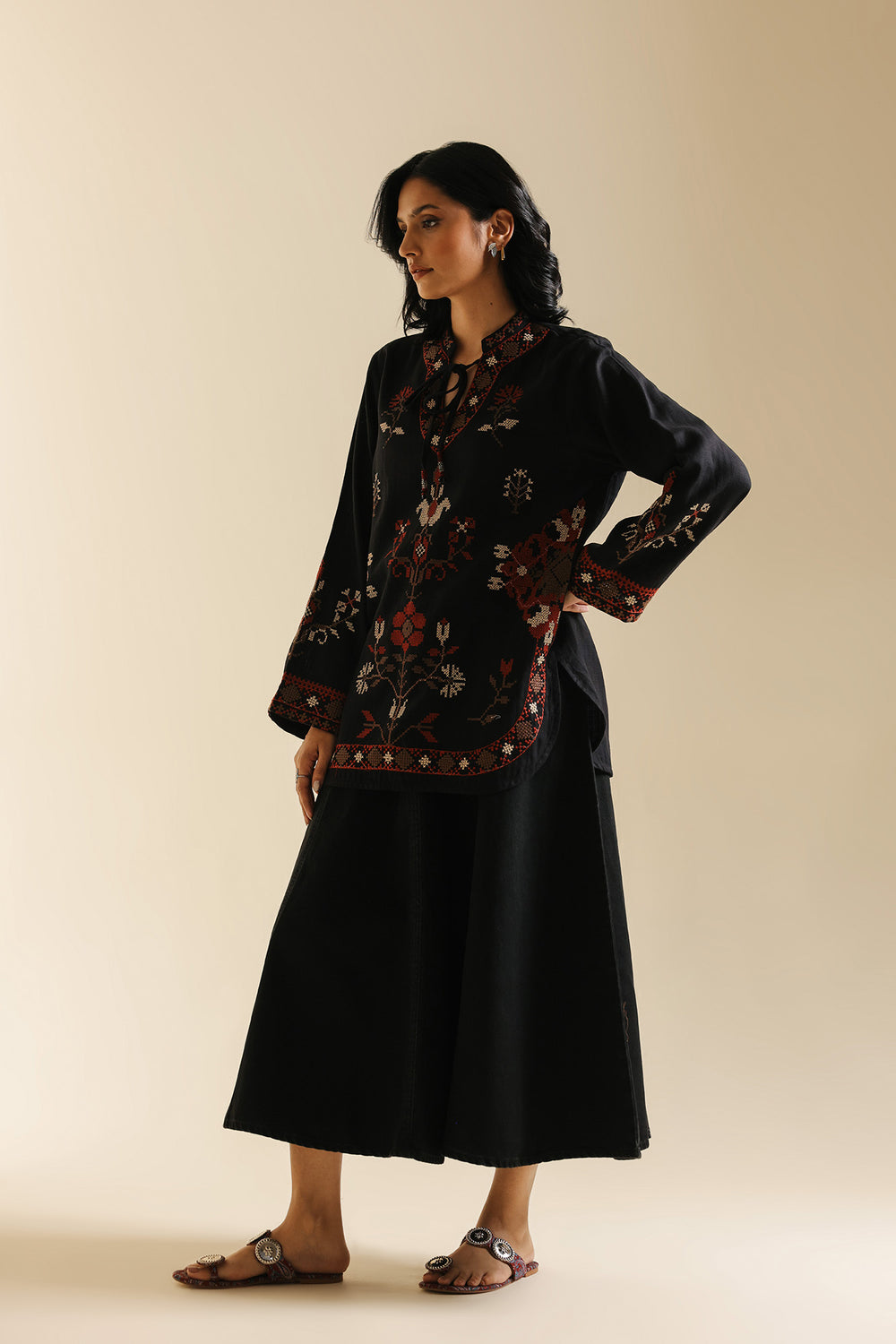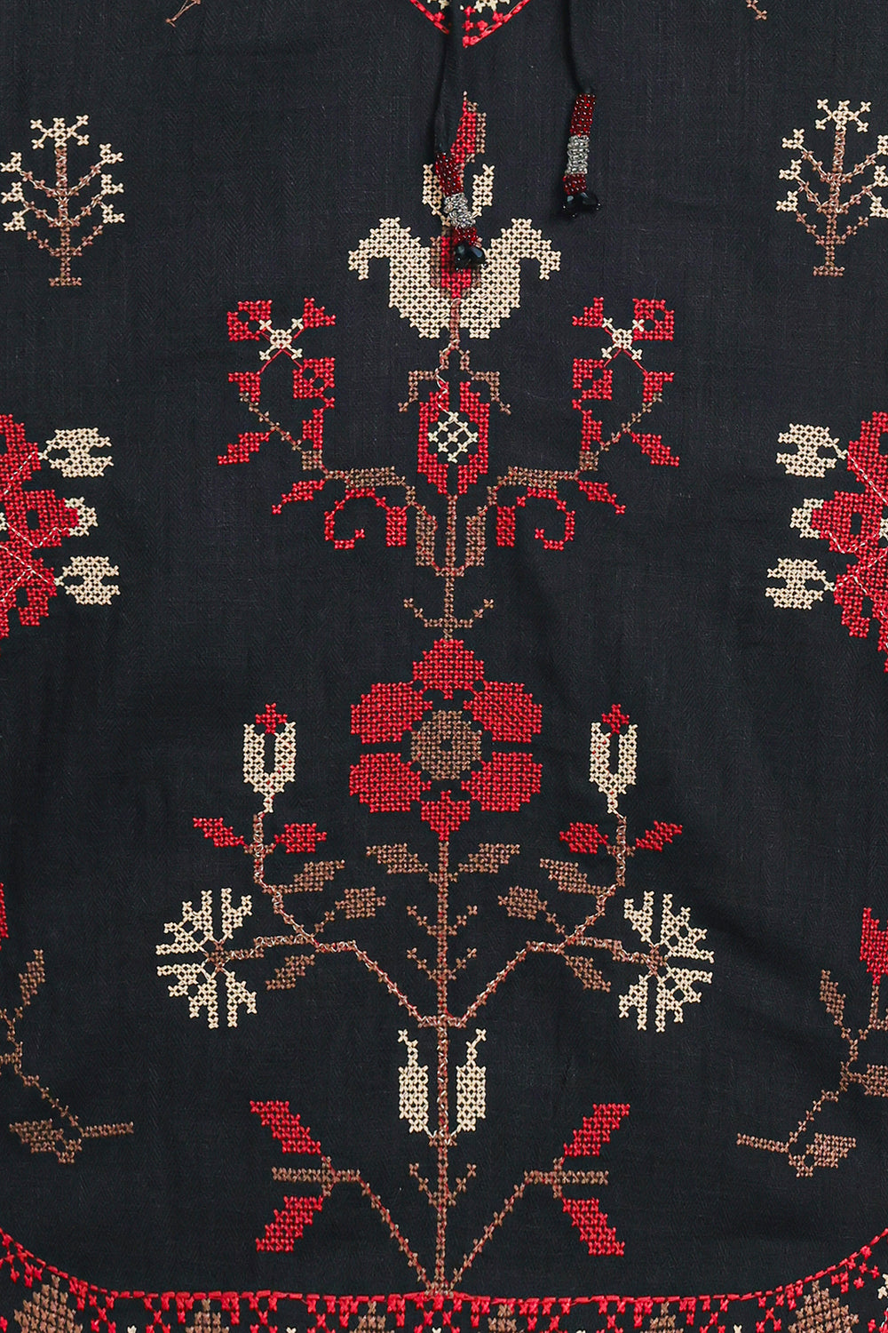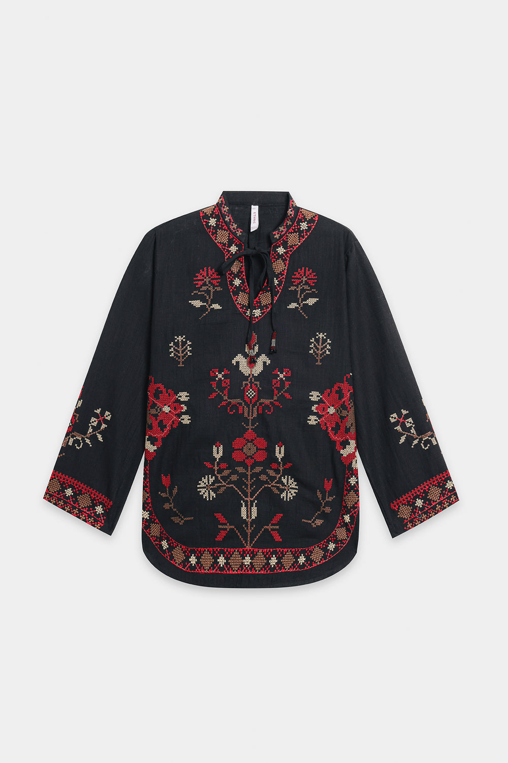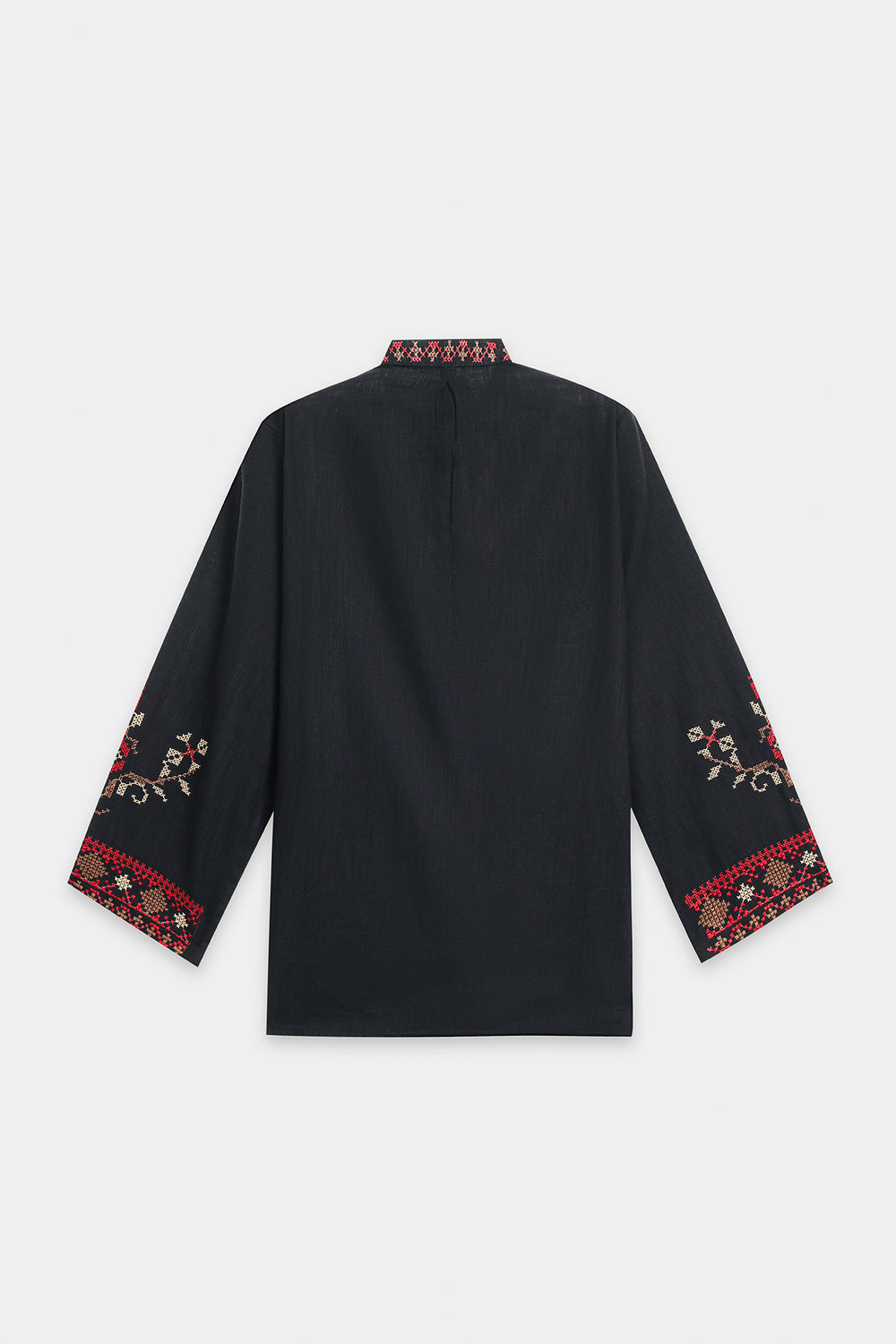 Showcase the richness of traditional artistry with this captivating black embroidered top. This exquisite piece is crafted from a sophisticated black fabric, offering a beautiful canvas for the detailed embellishment. The top is generously adorned with intricate red, black, and earthy-toned floral and geometric embroidery that covers the front yoke, extending down the chest and cuffs. Featuring a relaxed, slightly long-line silhouette, a ban neck with a delicate tie closure, and comfortable full-length sleeves, this top beautifully merges comfort with a highly detailed, celebratory aesthetic, making it an ideal choice for pairing with a solid skirt or trousers.