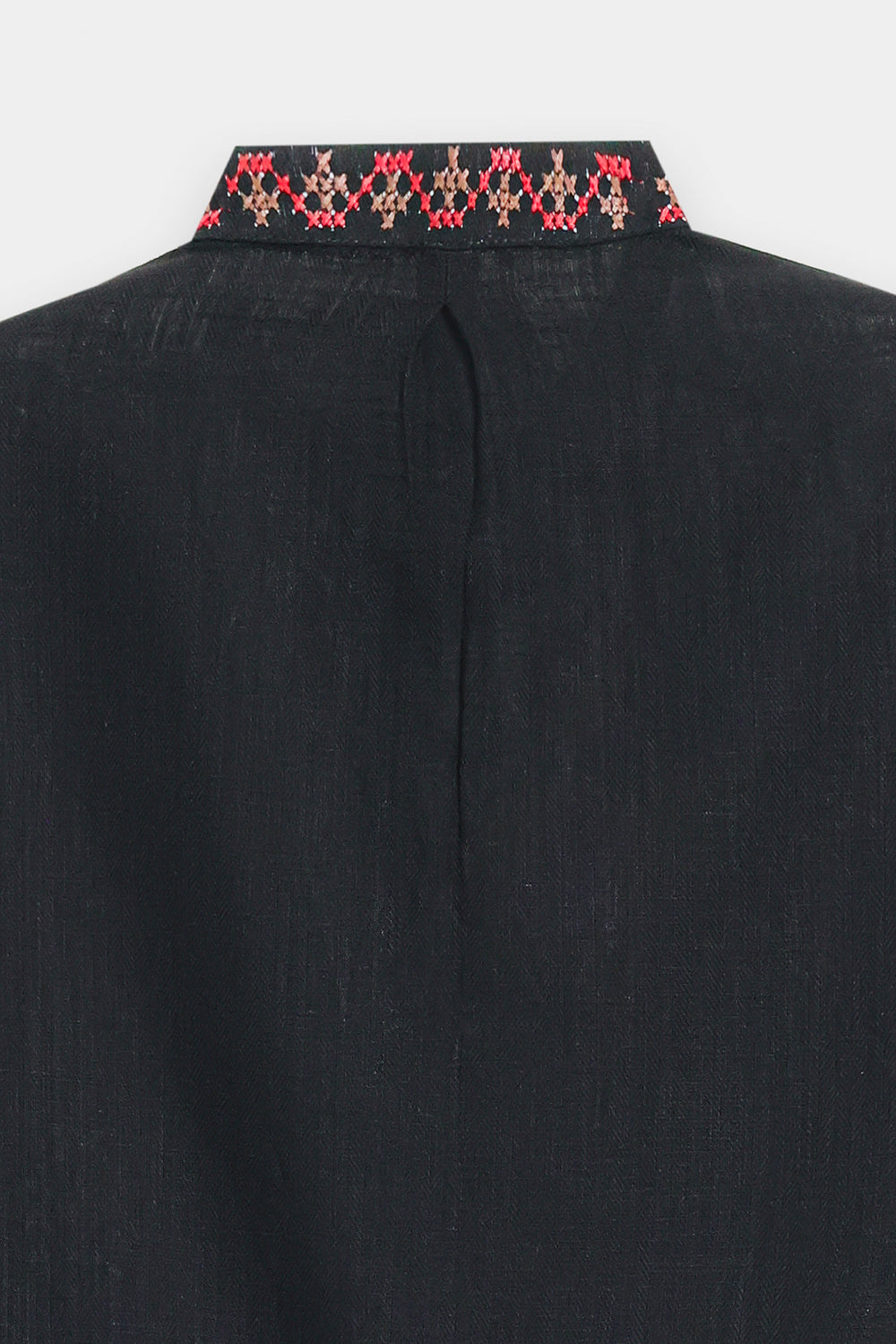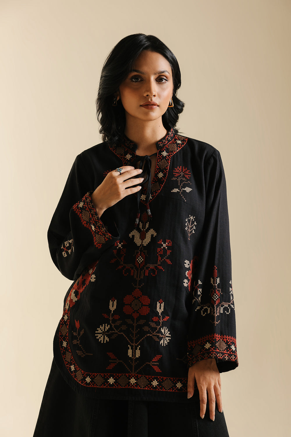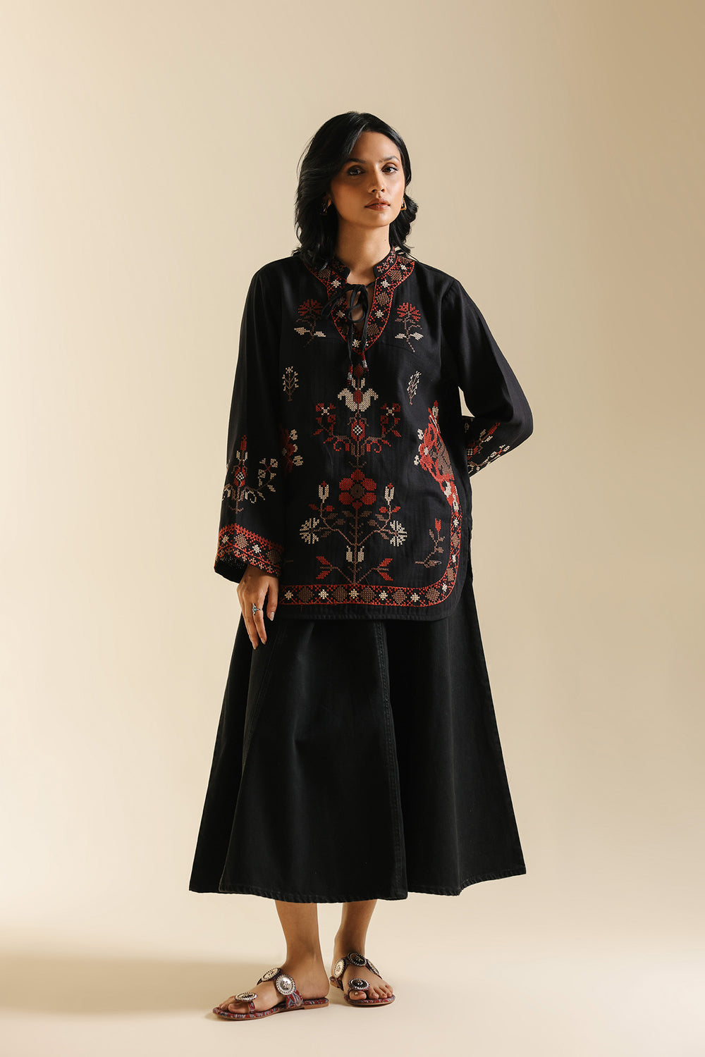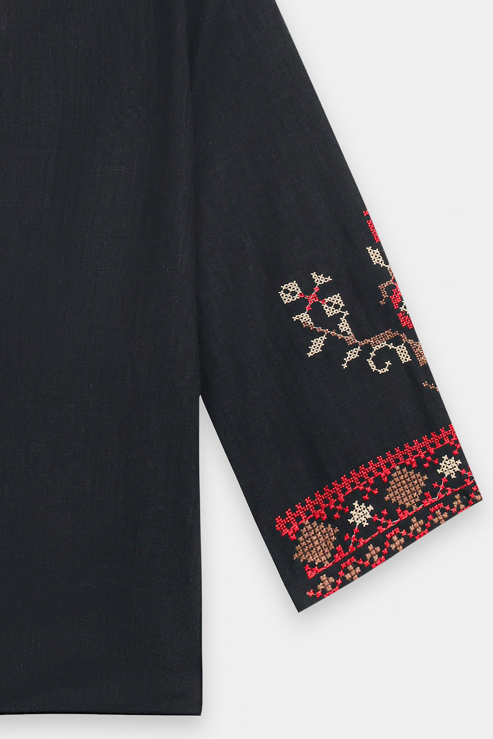 Showcase the richness of traditional artistry with this captivating black embroidered top. This exquisite piece is crafted from a sophisticated black fabric, offering a beautiful canvas for the detailed embellishment. The top is generously adorned with intricate red, black, and earthy-toned floral and geometric embroidery that covers the front yoke, extending down the chest and cuffs. Featuring a relaxed, slightly long-line silhouette, a ban neck with a delicate tie closure, and comfortable full-length sleeves, this top beautifully merges comfort with a highly detailed, celebratory aesthetic, making it an ideal choice for pairing with a solid skirt or trousers.