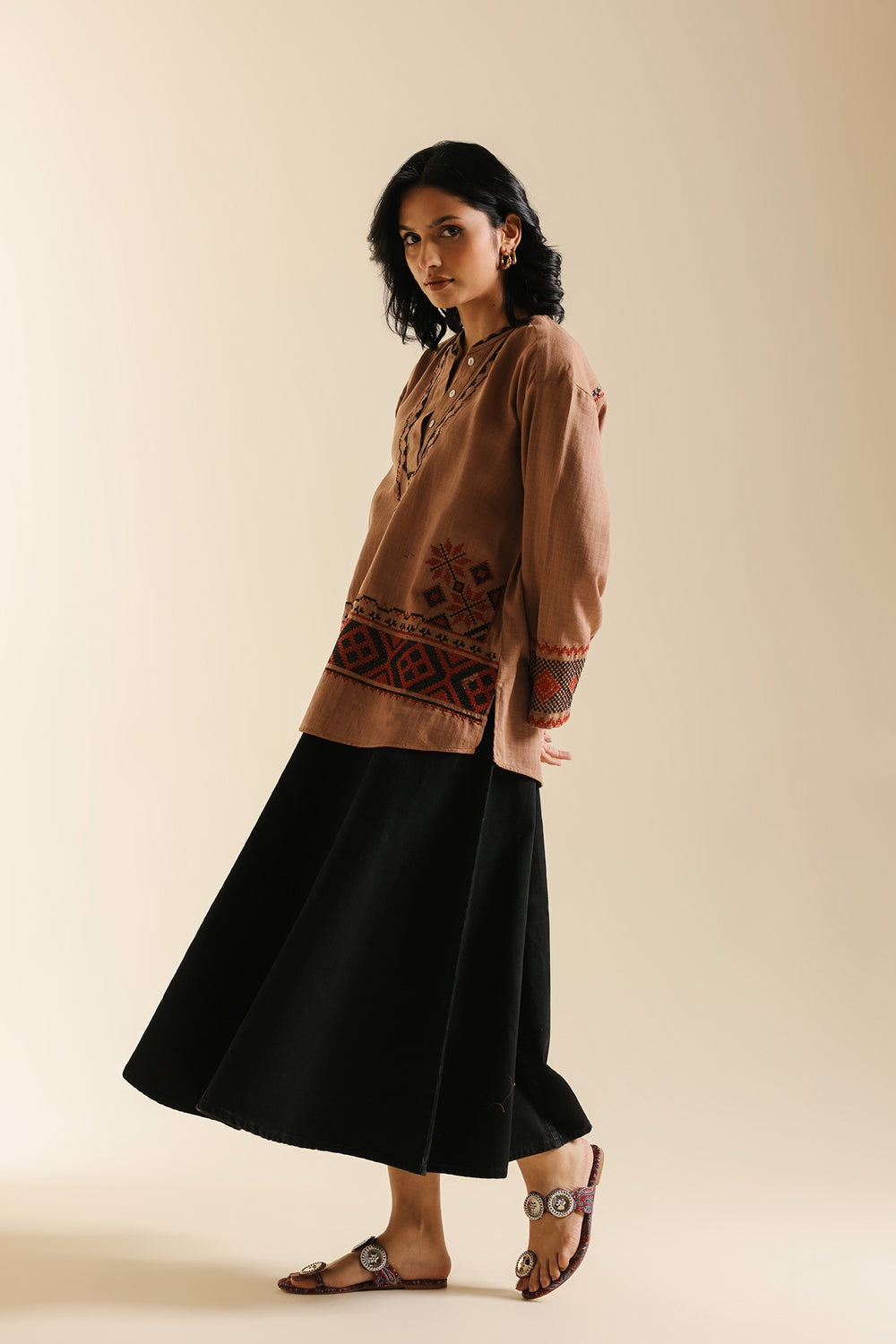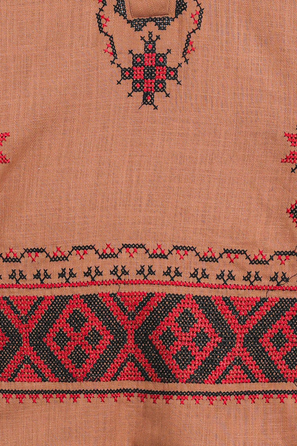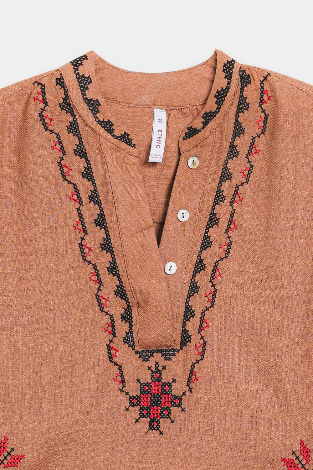 Embrace the warmth of artisanal design with this captivating chocolate brown embroidered woven top. Crafted from a soft, textured woven fabric in a rich, earthy shade, this tunic-style shirt offers a relaxed and comfortable silhouette that drapes beautifully. The piece is meticulously adorned with intricate geometric and tribal-inspired embroidery in deep red, black, and cream threads. This detailed work frames the V-neckline and button accents, and features a prominent, eye-catching embroidered band across the waist and wide, full-length cuffs. With its flowing sleeves and classic details, this top is a perfect blend of traditional craftsmanship and modern bohemian style, making it an ideal choice for a stylish, laid-back look.