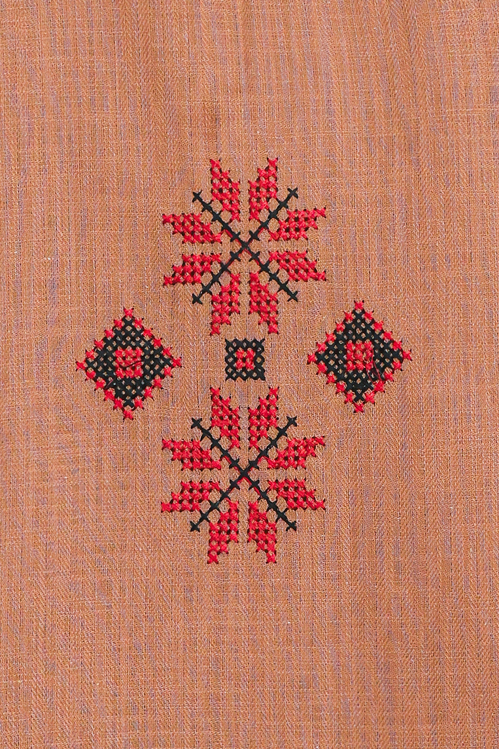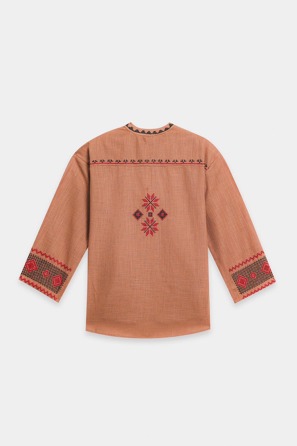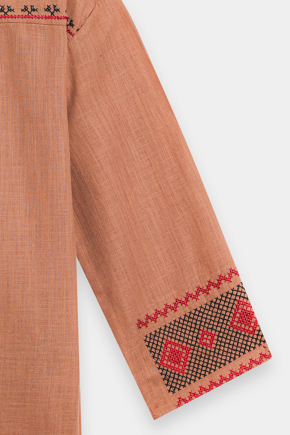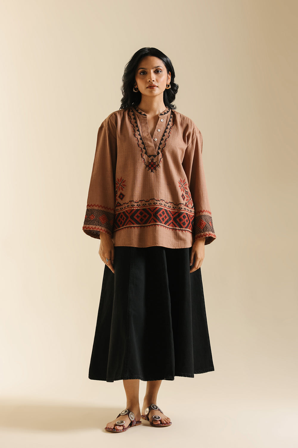 Embrace the warmth of artisanal design with this captivating chocolate brown embroidered woven top. Crafted from a soft, textured woven fabric in a rich, earthy shade, this tunic-style shirt offers a relaxed and comfortable silhouette that drapes beautifully. The piece is meticulously adorned with intricate geometric and tribal-inspired embroidery in deep red, black, and cream threads. This detailed work frames the V-neckline and button accents, and features a prominent, eye-catching embroidered band across the waist and wide, full-length cuffs. With its flowing sleeves and classic details, this top is a perfect blend of traditional craftsmanship and modern bohemian style, making it an ideal choice for a stylish, laid-back look.