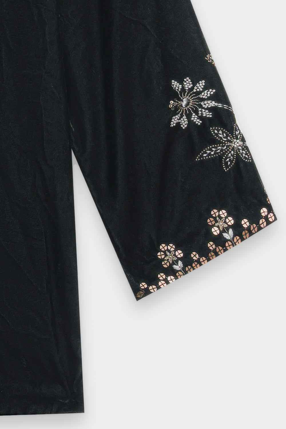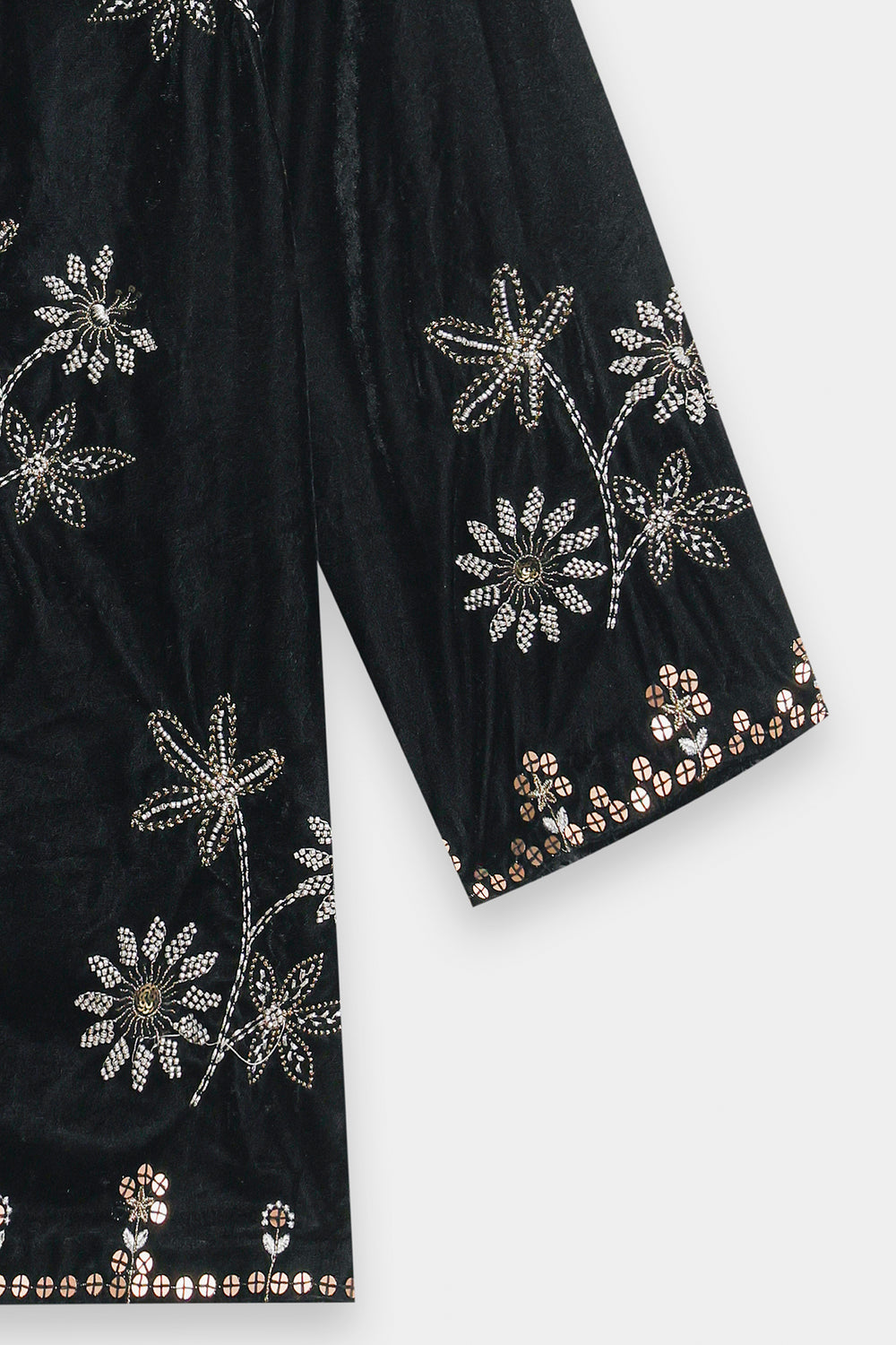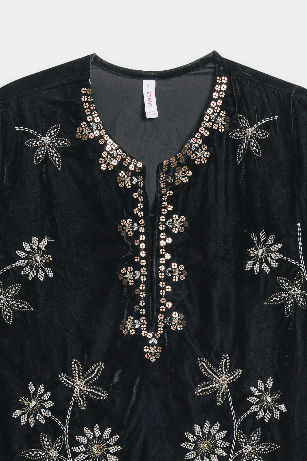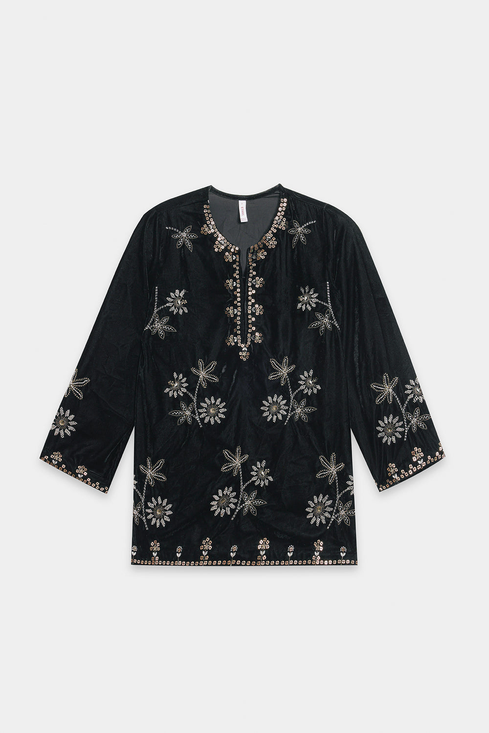 Indulge in luxurious sophistication with this stunning black velvet top. The rich fabric provides an elegant canvas for intricate silver and gold embroidery that dances across the front in delicate daisy and floral motifs. The V-neckline features a graceful center placket adorned with continuous embroidery, creating a refined focal point that draws the eye downward. Long sleeves and a relaxed, straight silhouette ensure comfort while maintaining an elevated aesthetic. Perfect for special occasions, festive celebrations, or anyone seeking to make a refined, memorable impression.