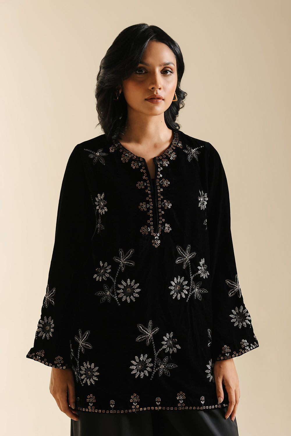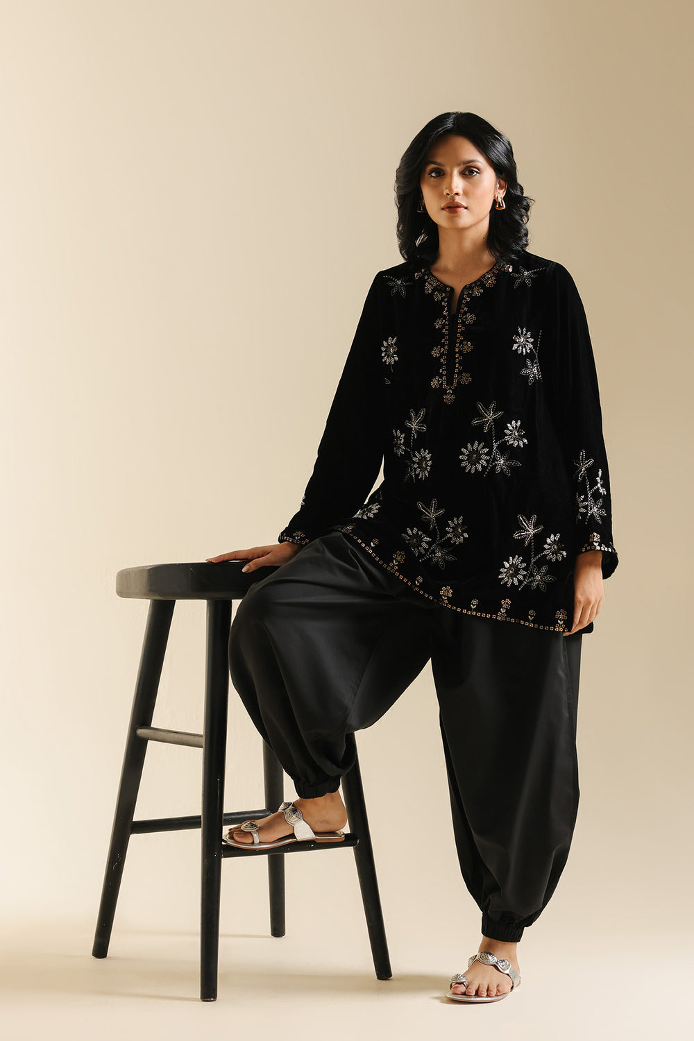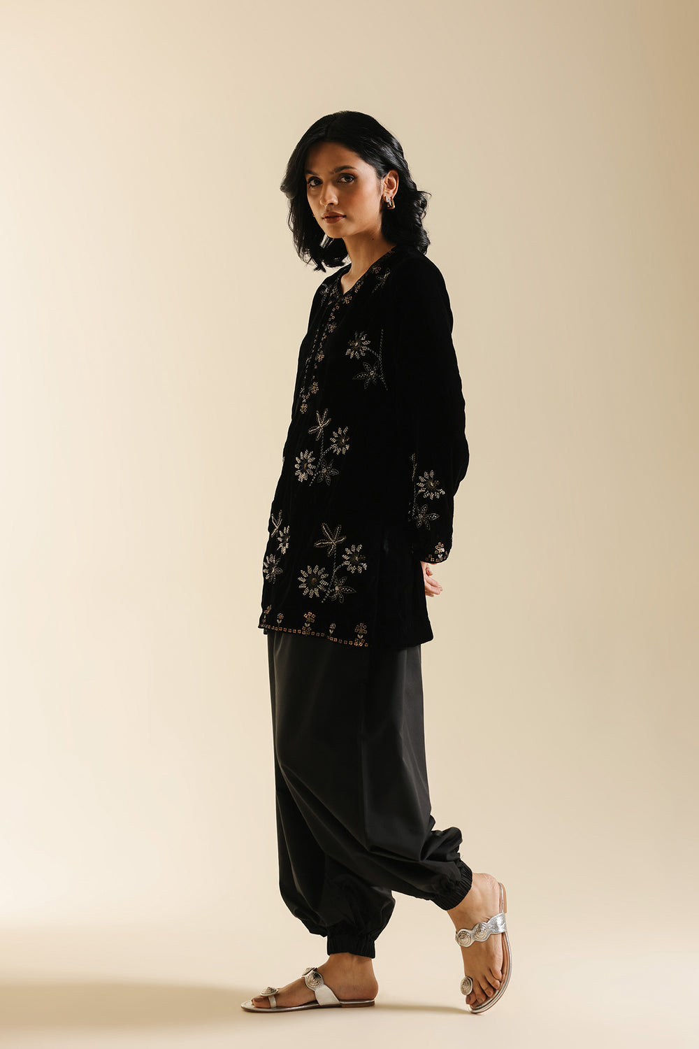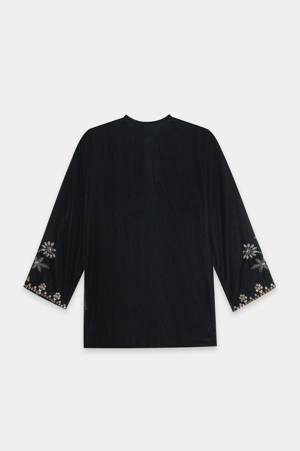 Indulge in luxurious sophistication with this stunning black velvet top. The rich fabric provides an elegant canvas for intricate silver and gold embroidery that dances across the front in delicate daisy and floral motifs. The V-neckline features a graceful center placket adorned with continuous embroidery, creating a refined focal point that draws the eye downward. Long sleeves and a relaxed, straight silhouette ensure comfort while maintaining an elevated aesthetic. Perfect for special occasions, festive celebrations, or anyone seeking to make a refined, memorable impression.