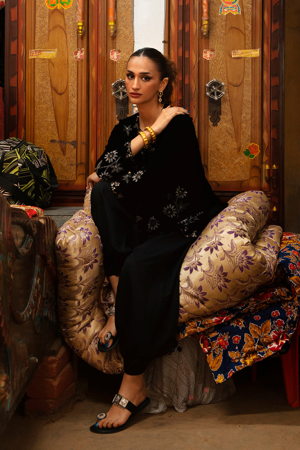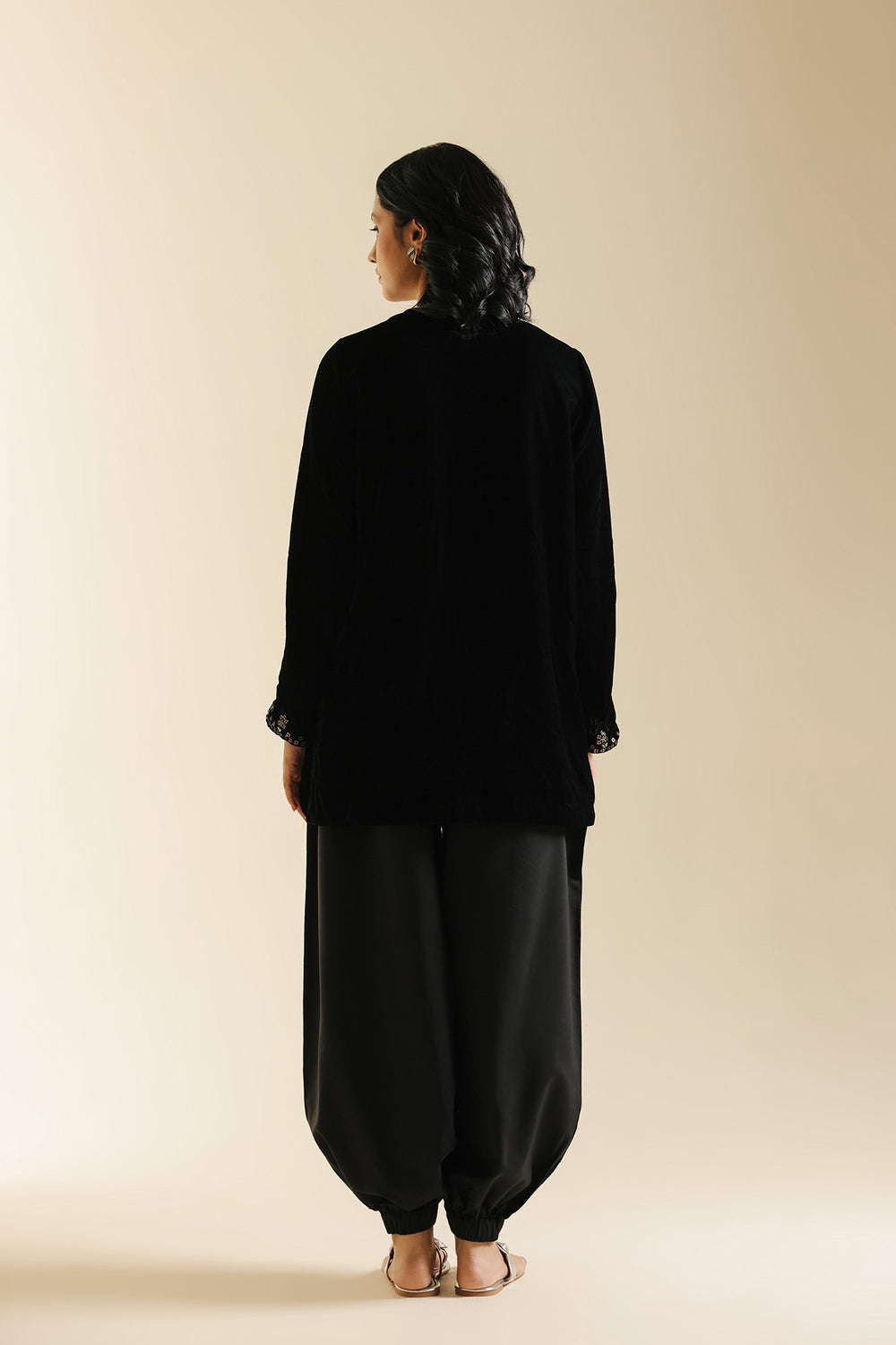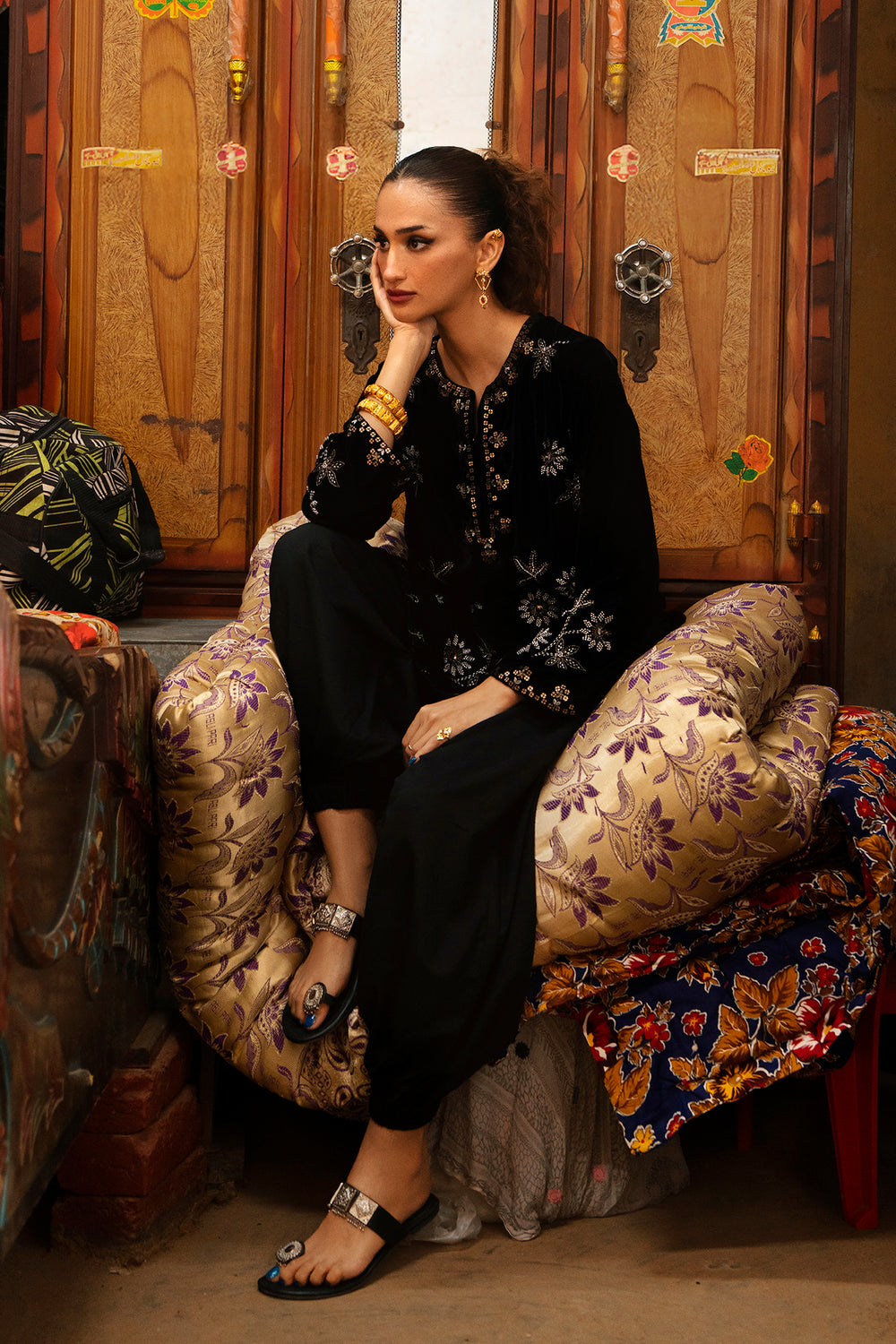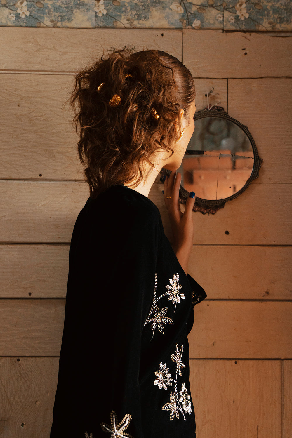 Indulge in luxurious sophistication with this stunning black velvet top. The rich fabric provides an elegant canvas for intricate silver and gold embroidery that dances across the front in delicate daisy and floral motifs. The V-neckline features a graceful center placket adorned with continuous embroidery, creating a refined focal point that draws the eye downward. Long sleeves and a relaxed, straight silhouette ensure comfort while maintaining an elevated aesthetic. Perfect for special occasions, festive celebrations, or anyone seeking to make a refined, memorable impression.
