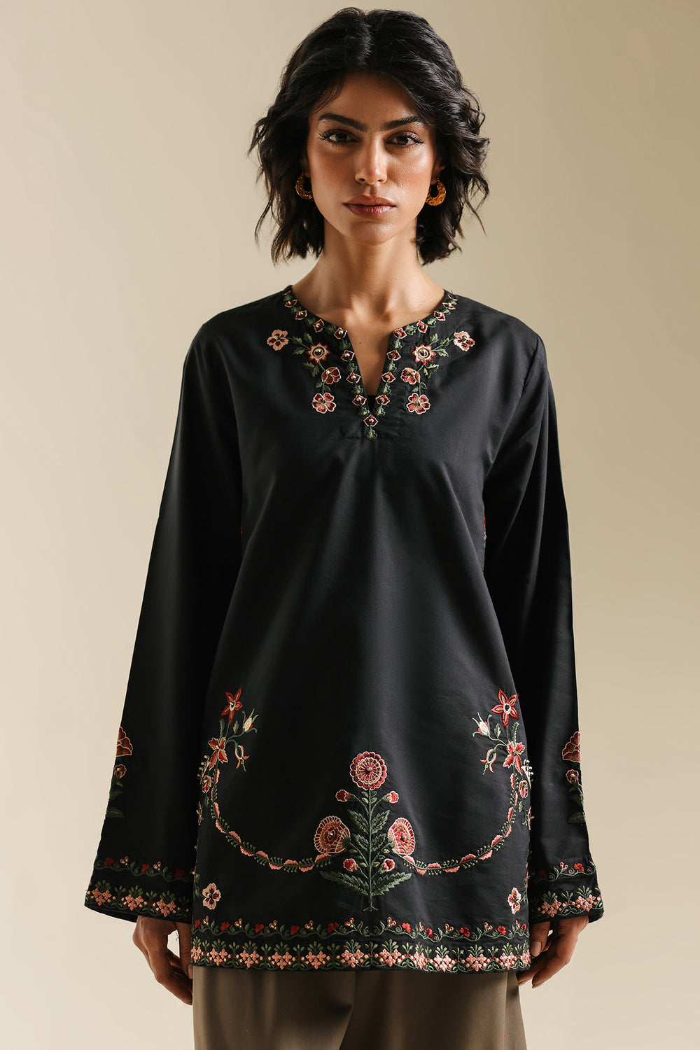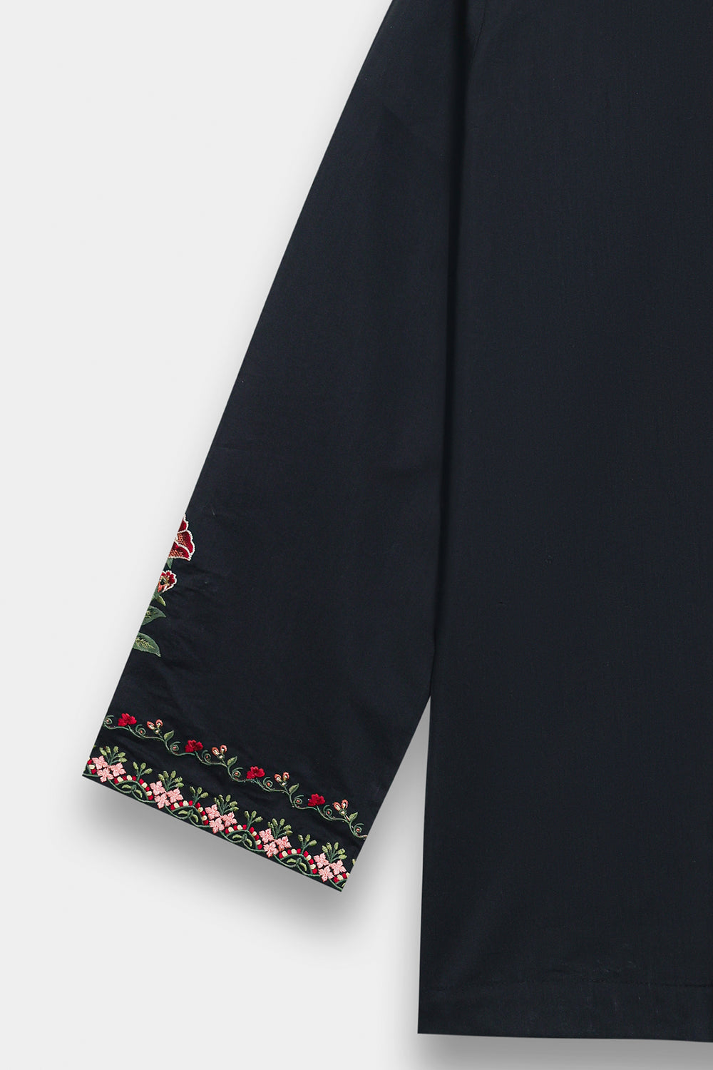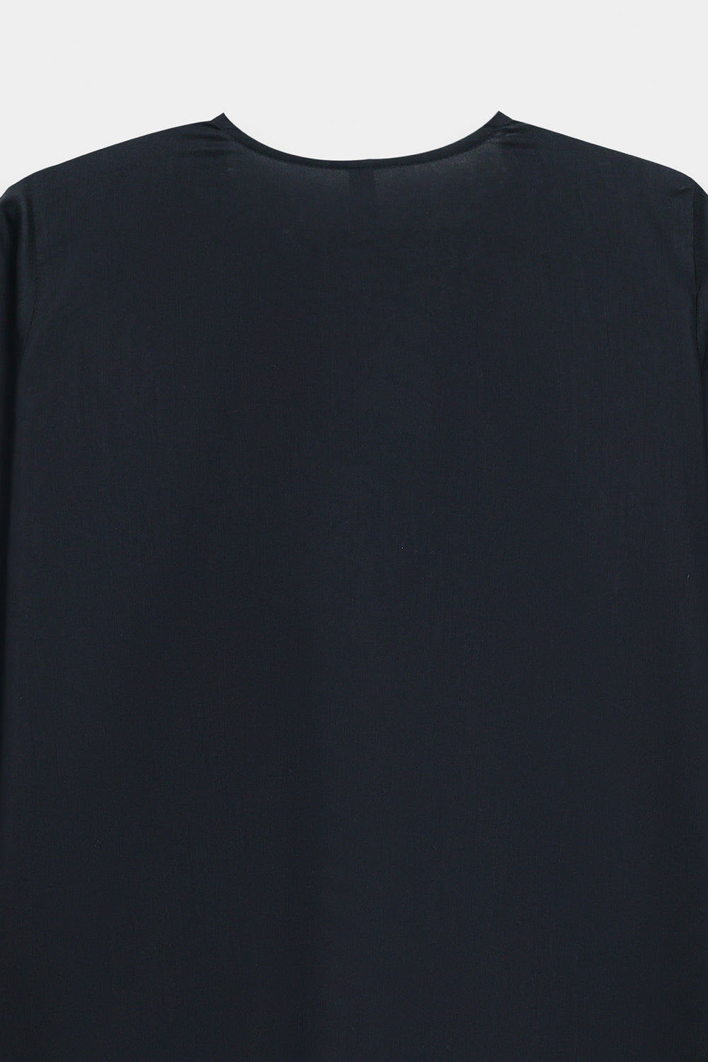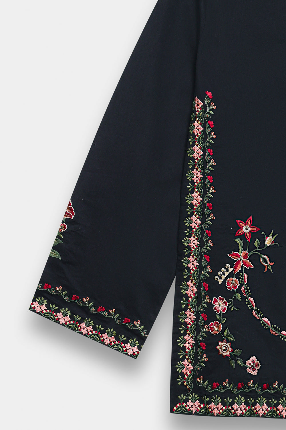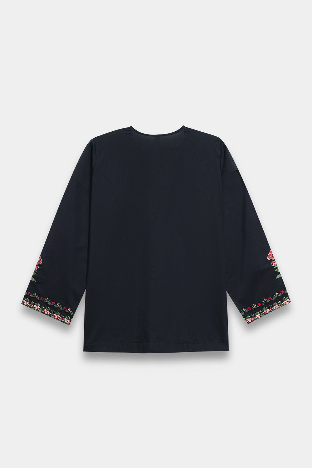 This elegant jet black kurti brings together quality craftsmanship and timeless style. Made from premium fabric with a soft sheen, it features a classic V-split neckline with detailed multi-embroidery work. Intricate floral and vine patterns decorate the bodice and hemline, adding a graceful shimmer to the piece. The straight-cut design and embellished border create a polished look that works for any formal occasion. Wear it on its own for a clean aesthetic or layer it for added dimension—a versatile choice that never goes out of style.