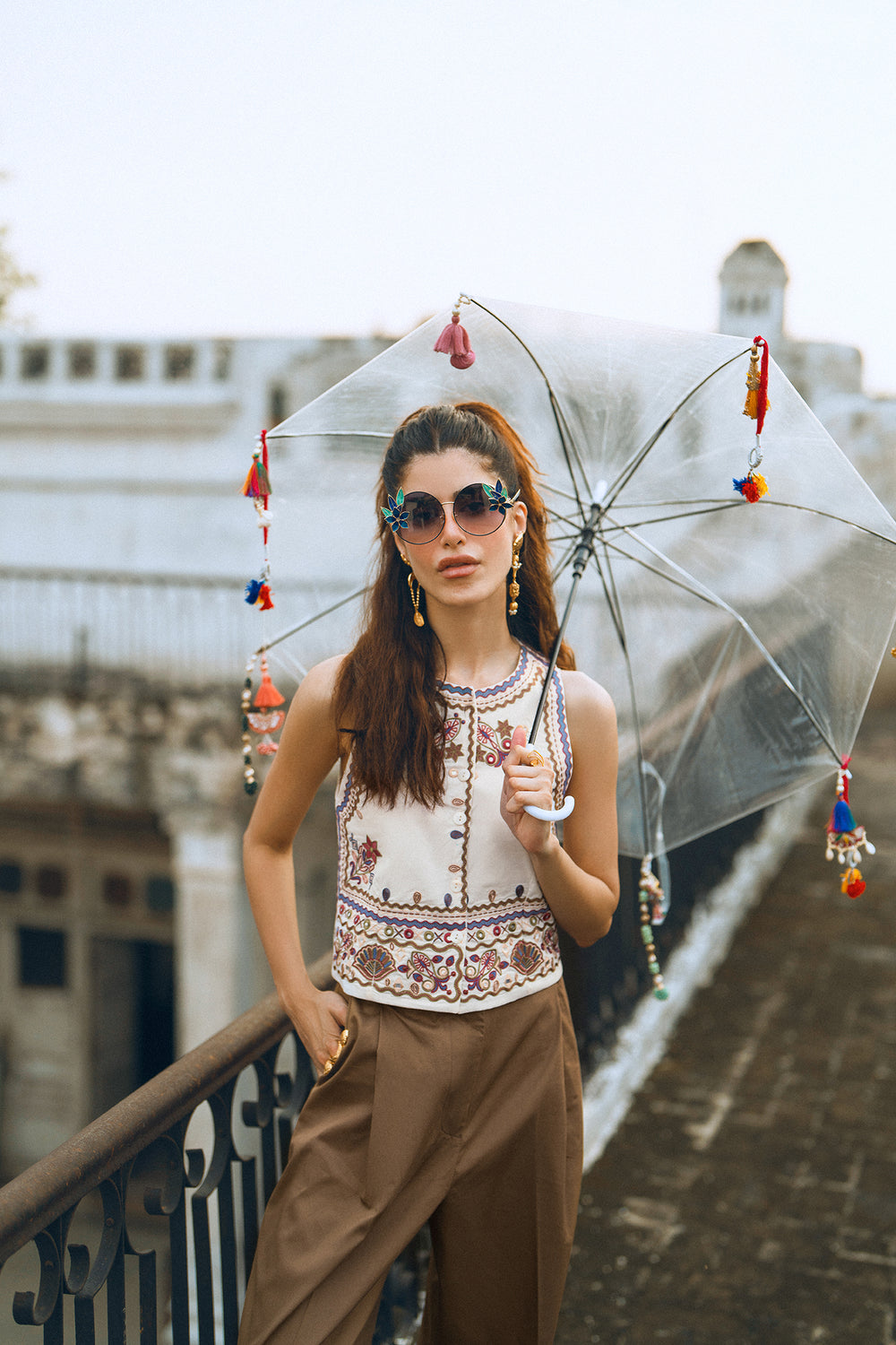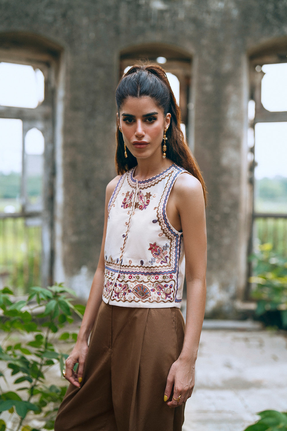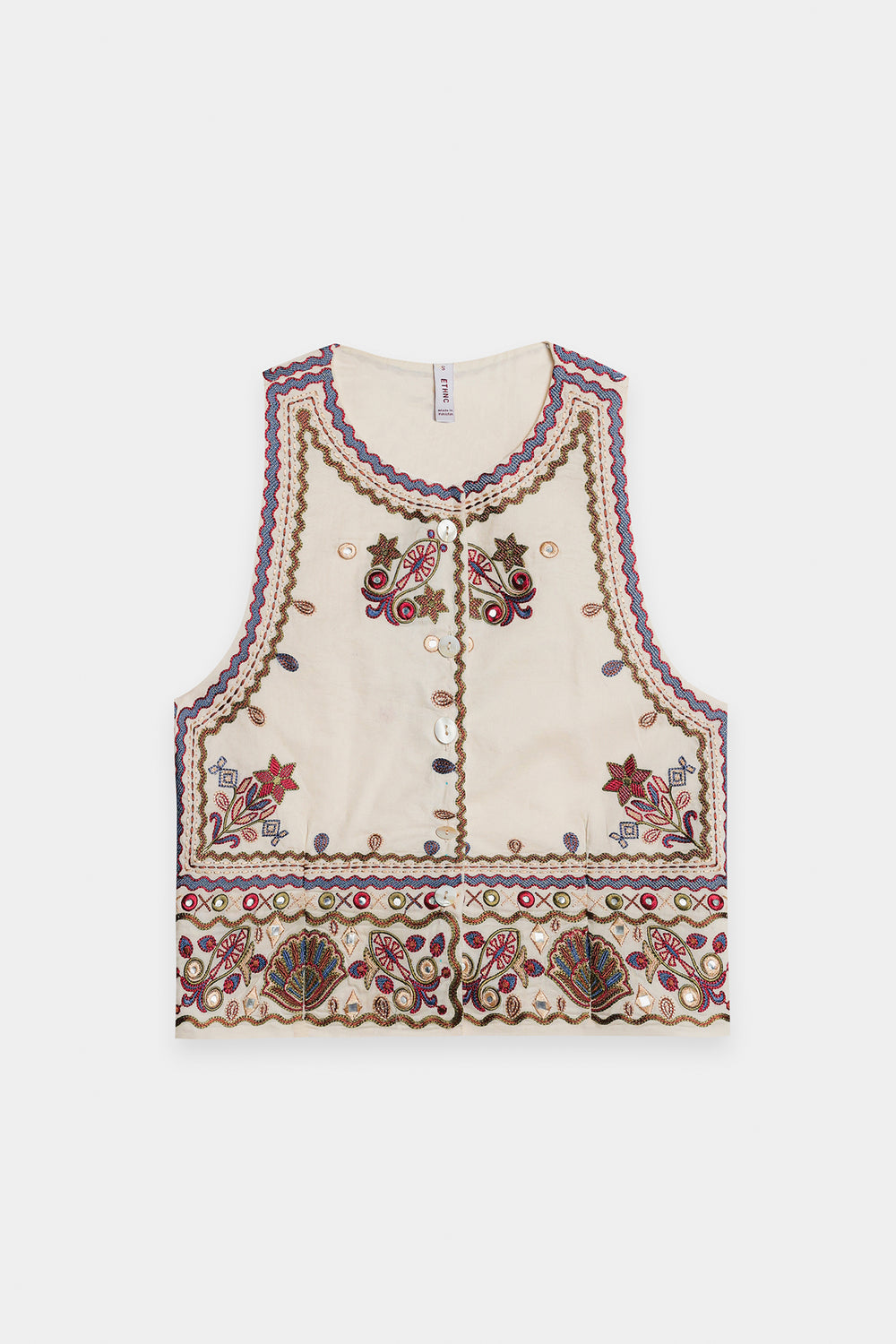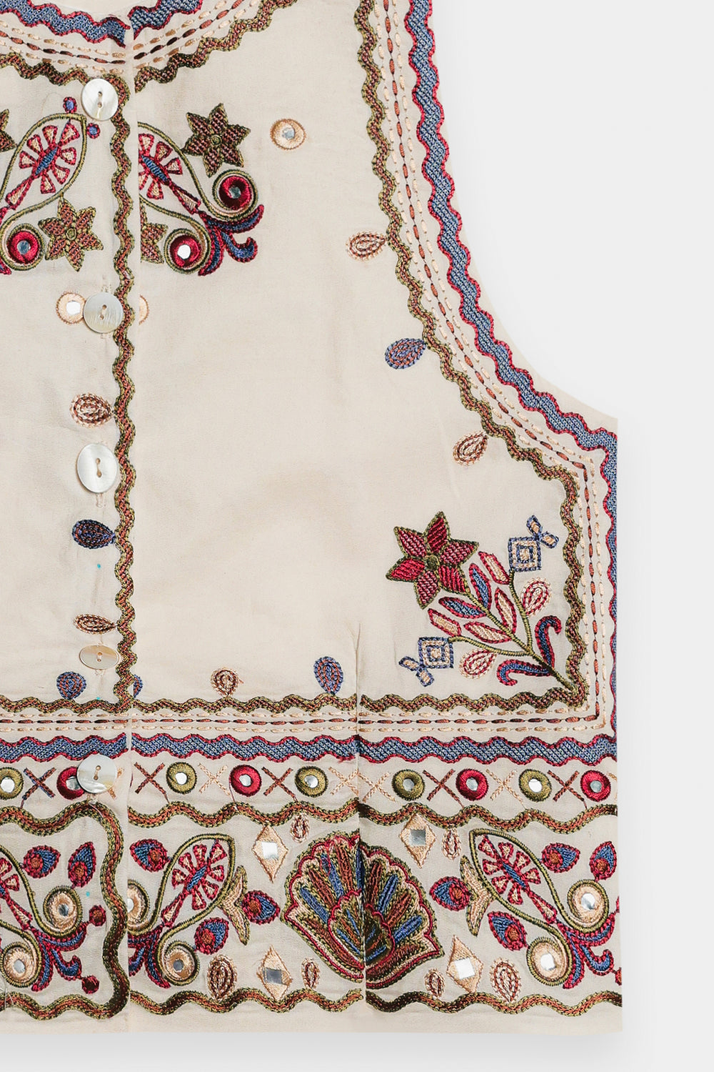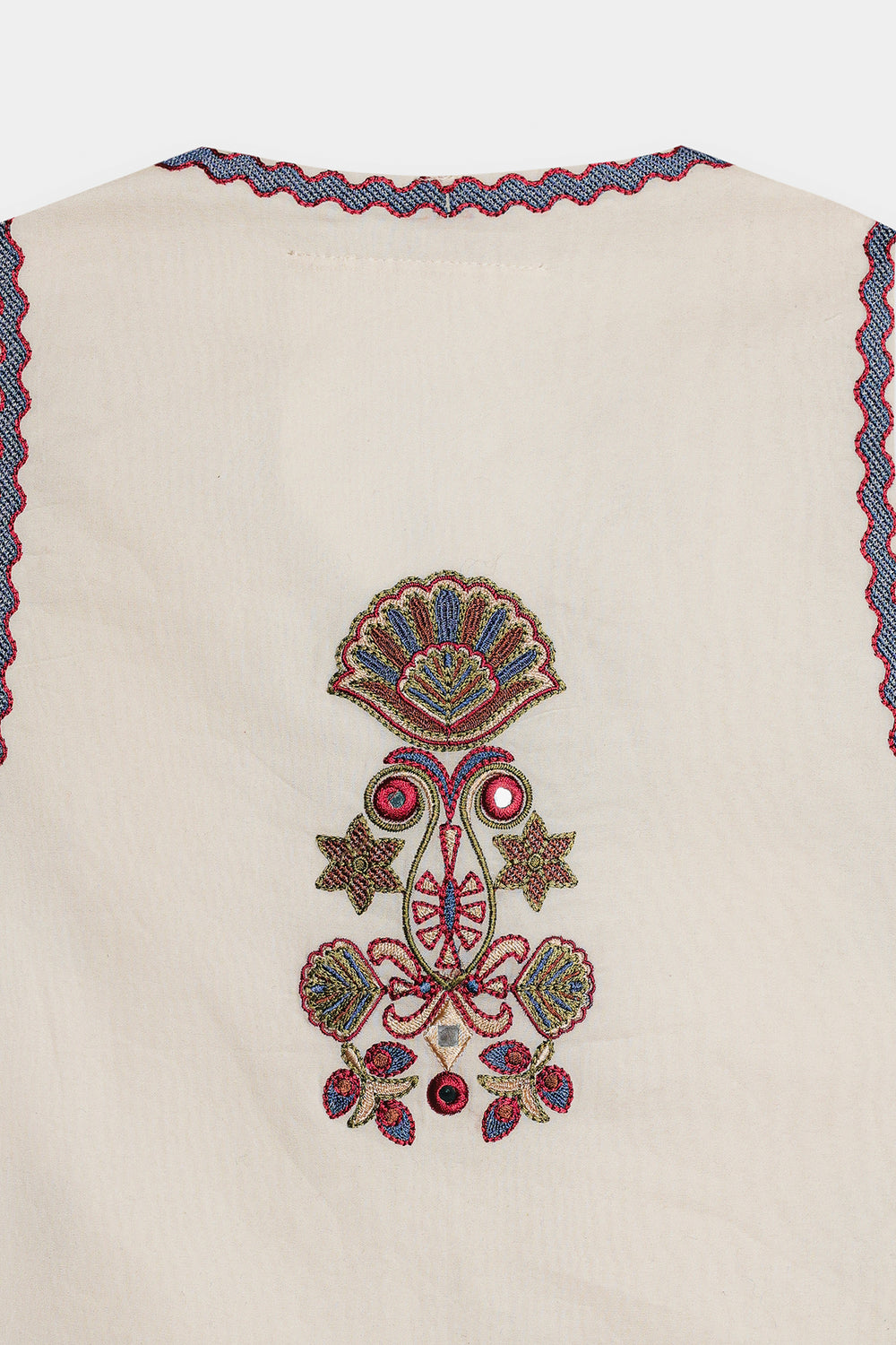 This beautiful off white waistcoat is a must-have for a stylish and elegant look. The sleeveless design is adorned with intricate floral and geometric embroidery in shades of red, white, and blue, creating a delicate and eye-catching pattern. With its button-down front, this waistcoat is perfect for layering over a simple top or dress, adding a touch of traditional charm to any outfit.
