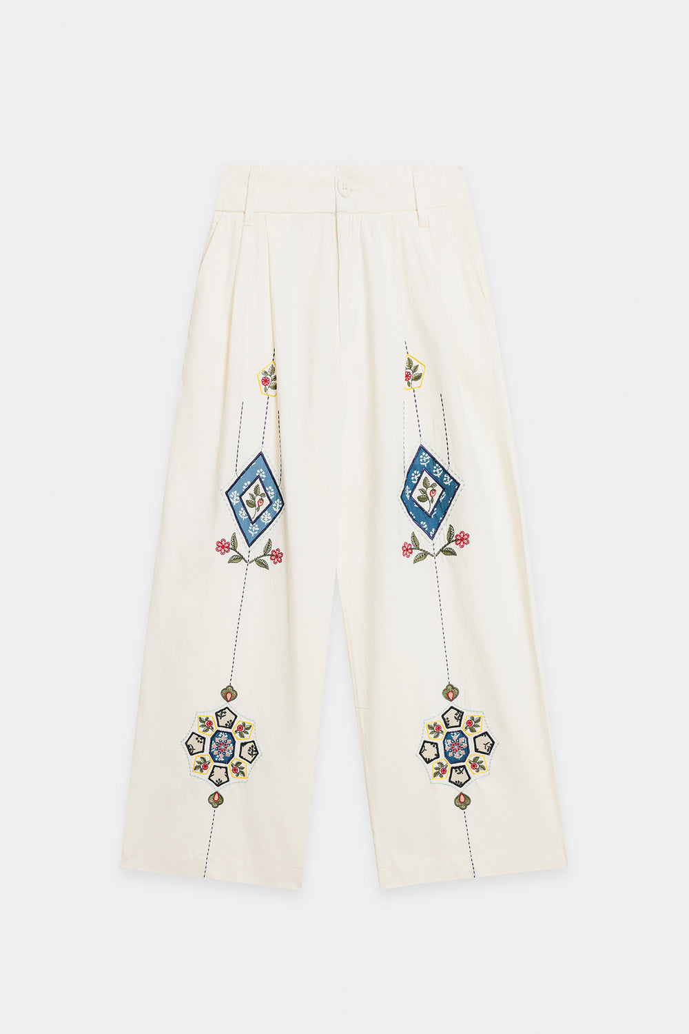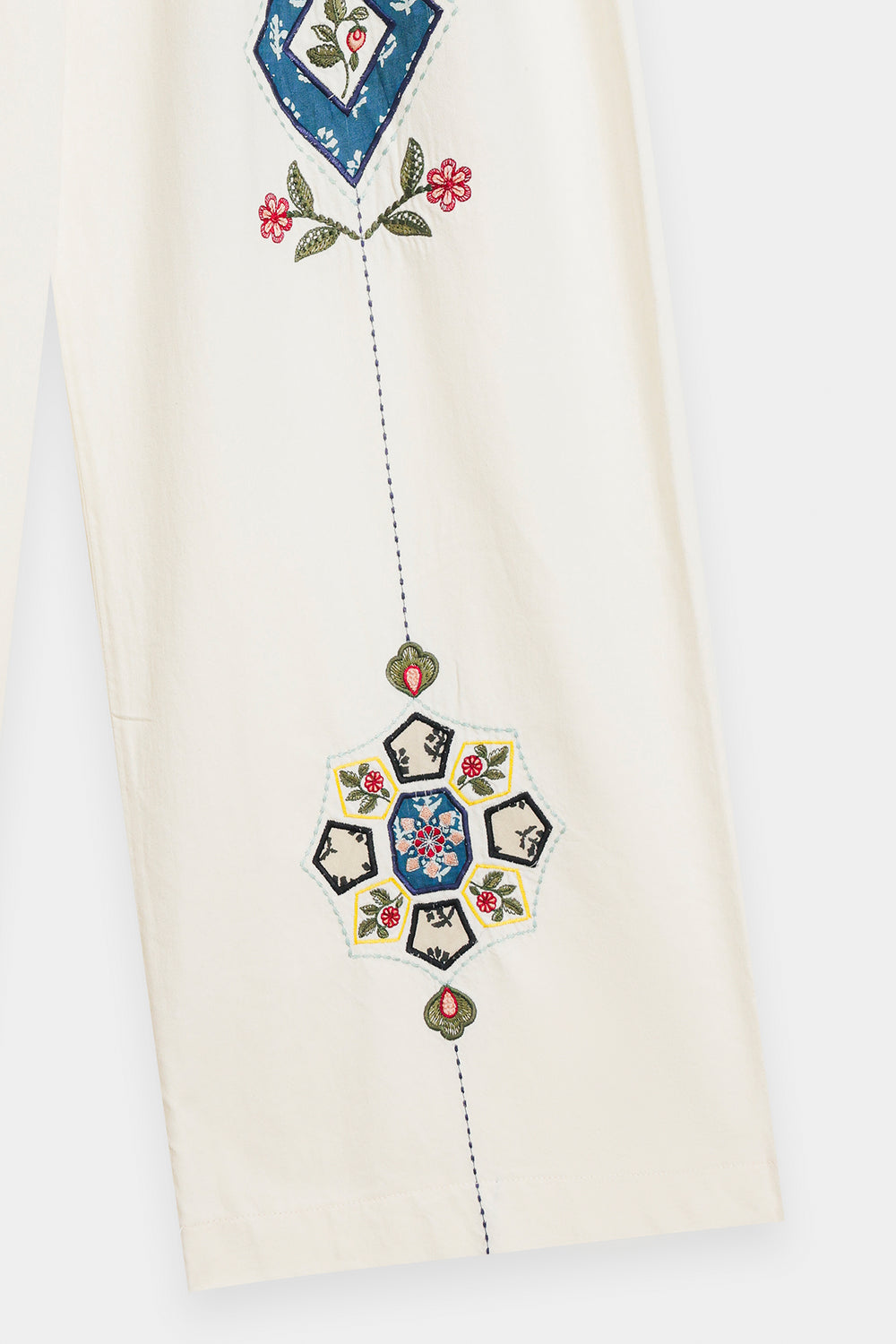 Capture attention with these unique white embroidered trousers. These wide-leg trousers are crafted from a crisp white fabric, offering a comfortable and flowing silhouette. The highlight is the striking, vertically placed multi-colored embroidery on both legs, featuring detailed diamond and floral motifs in shades of blue, red, and yellow. These decorative trousers are perfect for pairing with a simple, solid-colored top to create a stylish, statement-making outfit.