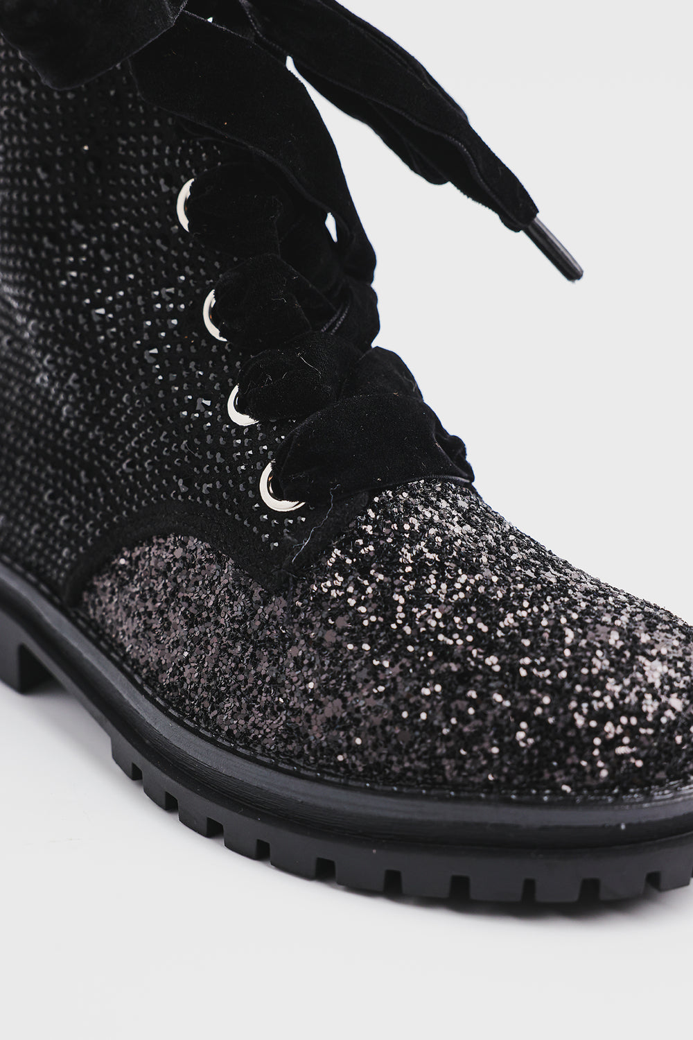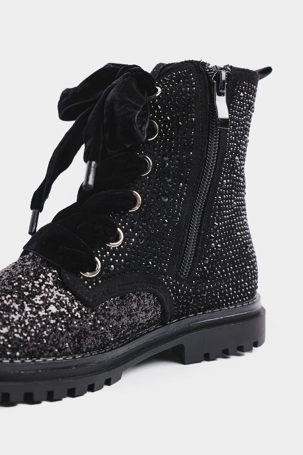 This is a stylish ankle-length combat-style boot featuring an eye-catching design. The boot is fully embellished with sparkling silver rhinestones, giving it a glamorous and luxurious look. The combination of shimmer and velvet makes this boot a standout fashion piece, ideal for statement outfits or trendy streetwear looks.