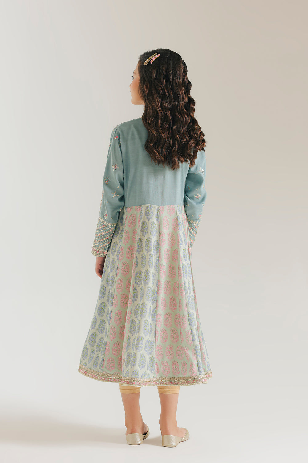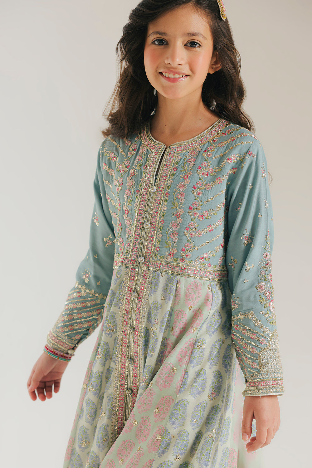 Radiate timeless elegance in this stunning embroidered dress, designed to bring a touch of whimsical charm to her formal wardrobe. The soft dull green canvas is meticulously detailed with intricate pink and gold embroidery across the bodice and sleeves, offering a sophisticated and festive appeal. Its graceful A-line silhouette flows into a flared skirt adorned with a delicate botanical print in pastel hues, all tied together by a shimmering metallic border at the hem. Perfect for special occasions, this ensemble combines traditional artistry with a contemporary flair, ensuring she shines with every step.