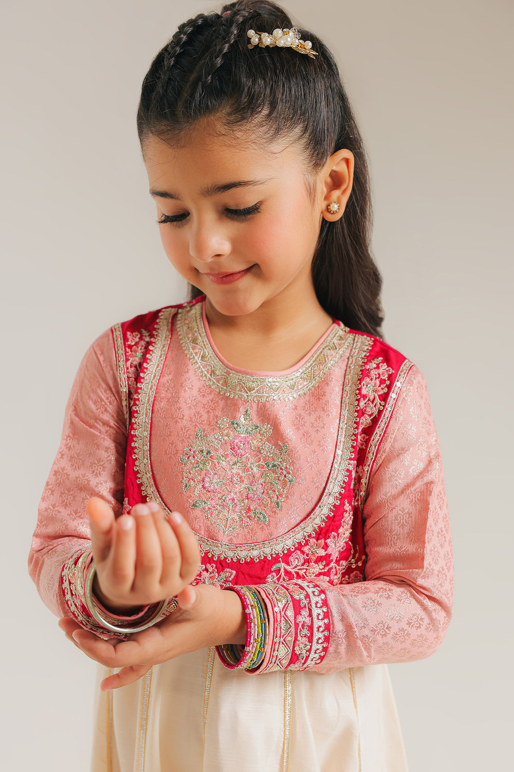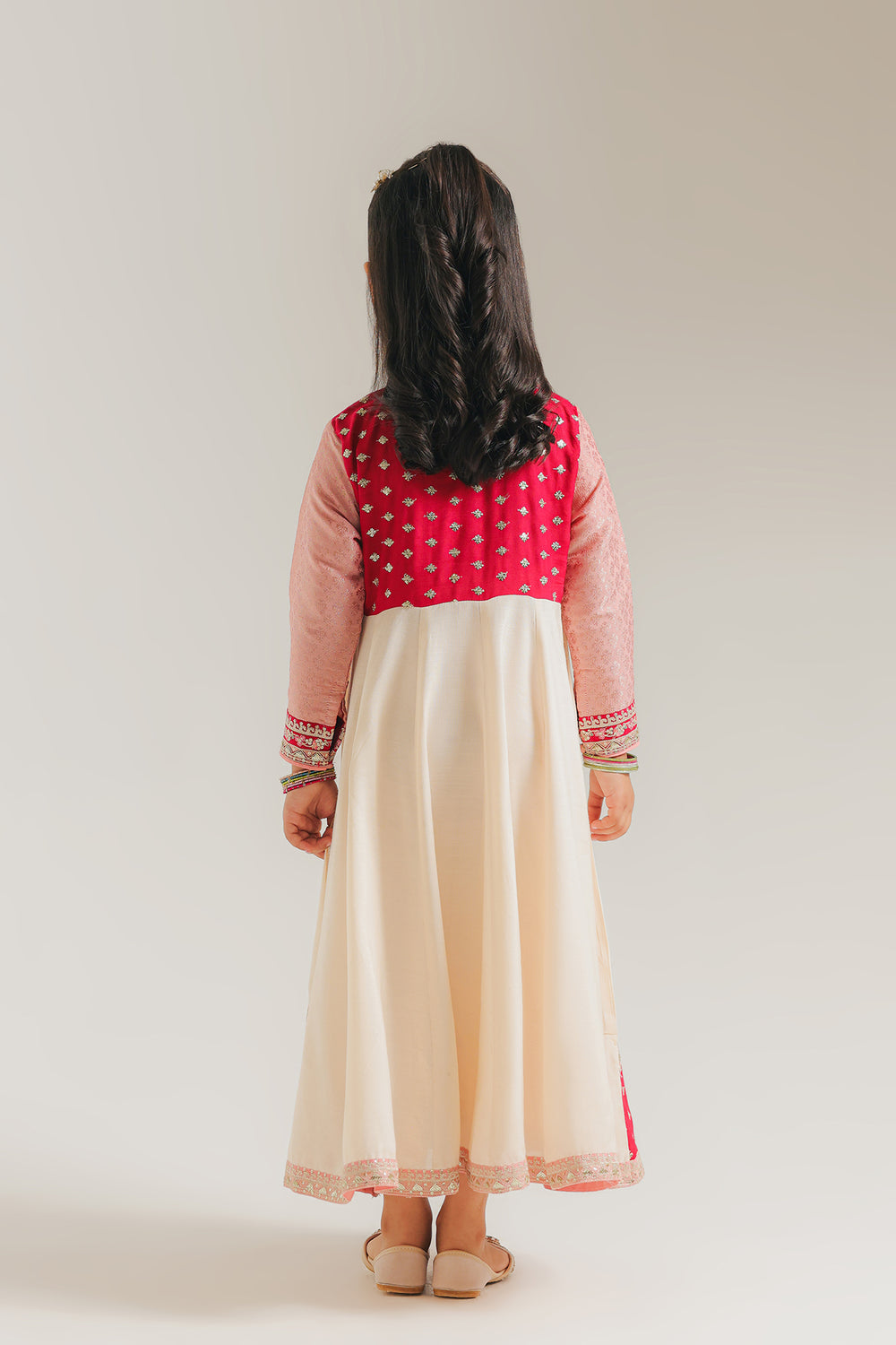 Transform any occasion into a royal celebration with this stunning tricolor embroidered dress, a masterpiece of traditional design and vibrant color. The ensemble features a soft pink bodice beautifully contrasted by a vibrant crimson yoke, which is meticulously adorned with silver-toned floral and leafy embroidery. The long sleeves mirror this elegance, finished with detailed embroidered cuffs that add a touch of sophistication to the overall look. Flowing from the waist, the cream-colored flared skirt is divided into multiple panels by delicate silver gotta, creating a graceful, voluminous silhouette that is perfect for twirling. The design is anchored by a dramatic deep red border at the hemline, showcasing intricate patterns, shimmering accents, and a fine scalloped edge that exudes timeless charm.