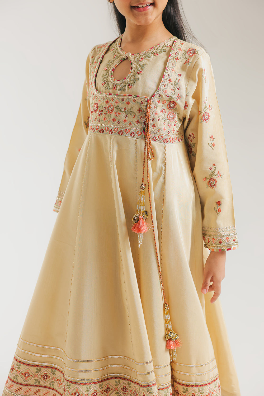 Radiate timeless grace in this cream-colored flared dress, featuring a whimsical A-line silhouette that offers beautiful movement. The dress is designed with a delicate keyhole neckline, accented by a long side tie finished with vibrant orange tassels and gold-toned beads. Intricate floral embroidery in shades of soft pink, muted green, and terracotta adorns the yoke and sleeves, adding a touch of traditional craftsmanship. The expansive hemline is further elevated by detailed horizontal embroidered borders and shimmering silver lace trimmings. Paired here with classic maroon pointed flats, this ensemble creates a polished and festive look perfect for any special occasion.