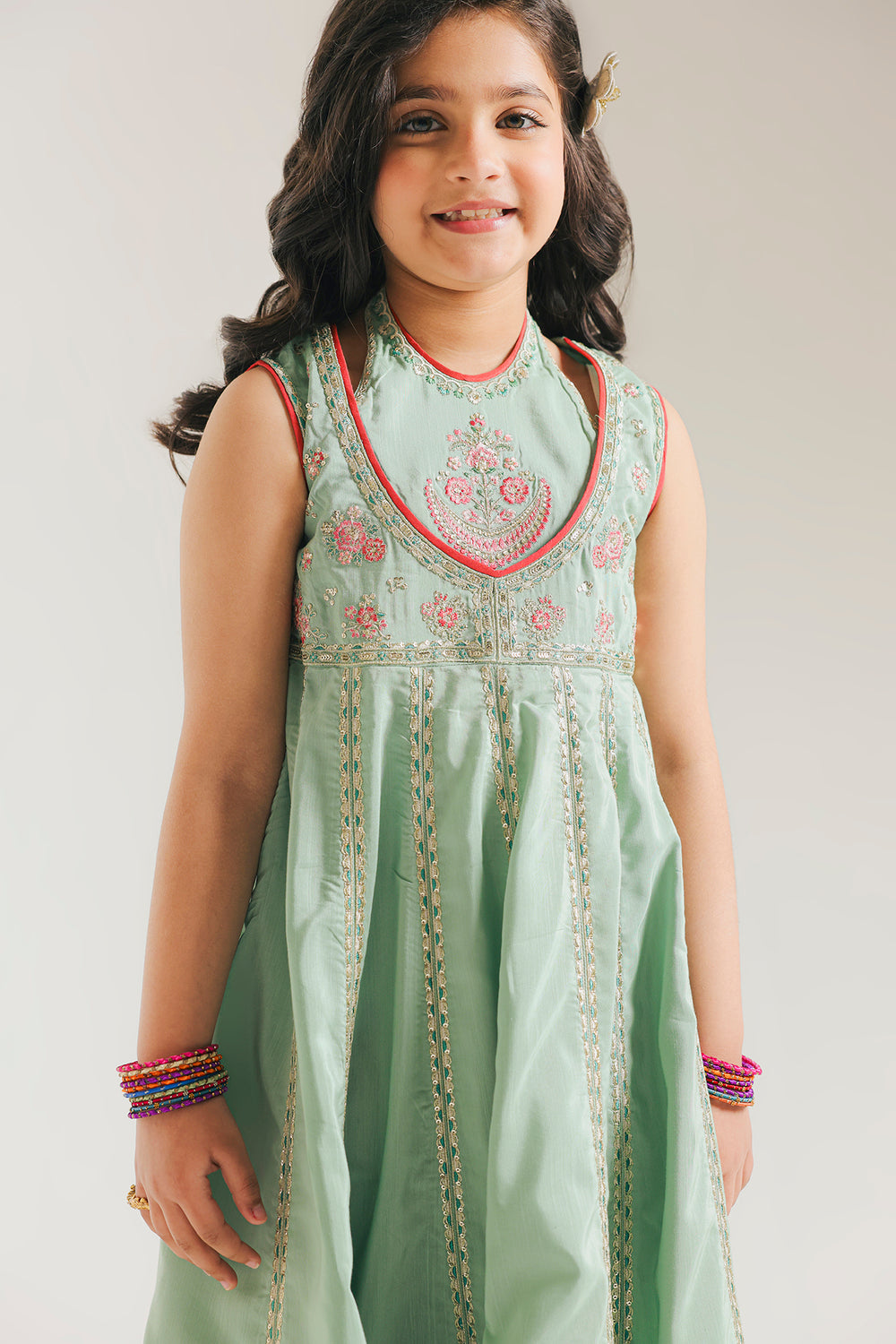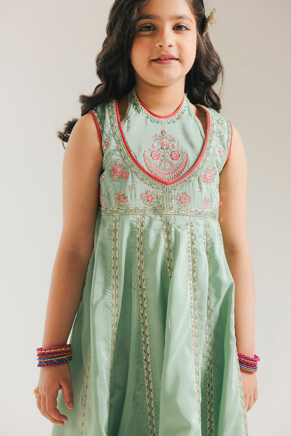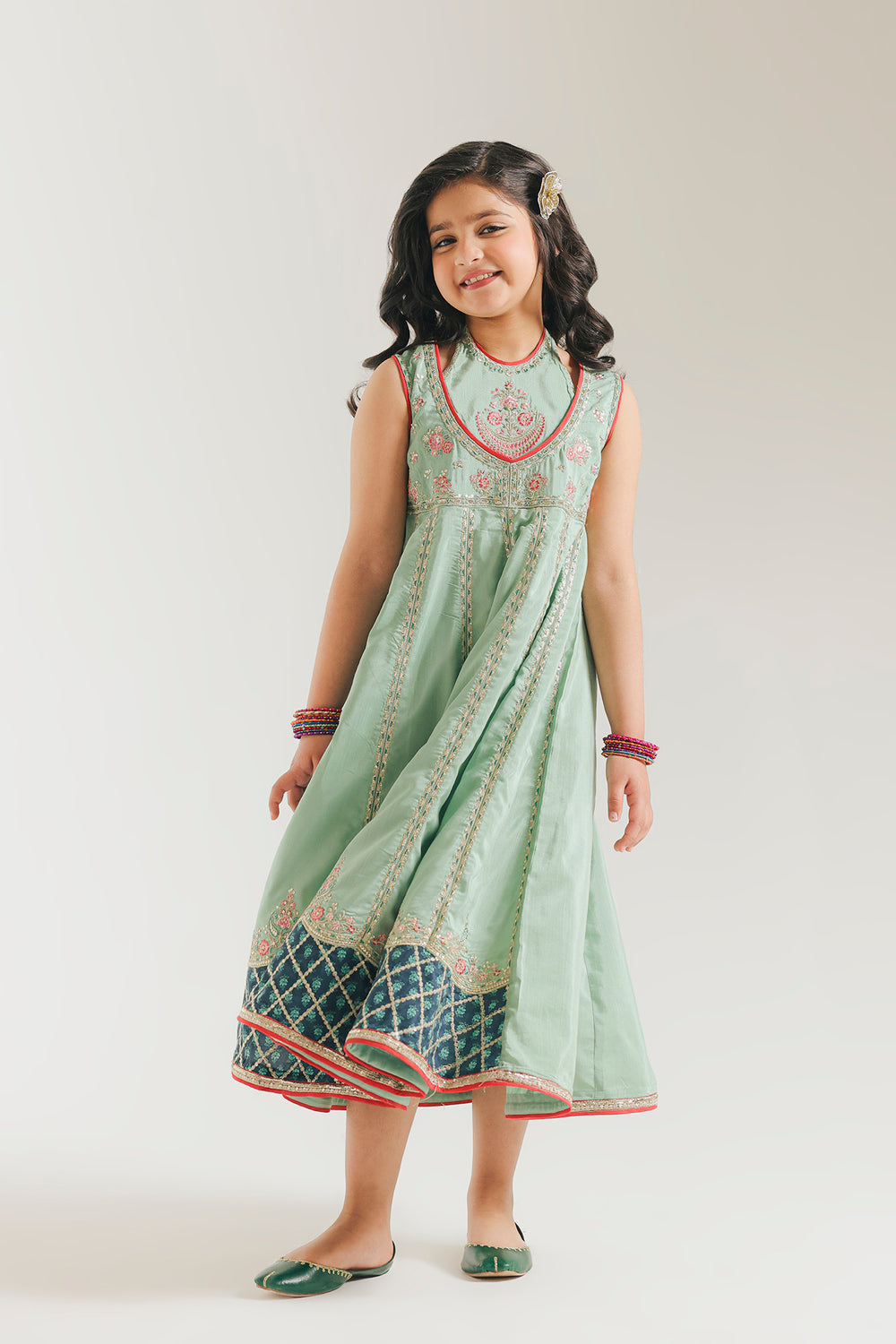 Radiate fresh, festive charm with this enchanting mint green embroidered dress for girls. This sleeveless ensemble features a contemporary round neckline, beautifully accented with a vibrant pink border and intricate floral needlework on the bodice. The voluminous, flared skirt is adorned with vertical embroidered panels that lead to a stunning wide border at the hem, showcasing a rich teal geometric print and delicate pink floral motifs. Perfectly finished with a subtle shimmer, this dress offers a graceful silhouette for any special celebration. It’s a whimsical blend of traditional artistry and modern playfulness for your young fashionista.