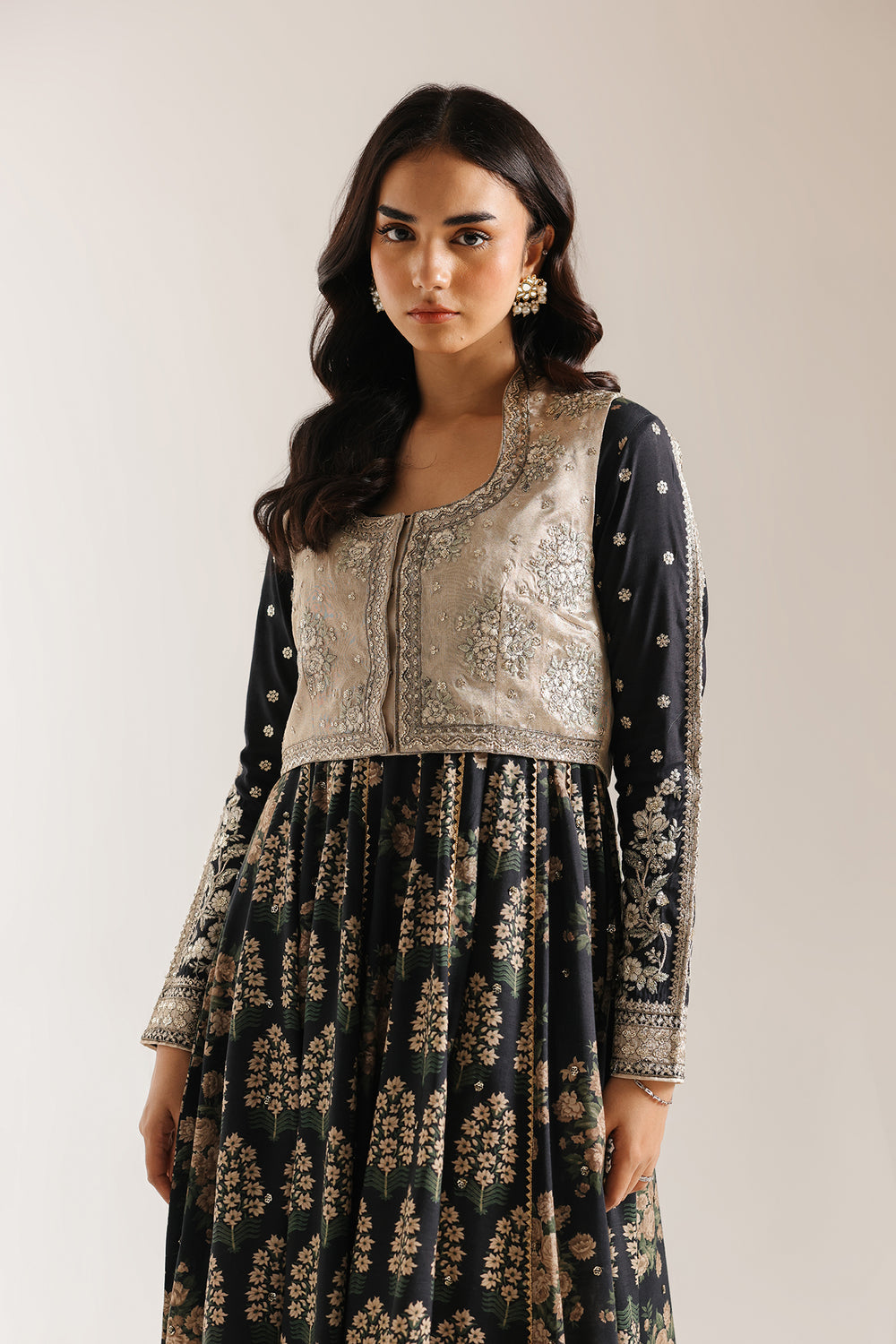 Elevate your ethnic wardrobe with this exquisite embroidered dress, a masterpiece of traditional craftsmanship. The ensemble features a richly embellished gold-toned bodice adorned with intricate embroidery, paired with a flowing dress showcasing delicate block-printed floral motifs. Long sleeves with detailed cuff embellishments and a heavily embellished hem complete this sophisticated silhouette. Perfect for weddings, celebrations, and formal occasions, this layered anarkali-style dress combines timeless elegance with contemporary styling, offering both comfort and striking visual appeal.