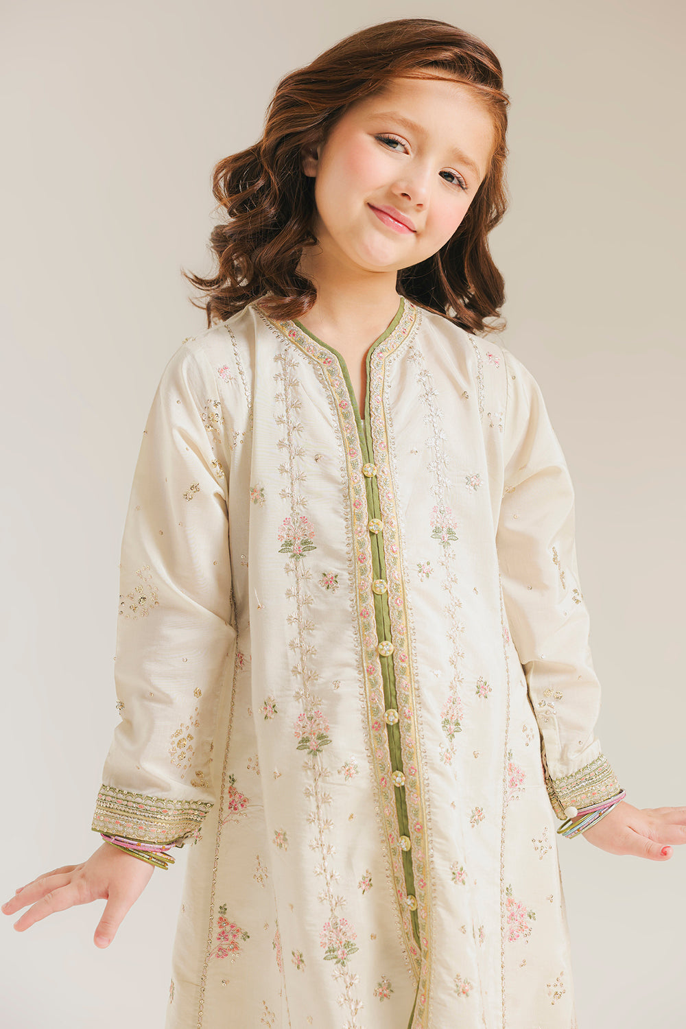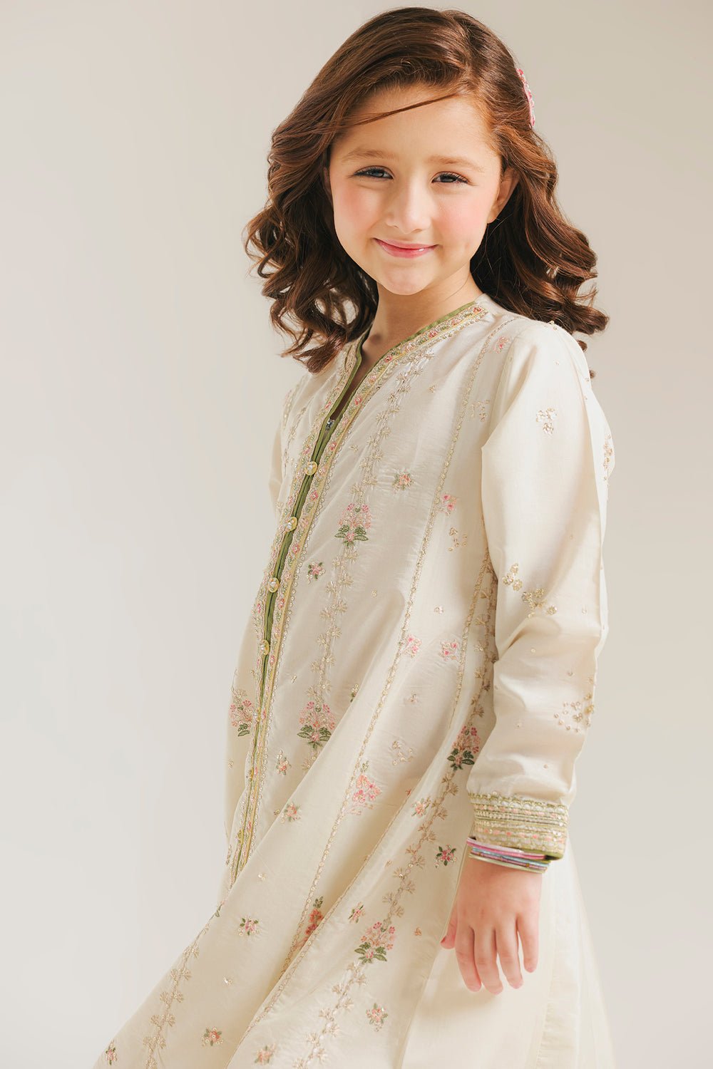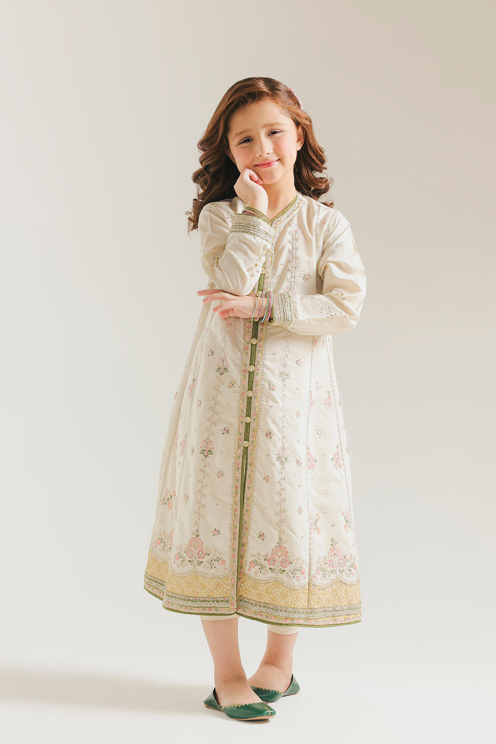 Graceful A-line silhouette with an elegant front slit in soft cream and off-white, adorned with sage green borders and delicate blush pink floral embroidery. The bodice and cuffs showcase intricate silver thread work, while decorative fabric-wrapped buttons accent the center front. A stunning multi-layered hemline features scalloped gold lace detailing for added sophistication. Perfect for special occasions, this stitched piece combines traditional angrakha styling with refined embellishments.
