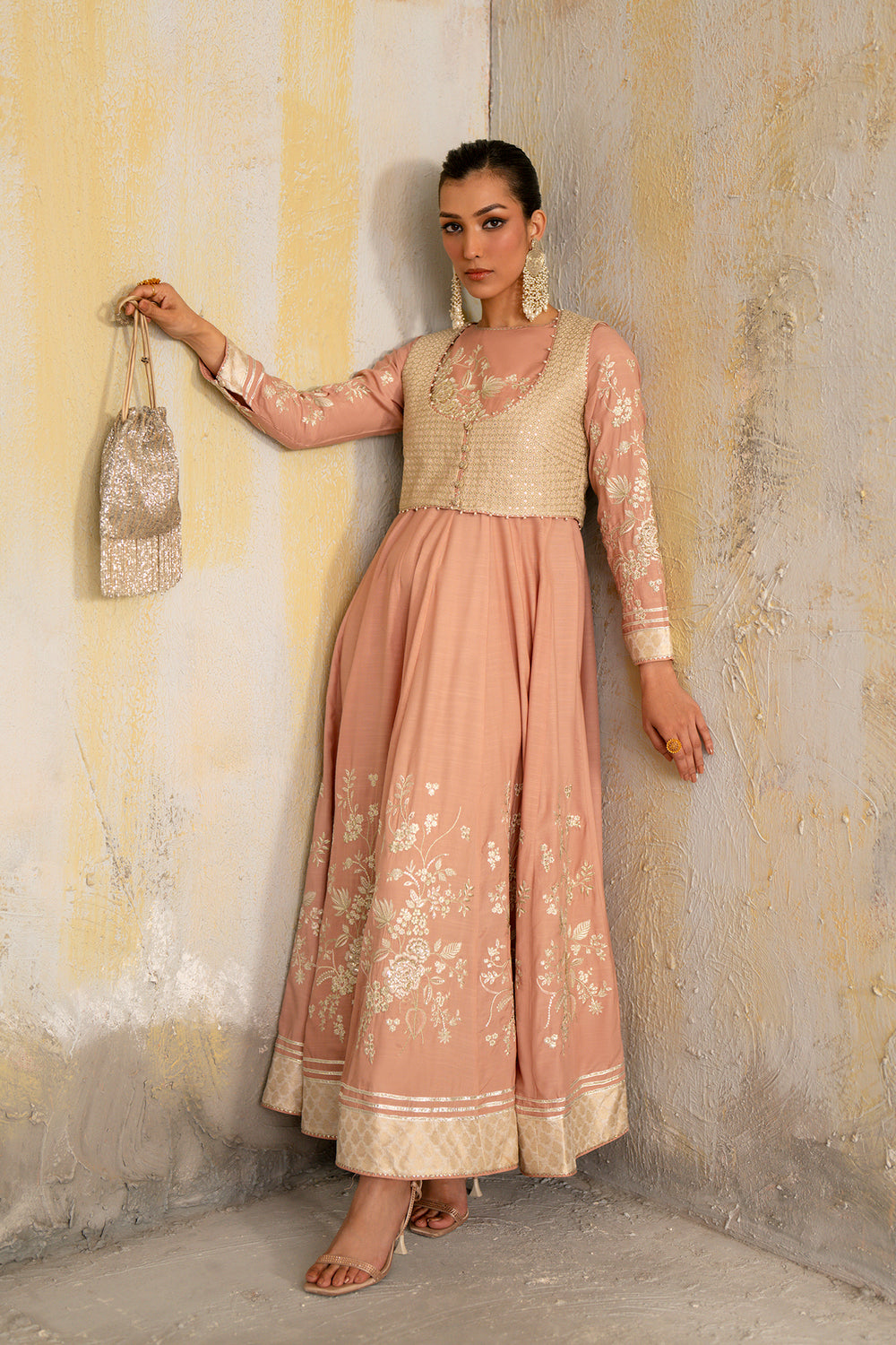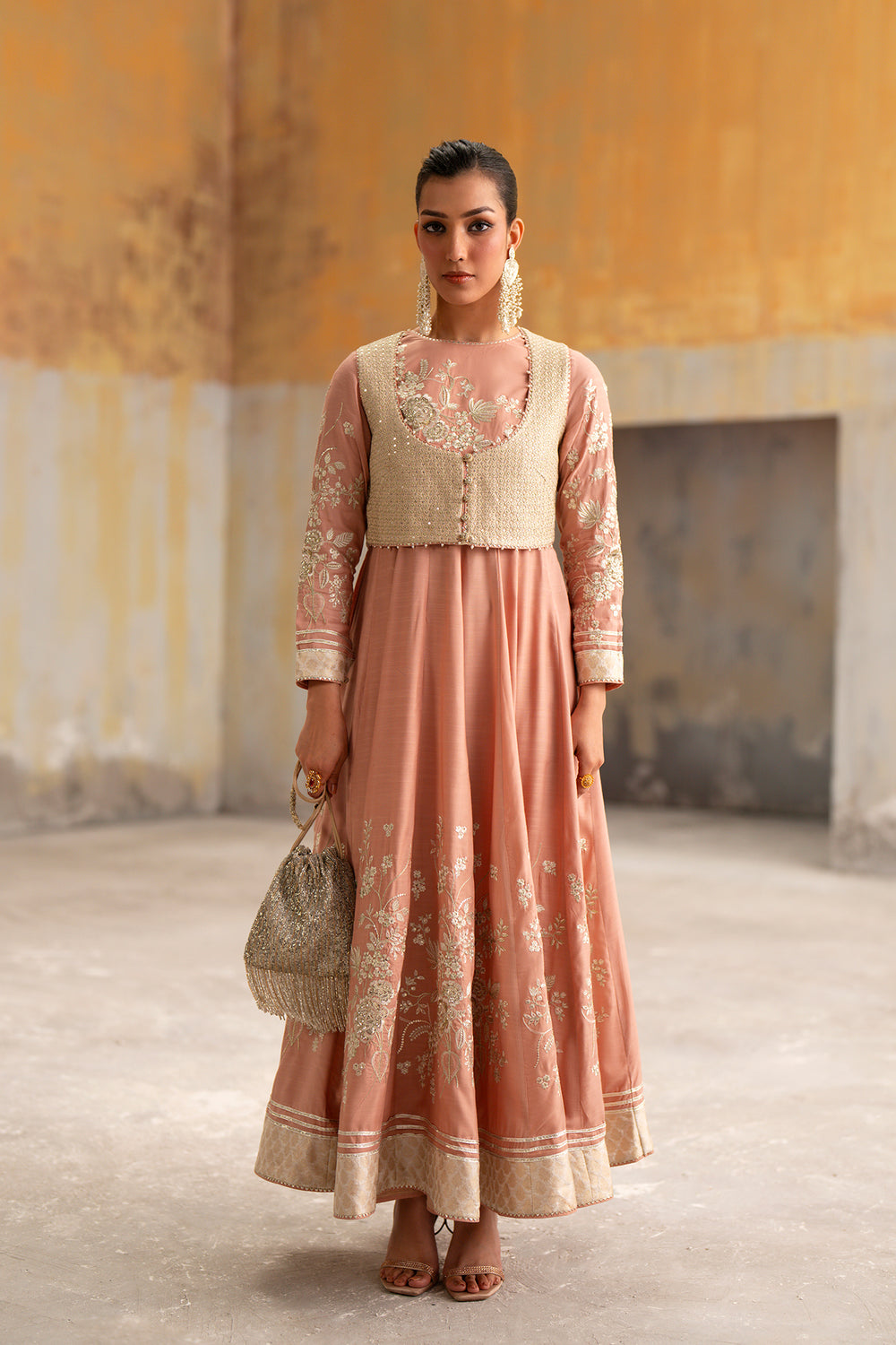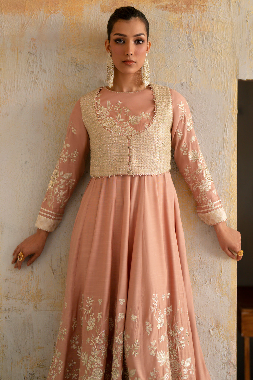 Embrace a vision of ethereal grace with this stunning two-piece embroidered dress in a soft, dusty peach hue. The floor-length, flared silhouette is meticulously crafted from premium fabric, featuring delicate ivory floral embroidery that climbs elegantly from the hemline and adorns the long sleeves. Adding a layer of regal sophistication, the ensemble is paired with a sleeveless ivory waistcoat, richly encrusted with sequin work. This masterpiece of contemporary heritage is the perfect choice for weddings or grand festivities, offering a flattering, voluminous drape that ensures you move with effortless poise and timeless style.
