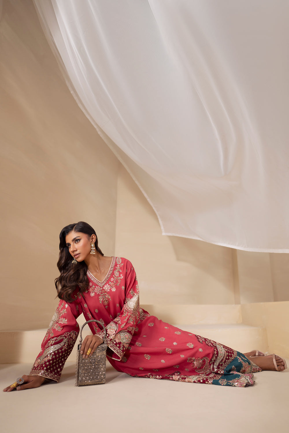 Channel imperial elegance in this beautiful deep coral-pink embroidered shirt. This maxi-length shirt features a flattering V-neckline and a straight, flowing cut. The entire shirt is richly embellished with intricate gold, silver, and pink thread embroidery and shimmering sequin work. The full sleeves are adorned with ornate traditional motifs. A striking contrast is introduced at the hem with a wide band of deep teal fabric featuring bold embroidery, creating a dramatic finish. This luxurious piece is the ultimate statement for any grand formal or wedding celebration.