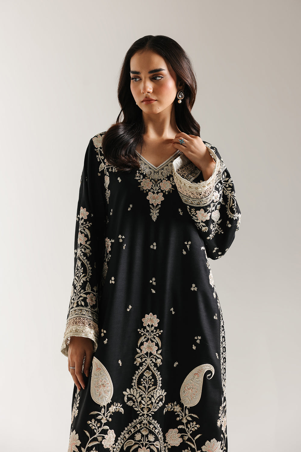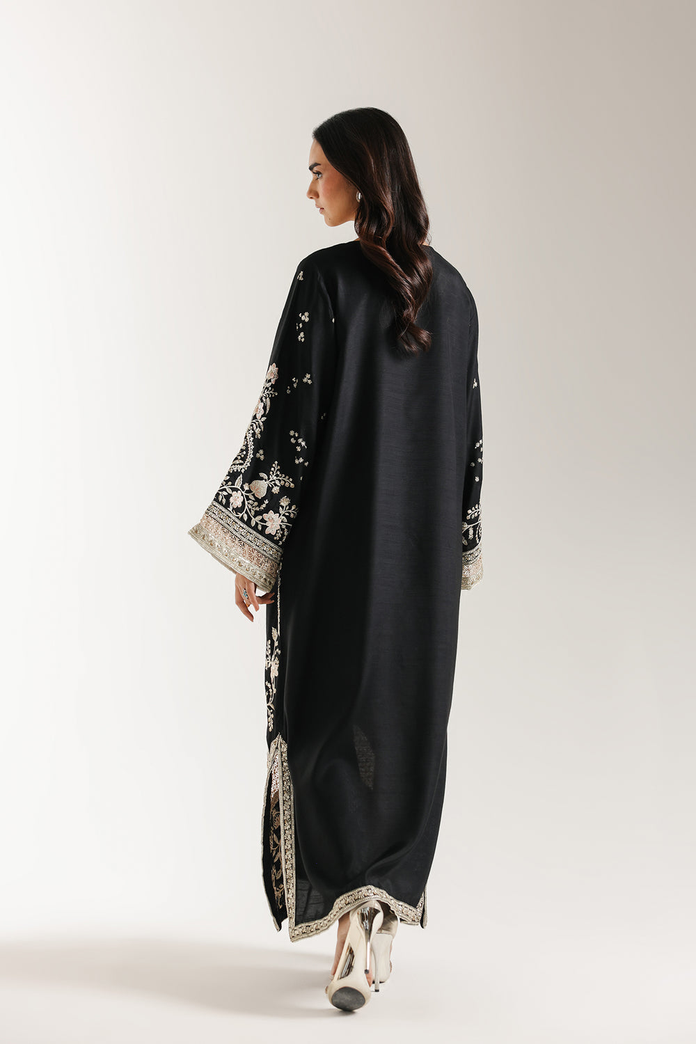 Envelop yourself in dramatic elegance with this stunning black embroidered kaftan. This floor-length kaftan is rendered in a deep, striking black fabric. It is lavishly decorated with intricate heavy embroidery in pale pink, off-white, and silver thread. The ornate design features large paisley motifs, detailed floral patterns, and geometric borders that run down the center panel and around the hem and wide sleeves. The wide V-neckline is also detailed with complementary embroidery. This luxurious and flowing garment is a perfect statement piece for any sophisticated evening or festive occasion.
