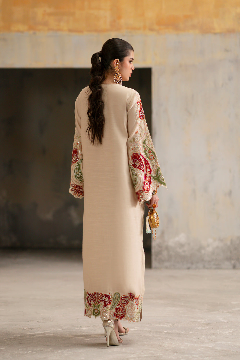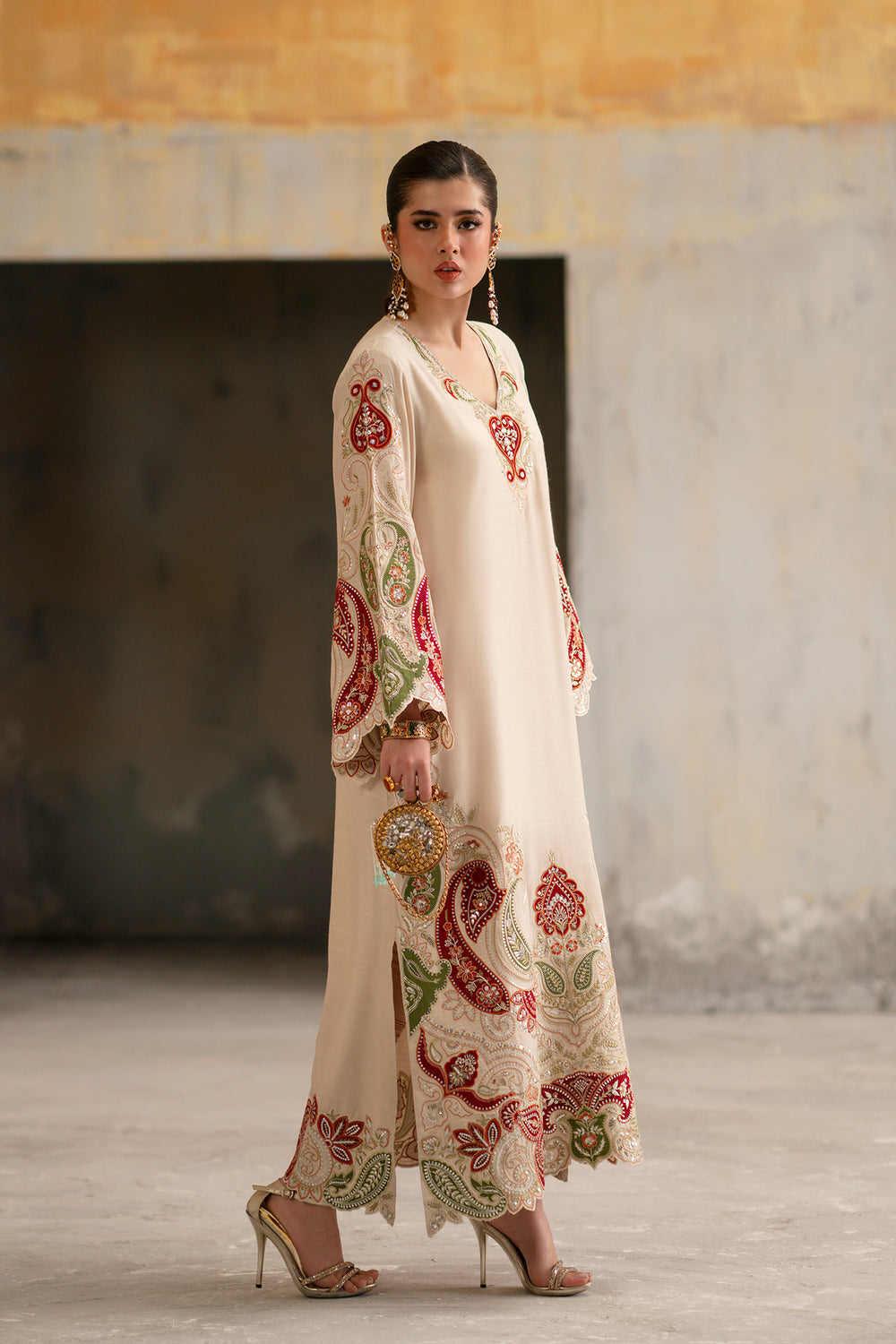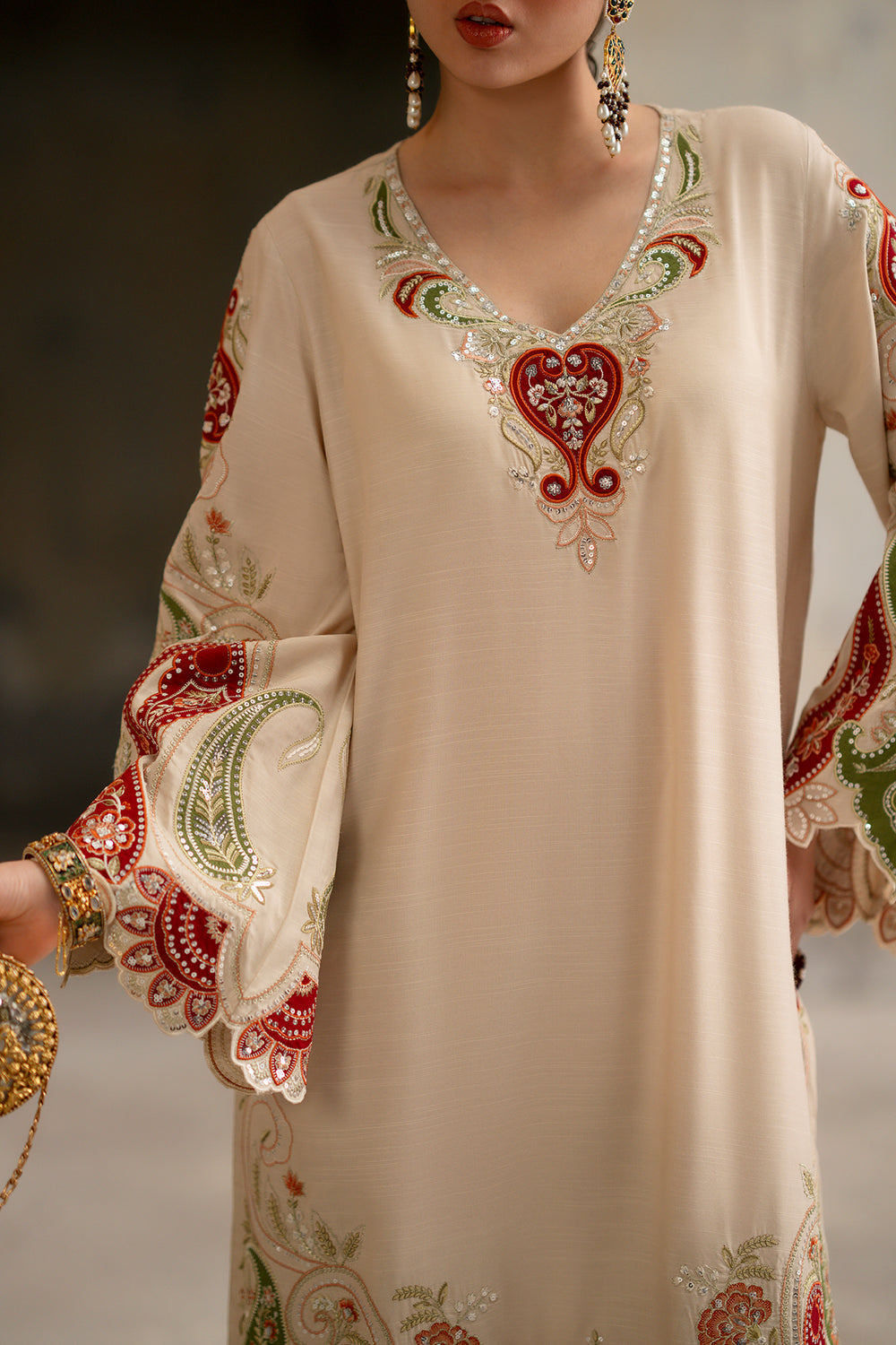 This magnificent embroidered kaftan in serene ivory features a floor-length silhouette defined by flowing grace and a refined V-neckline. It is adorned with a central heart-shaped floral motif in deep crimson and sage green, with intricate embroidery extending across wide, flared sleeves. The garment showcases a blend of traditional paisley and architectural patterns, finished with a stunning laser-cut scalloped lace border at the hemline. Designed for modern luxury, its relaxed fit ensures effortless elegance for weddings or formal receptions.
