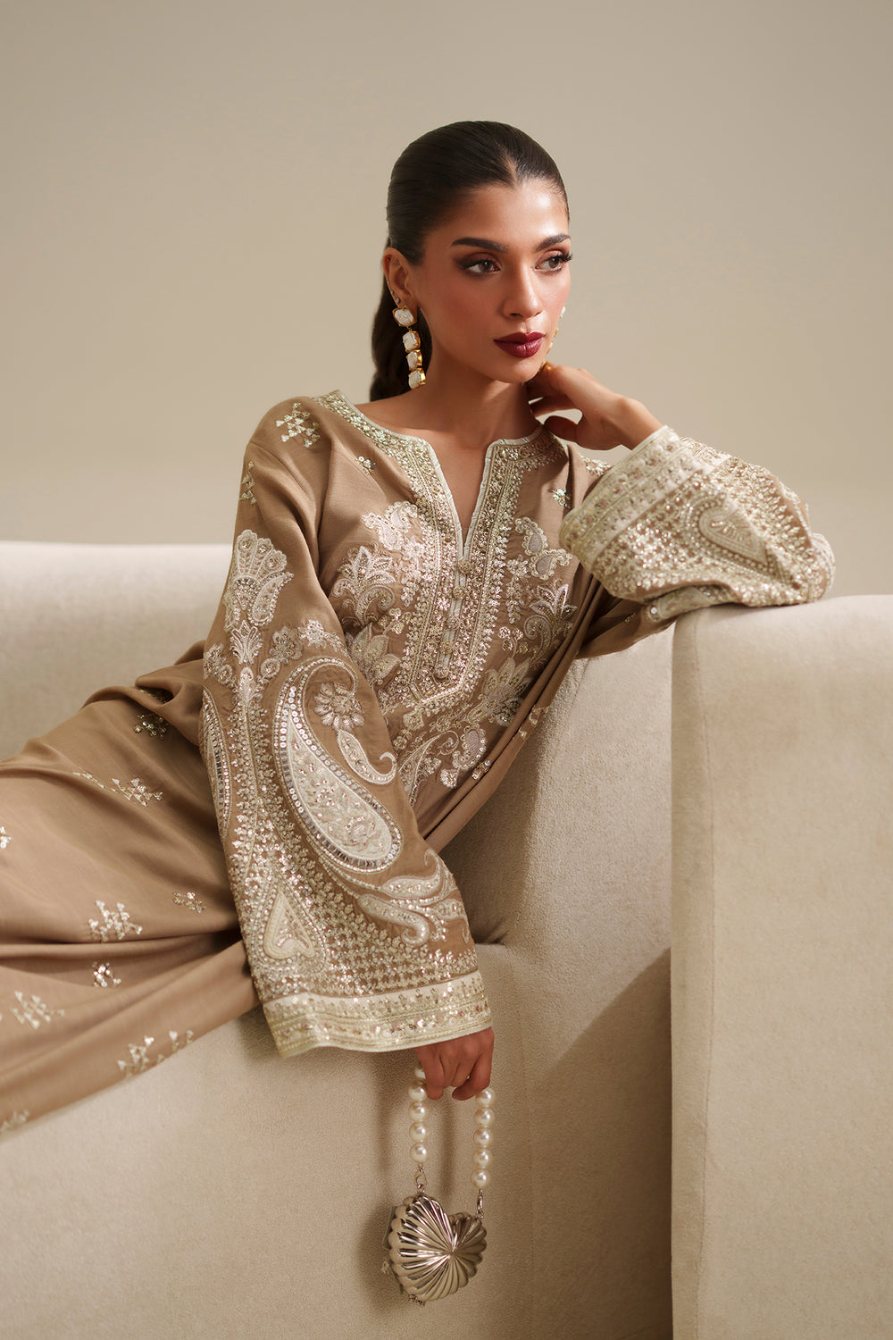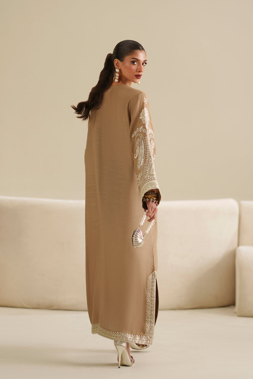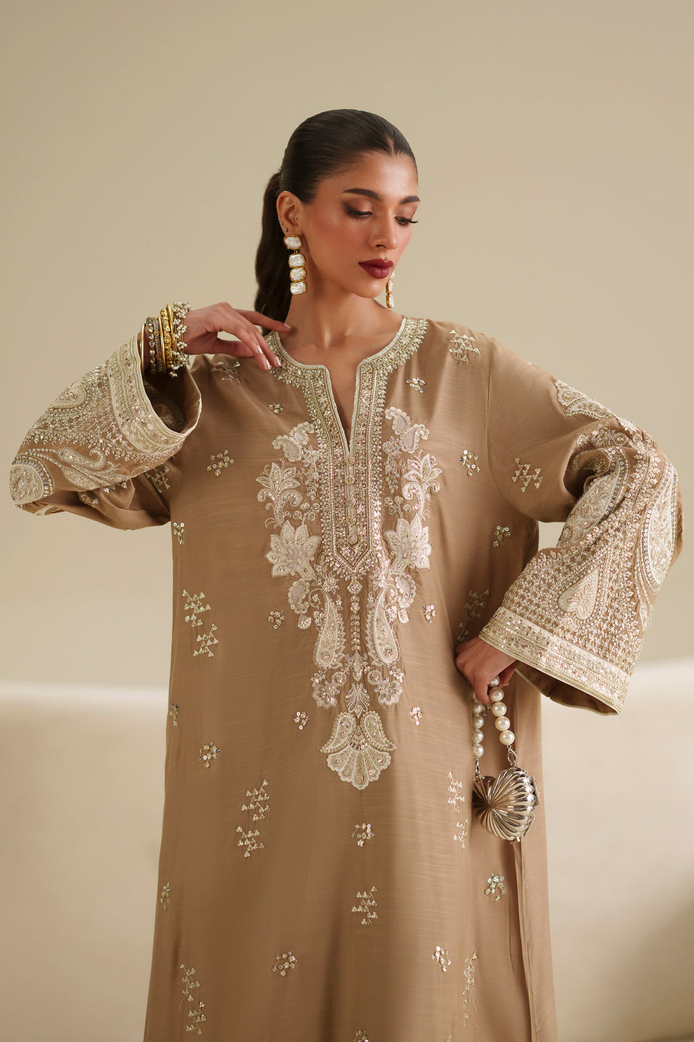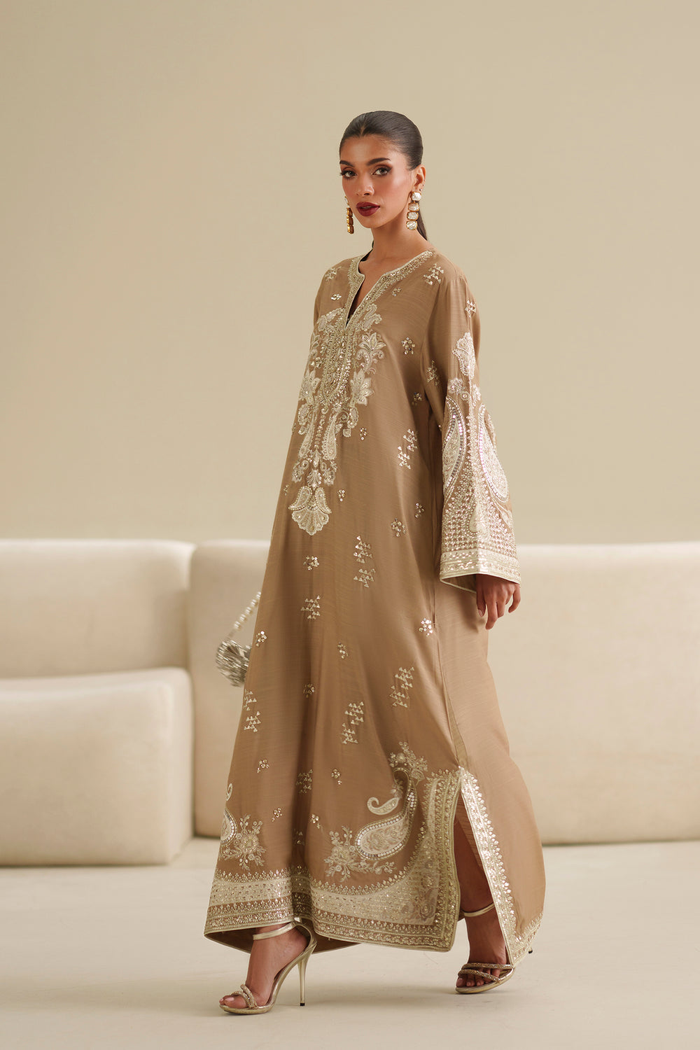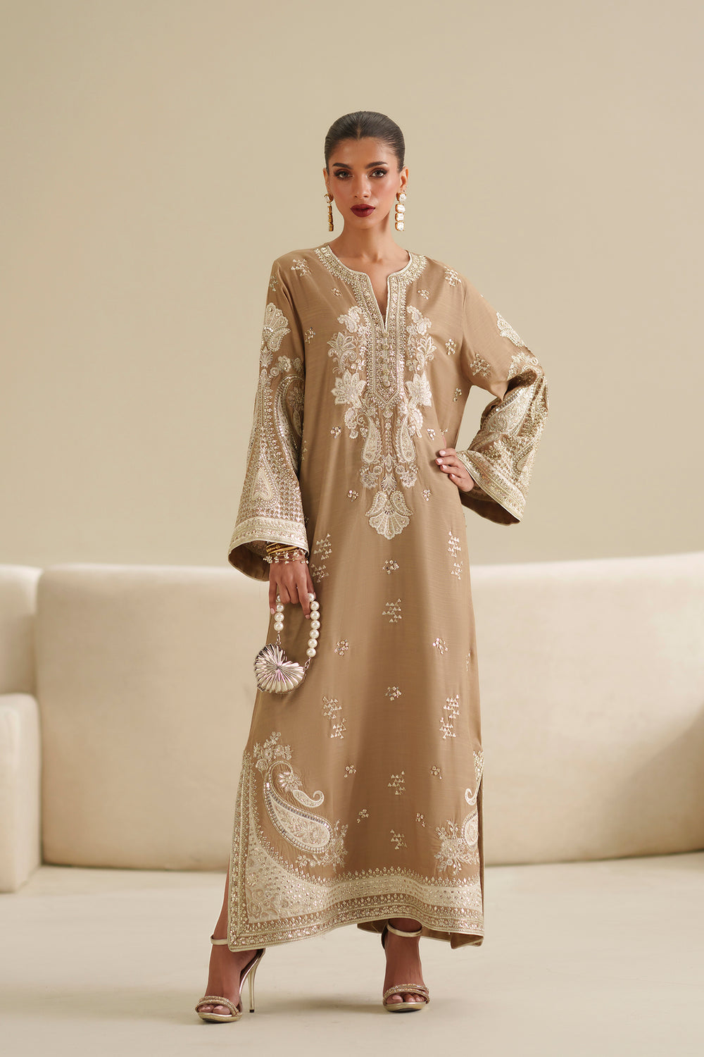 This elegant sand-beige embroidered kurta captures understated luxury with its graceful, straight silhouette. Designed with a refined round neckline featuring a delicate slit, the front is adorned with intricate ivory floral embroidery that cascades down the center and subtly scatters across the body. The statement wide sleeves are beautifully detailed with dense embroidered borders, while the hemline features ornate paisley and floral motifs, adding richness and depth to the design. Perfectly balanced between sophistication and modern elegance, it is an effortlessly chic piece for festive gatherings and formal daytime occasions.