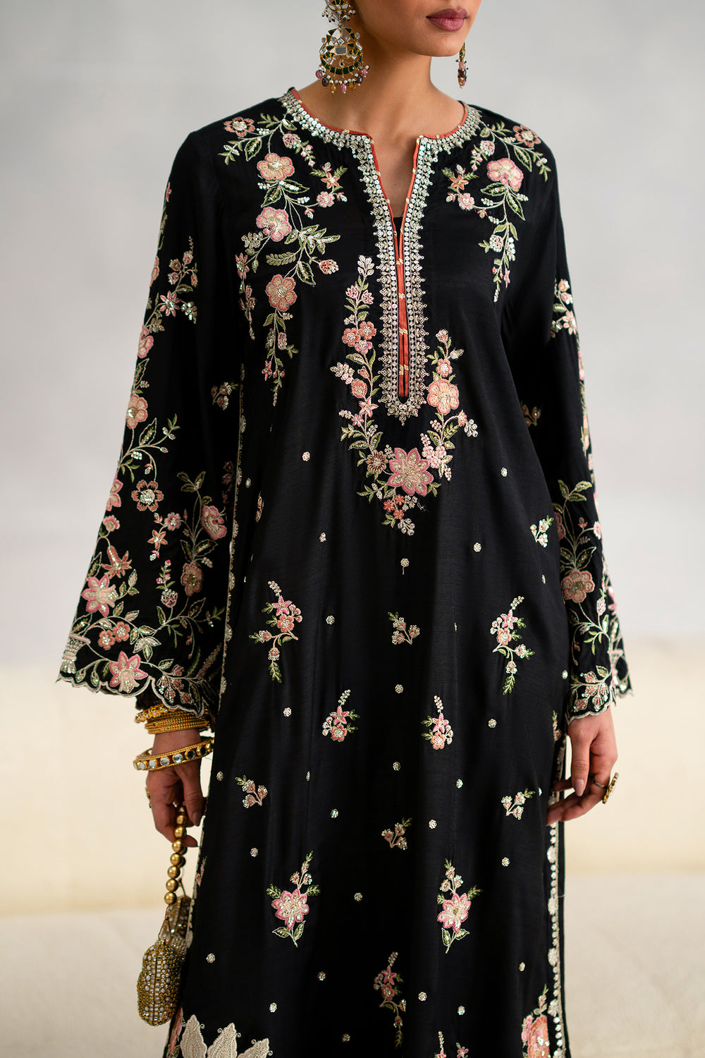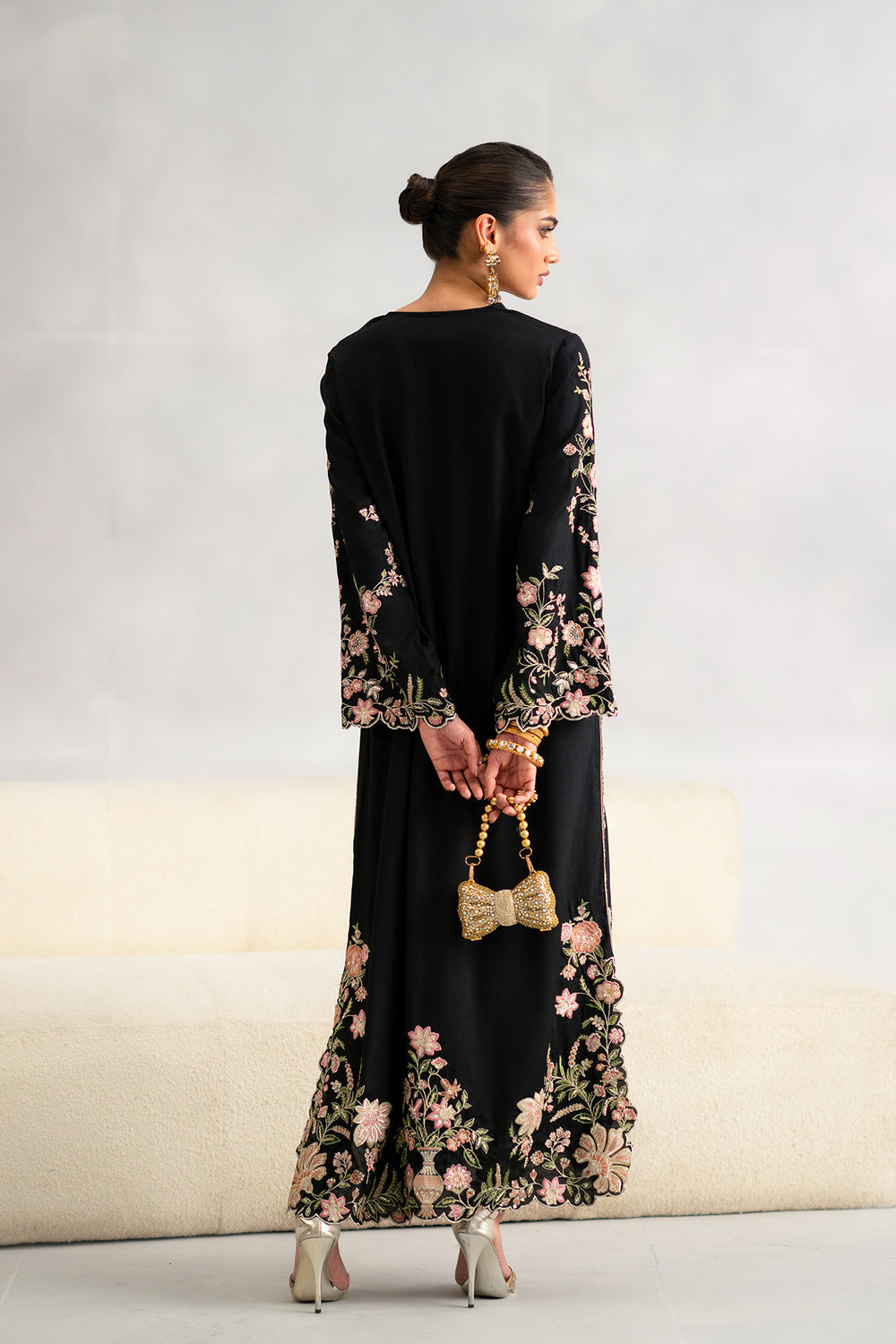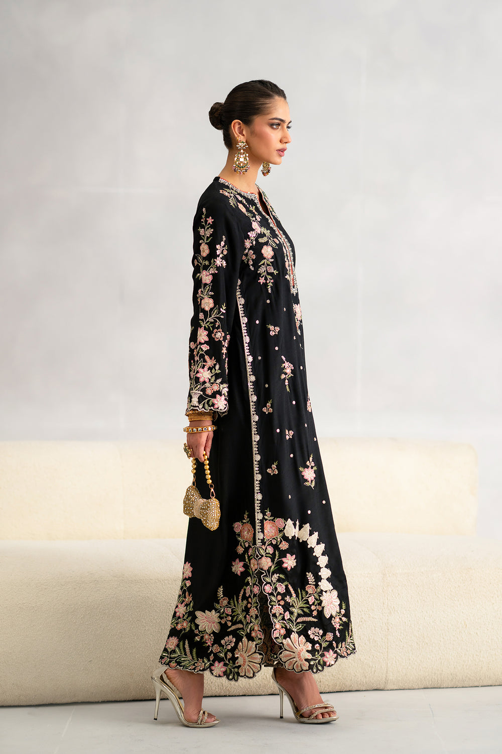 Jet black kaftan elevated with luxurious Resham silk embroidery in dusty pink, peach, and sage green. Traditional floral and vase motifs create an intricate, sophisticated design. The Y-neckline features a striking white and silver geometric border for added elegance. Structured yet fluid fabric drapes beautifully, while scalloped laser-cut hemlines and cuffs deliver the refined, delicate finish of high-end boutique craftsmanship. Perfect for formal occasions and celebrations.