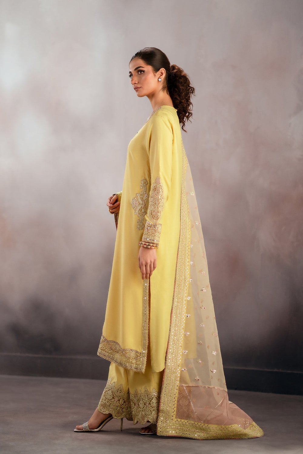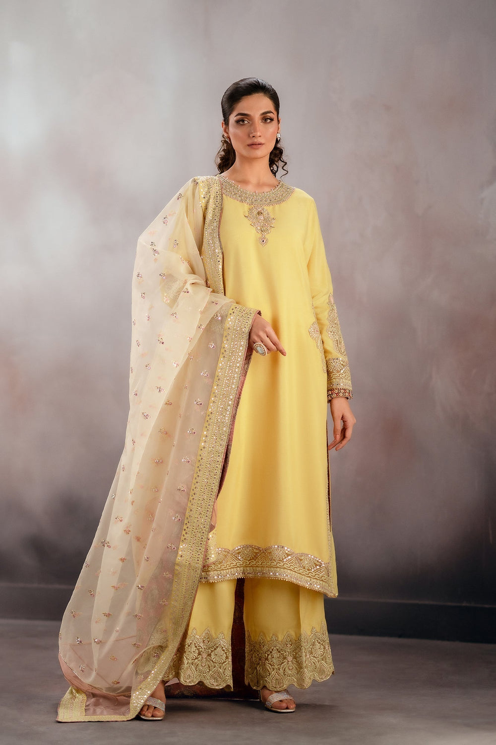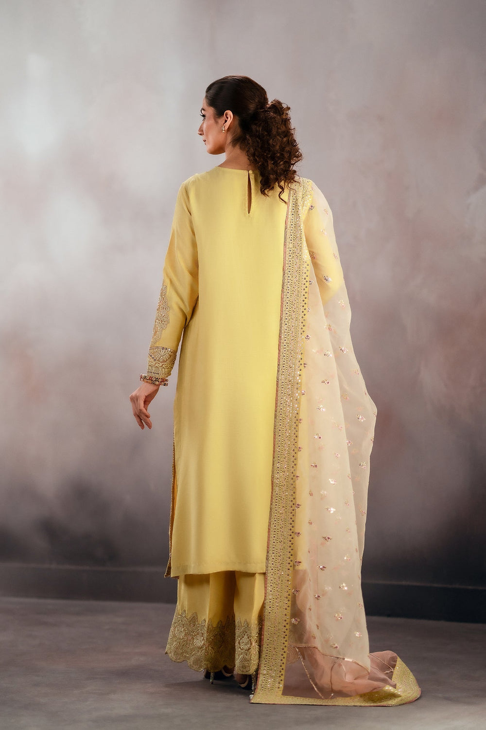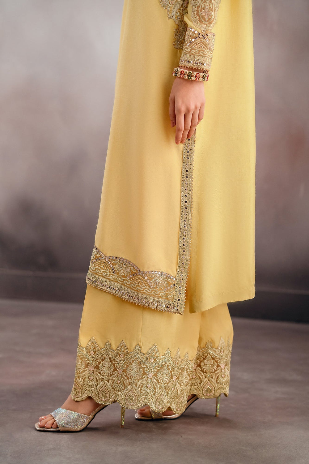 This beautifully crafted ensemble will make a timeless addition to your wardrobe. It comes with a graceful, elegant, and gleaming bright yellow shirt with intricate floral motifs embroidered in scintillating hues and illustrating intricate borders. Paired with a gracefully crafted contemporary culotte trouser adorned with delicate embroidery at scalloped bottom opening. And complete the formal look with the classically draped dupatta featuring dazzling floral embroidery. An aesthetic outfit perfect for making a style statement at festive events.