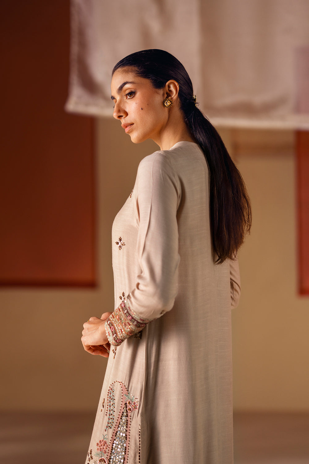 Experience the captivating fusion of rustic elegance and artistic detail. This stunning embroidered suit features a light, beige shirt adorned with intricate floral embroidery and shimmering sequin details on the front. The look is completed with wide-leg trousers that showcase a bold, colorful print in deep maroon and terracotta hues. This ensemble is a perfect blend of modern sophistication and timeless artistry, making it a truly unique statement piece.