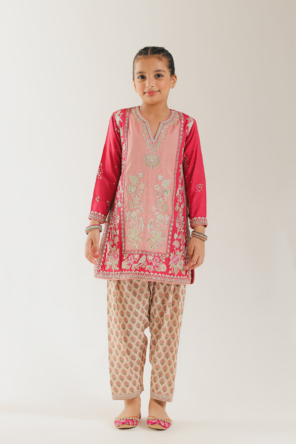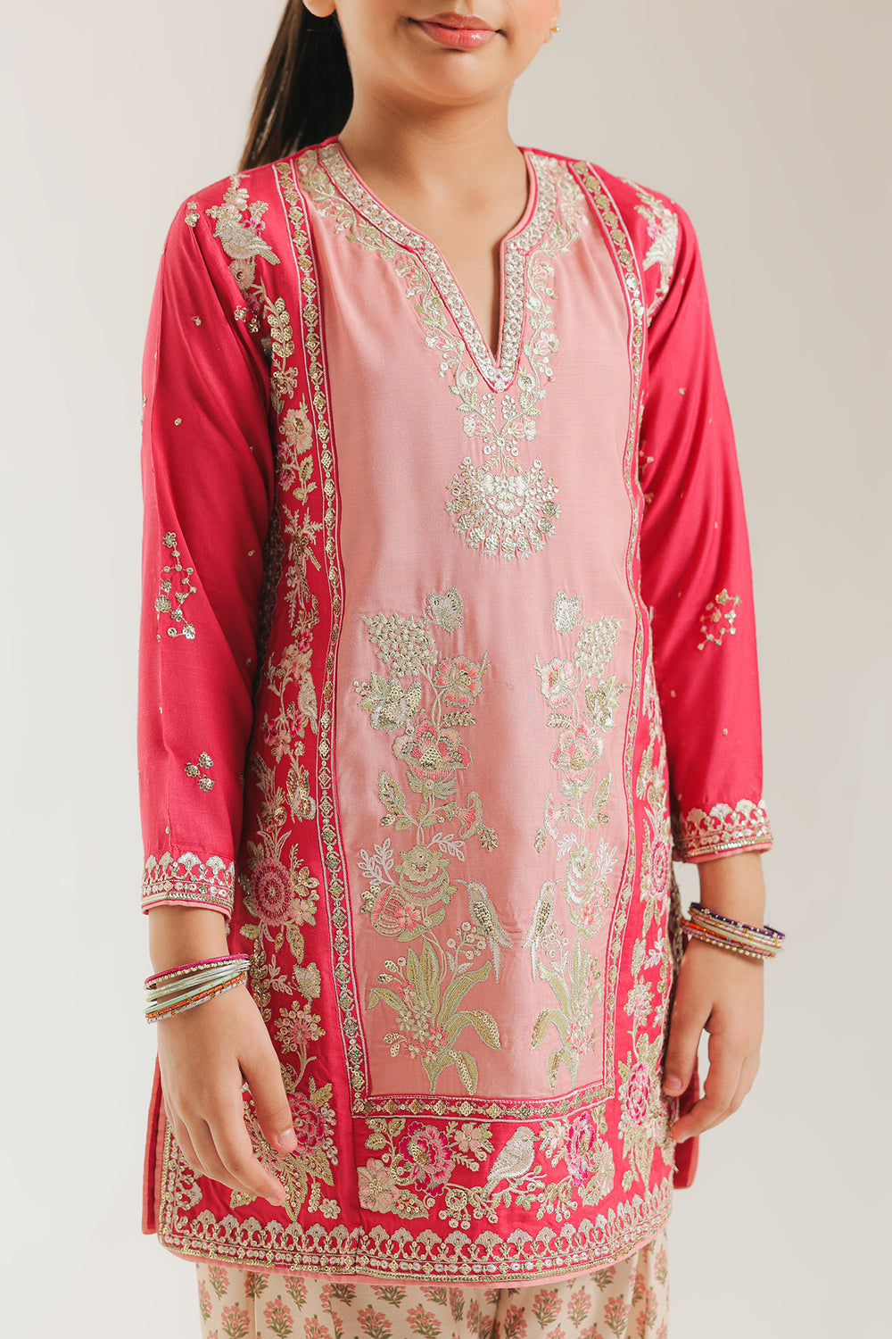 Illuminate any occasion with this vibrant pink and embroidered suit. The short, festive kurta features a bodice divided into panels of bright pink and rich fuchsia, connected by beautiful vertical embroidery. The front is densely embellished with sequin and thread work in delicate floral motifs. The V-slit neckline and long sleeves add a classic touch to this richly colored piece. The ensemble is completed by shalwar. The shalwar feature an all-over, small-scale floral print in shades of cream and pink, offering a lovely balance to the vibrant kurta. This suit is perfect for adding traditional splendor to a young one's wardrobe.