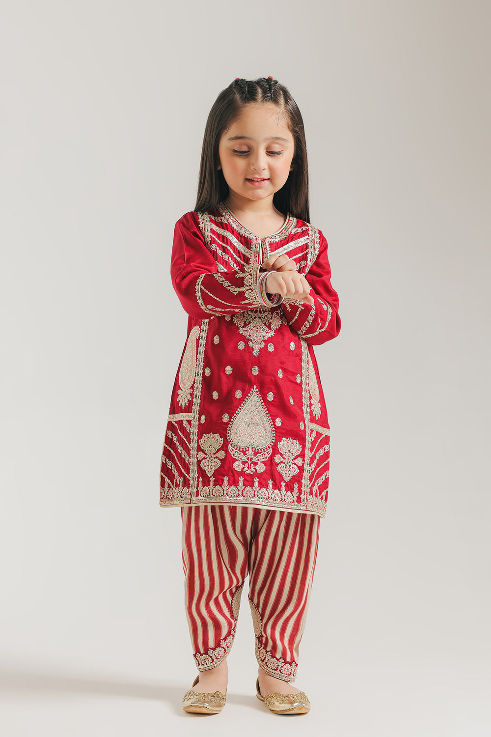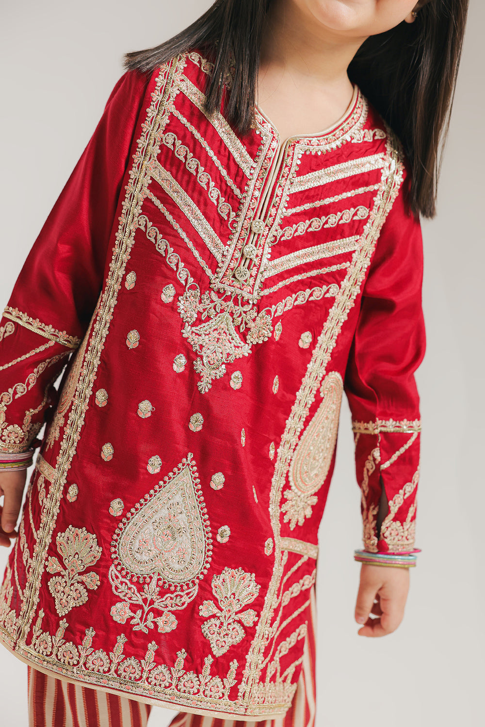 Dress your little star in this radiant two-piece embroidered suit, designed to capture the joyful essence of every celebration. The vibrant red shirt features a sophisticated split neckline and is richly adorned with intricate silver-toned embroidery that forms elegant floral and geometric patterns across the bodice. A prominent central motif adds a touch of traditional luxury, while the sleeves and hemline are finished with matching ornate borders for a cohesive, high-fashion look. Balancing the bold top is the shalwar, featuring playful red and white vertical stripes and delicate embroidery at the ankles, offering a modern twist on a classic silhouette. Crafted for comfort without compromising on style, this ensemble is the ultimate choice for making lasting festive memories.
